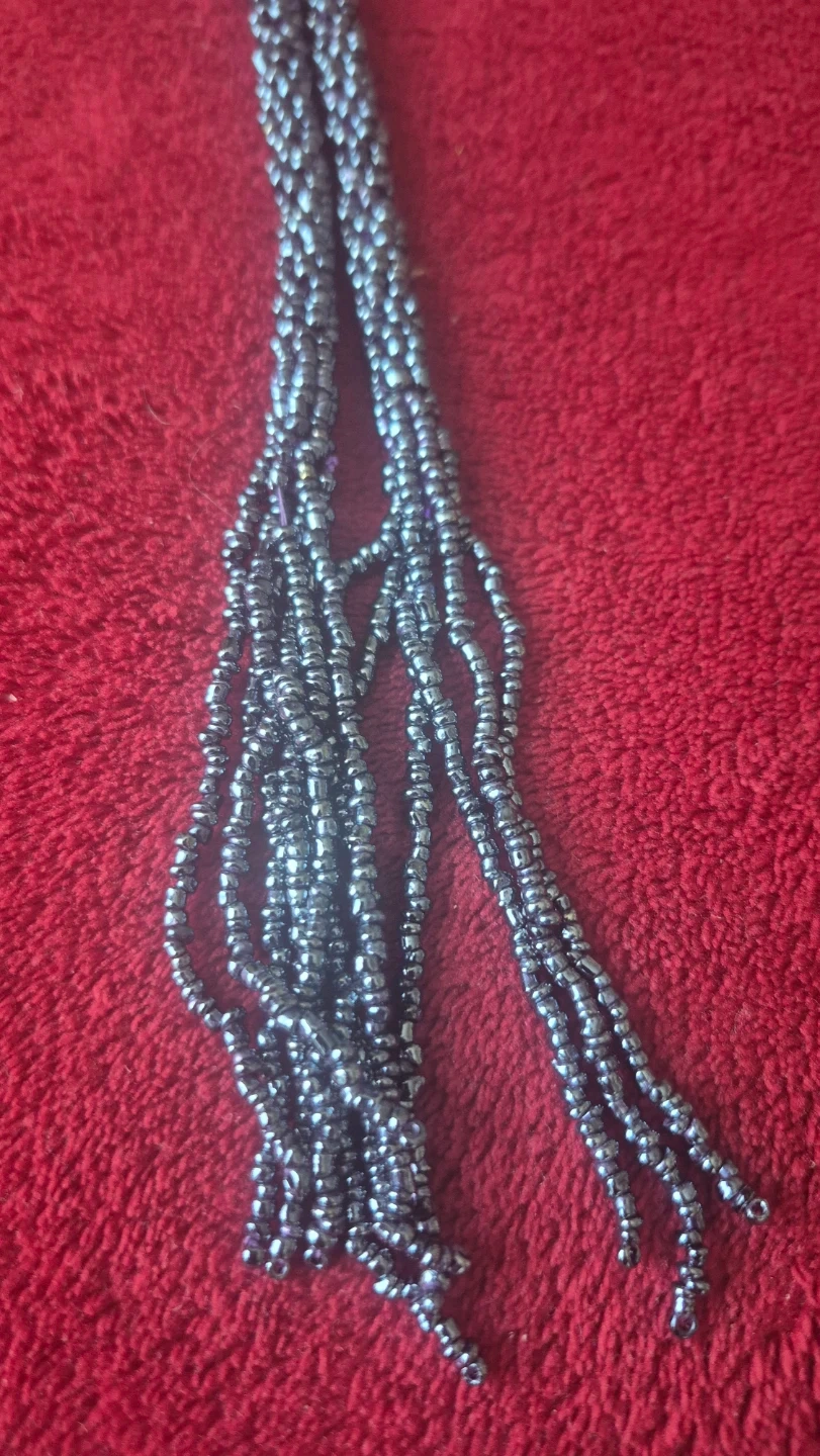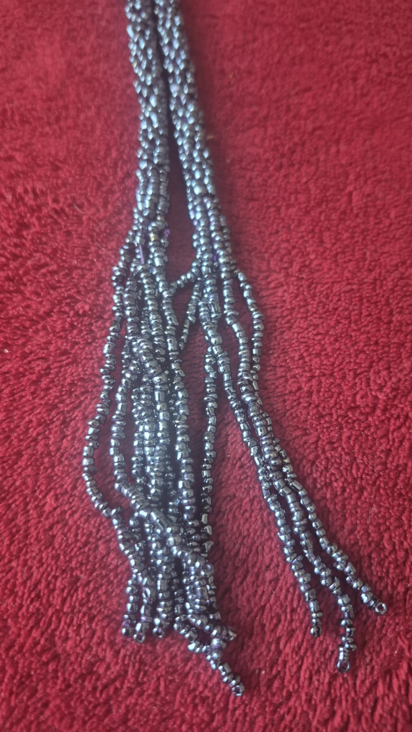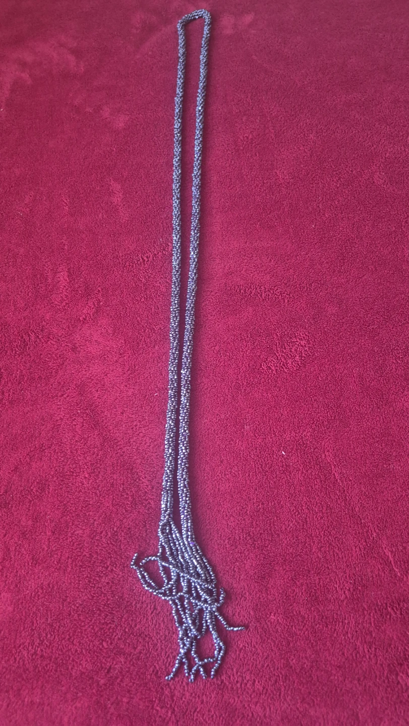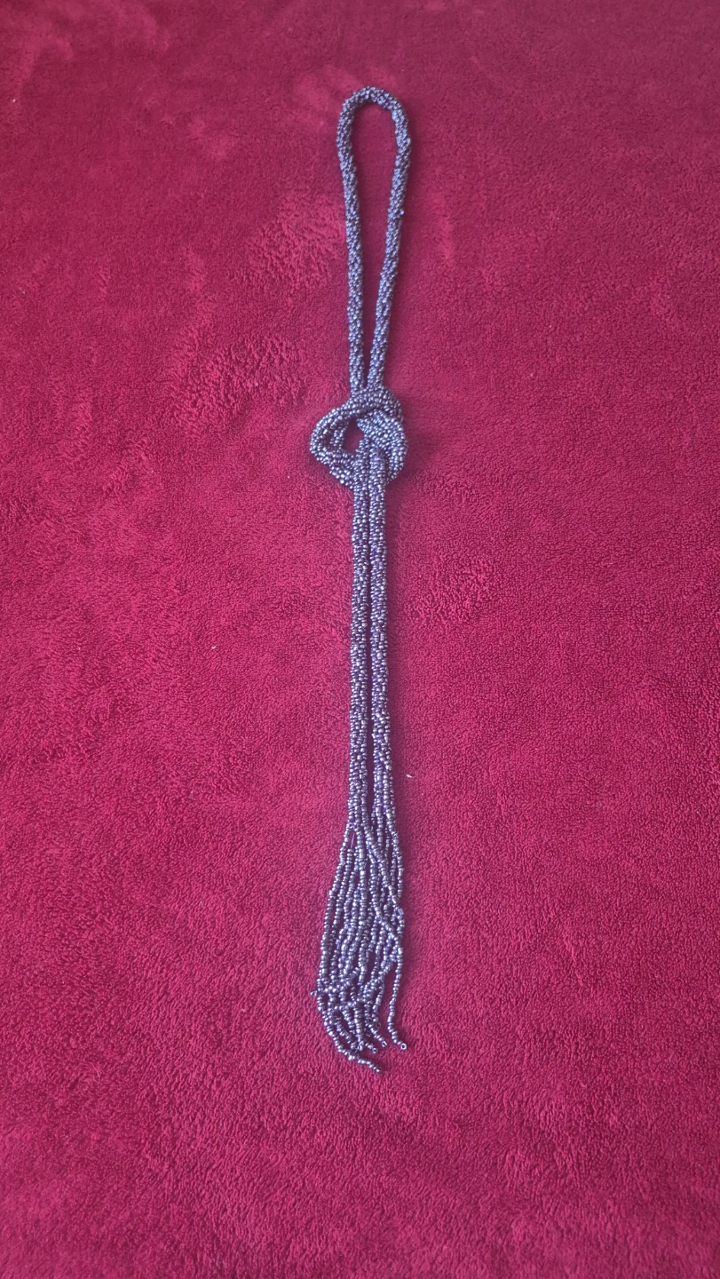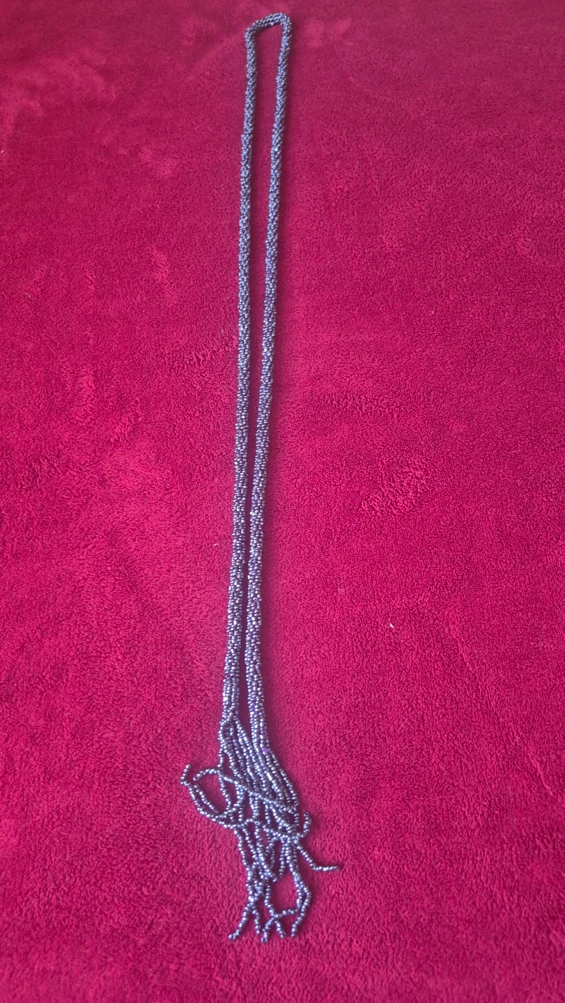 Selling a beaded necklace in a grey colour. It's in great condition and would make a lovely addition to any outfit! Can also be use as a belt..its actually quite beautiful.