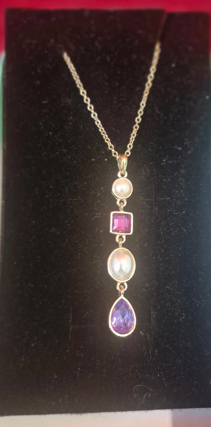 This is a beautiful pendant necklace featuring pearls and gemstones. The pendant has a unique design with a teardrop-shaped purple gemstone at the bottom, followed by a pearl, a square pink gemstone, and another pearl at the top. The chain is a delicate gold tone colour. It's a lovely piece to add to your jewellery collection!