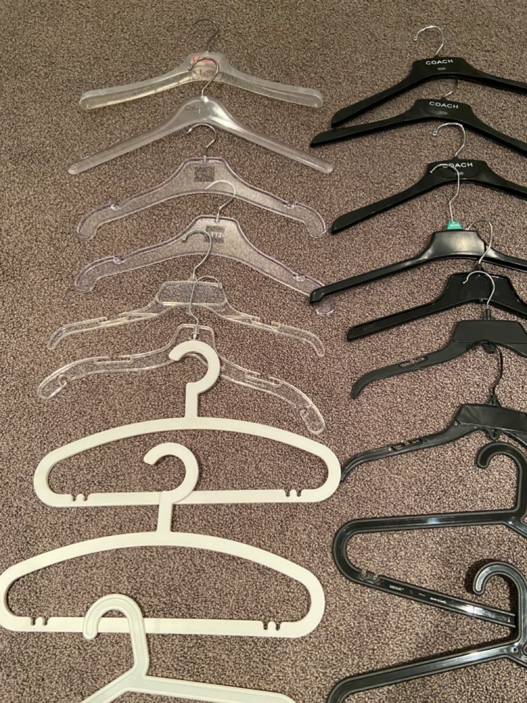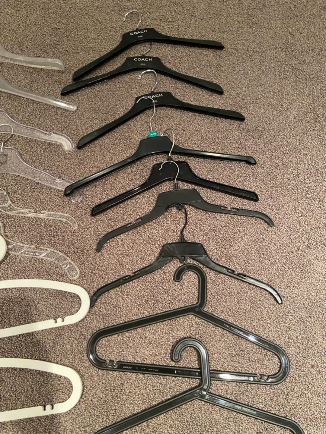Selling a mixed lot of clothes hangers! There are several Coach hangers in black, along with other hangers in clear, white, and tan. Great for organizing your closet!