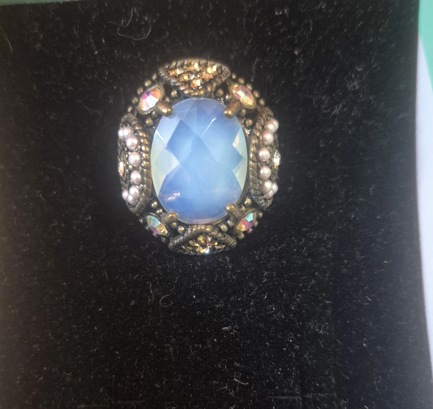 Here's a lovely vintage-style ring! It features a beautiful blue moon stone surrounded by ornate detailing and small pearl-like accents. It's a unique piece that would add a touch of elegance to any outfit