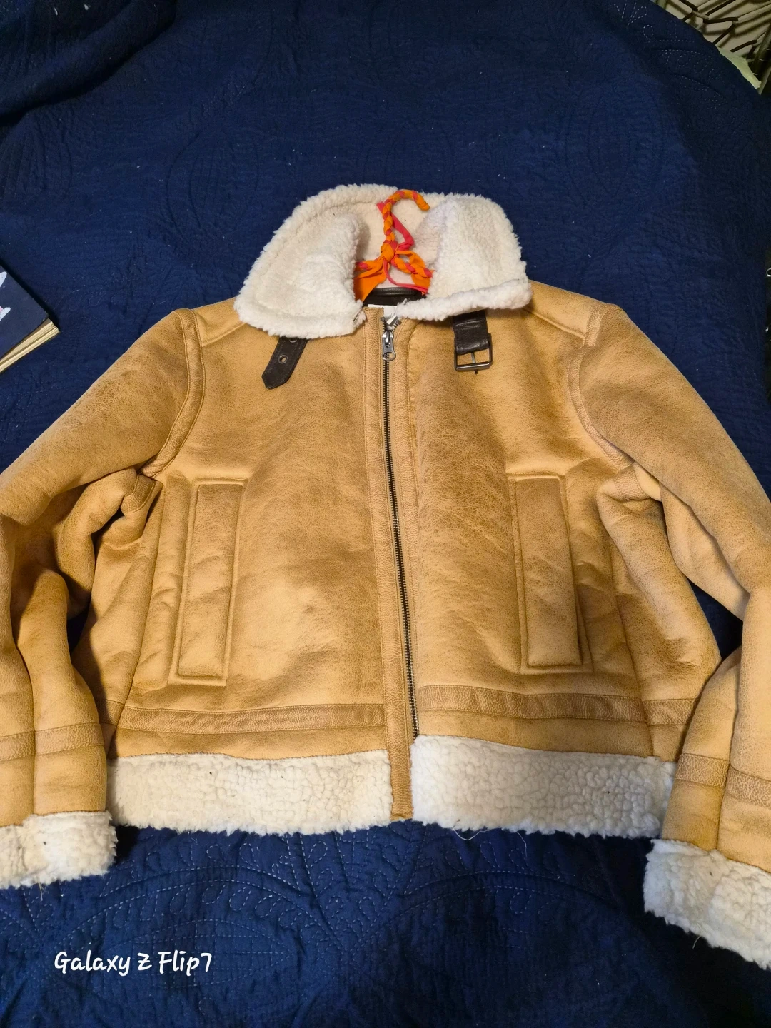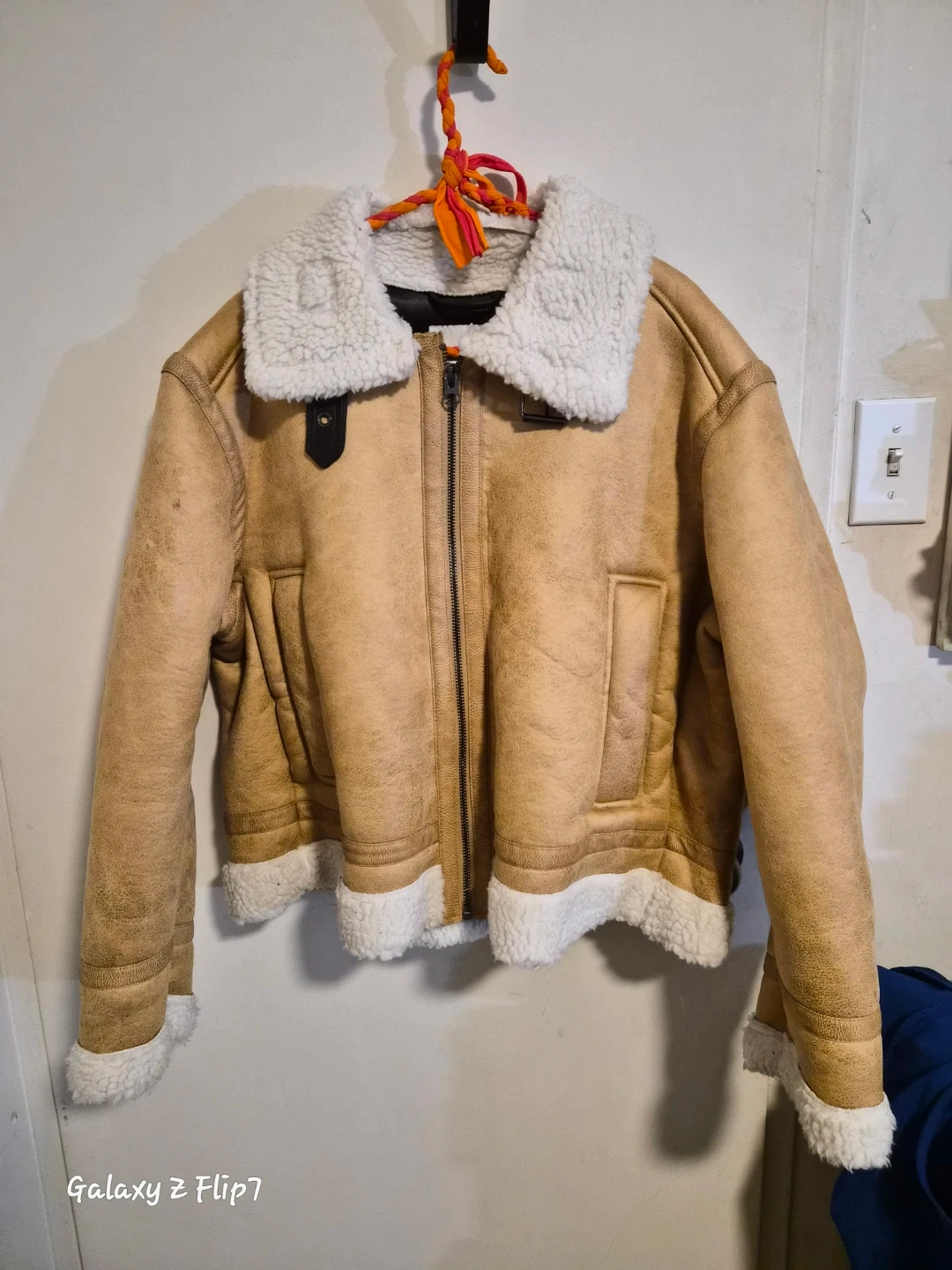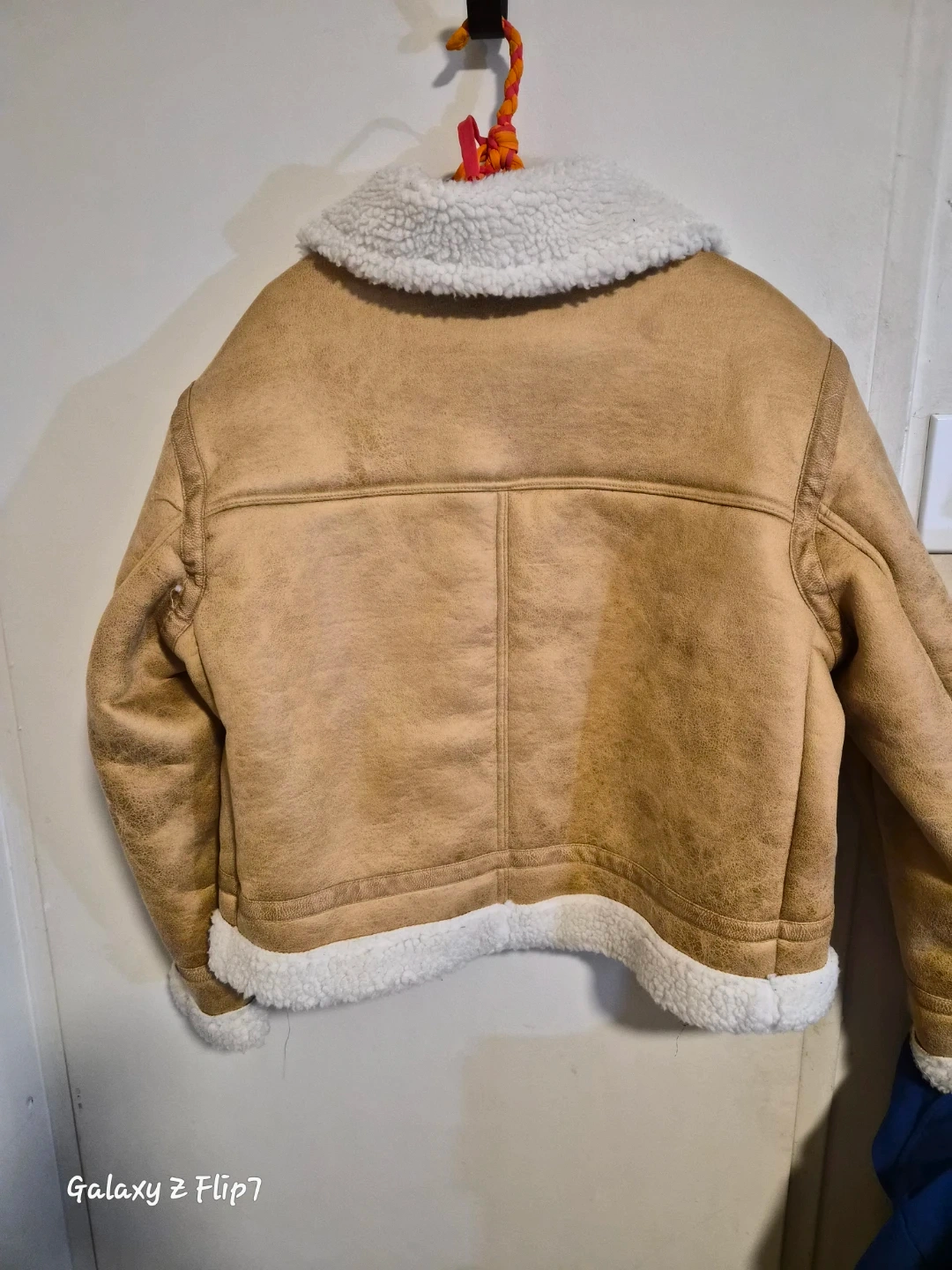 Cozy tan aviator jacket with a faux suede exterior and a soft, fluffy white interior lining! Perfect for adding a stylish and warm layer to your outfit during cooler weather