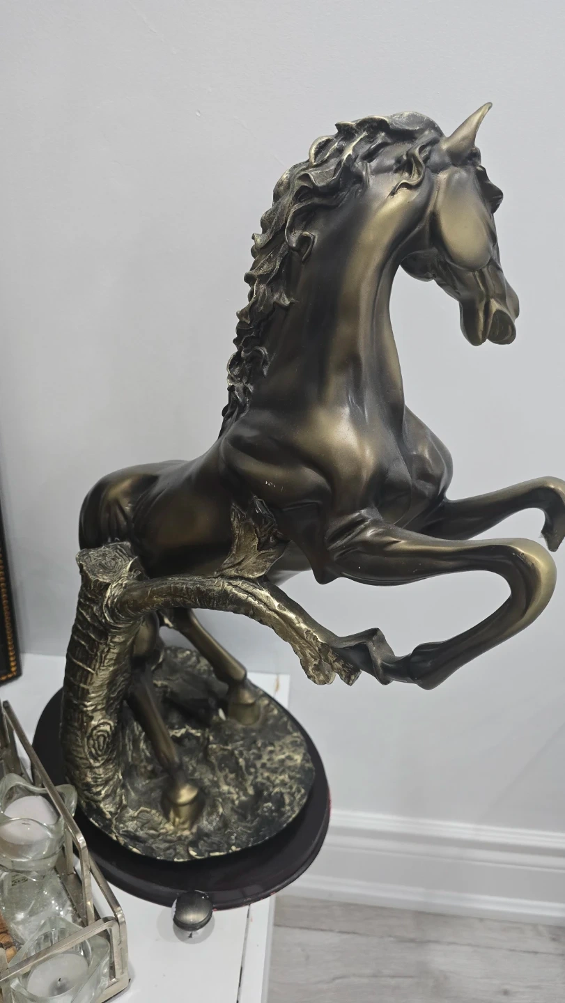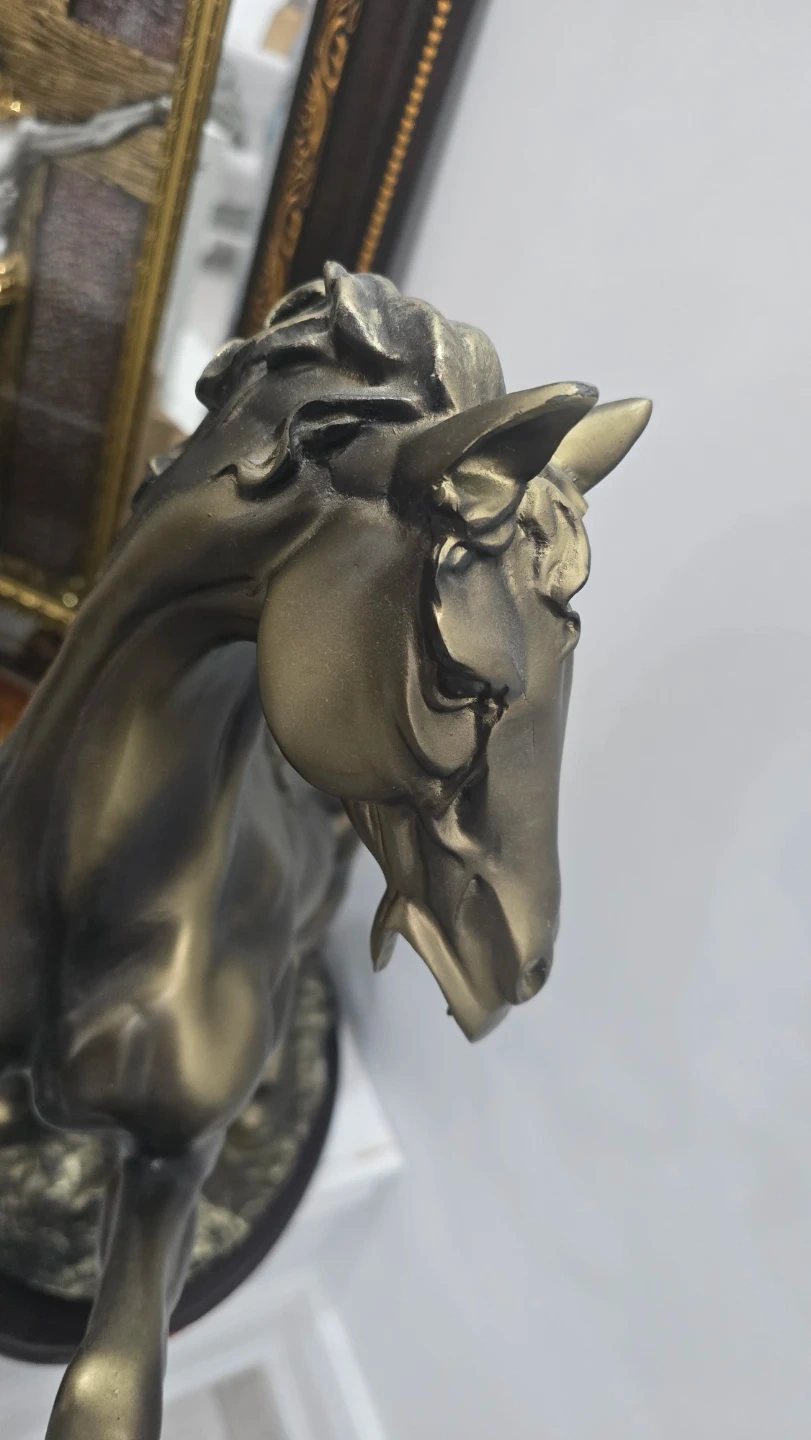 Here's a beautiful horse sculpture that would look great in any home! It has a lovely bronze colour and is in great condition