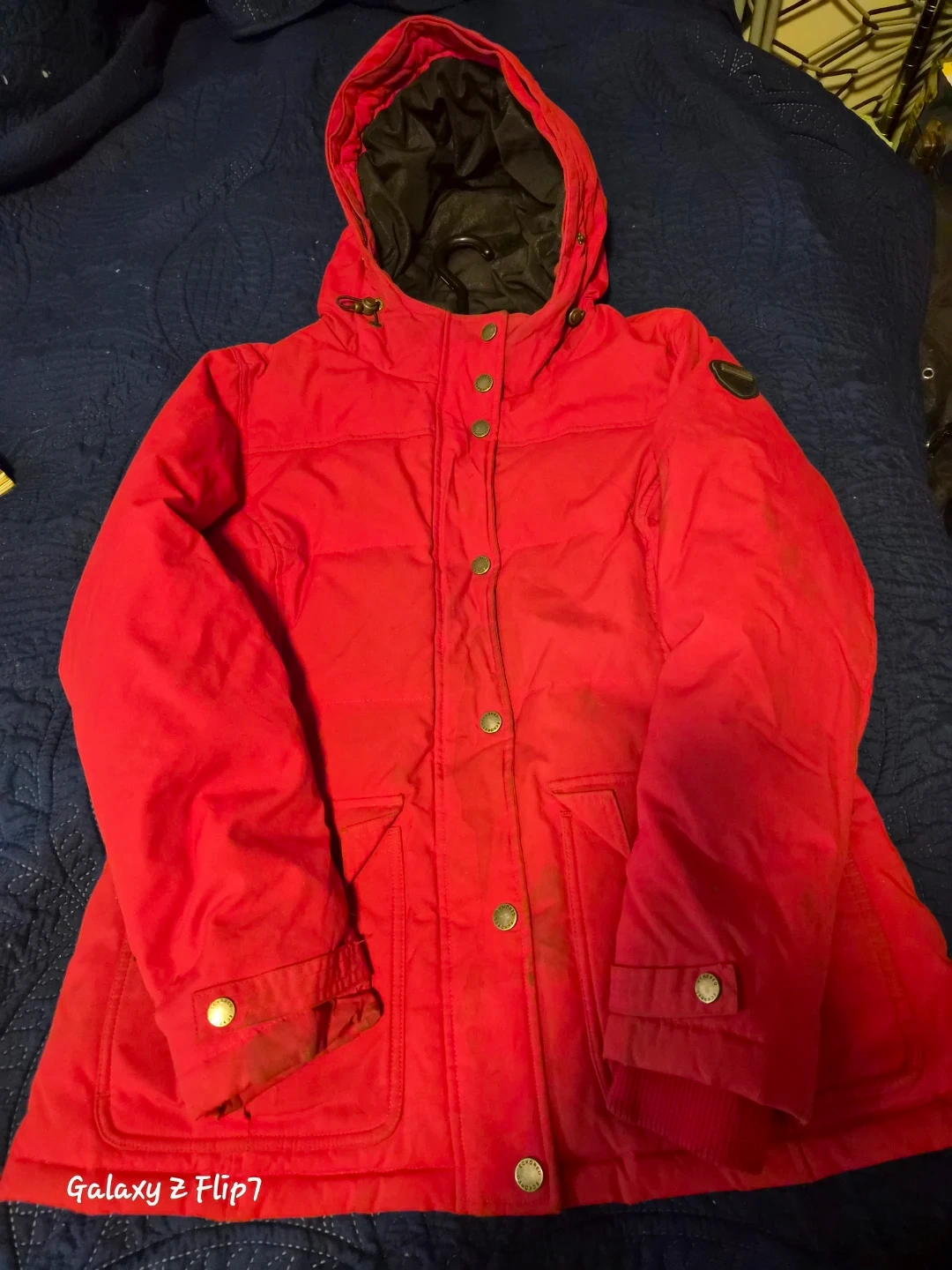 Donating a red winter coat with a hood. It has a button closure and pockets. It's in good condition!