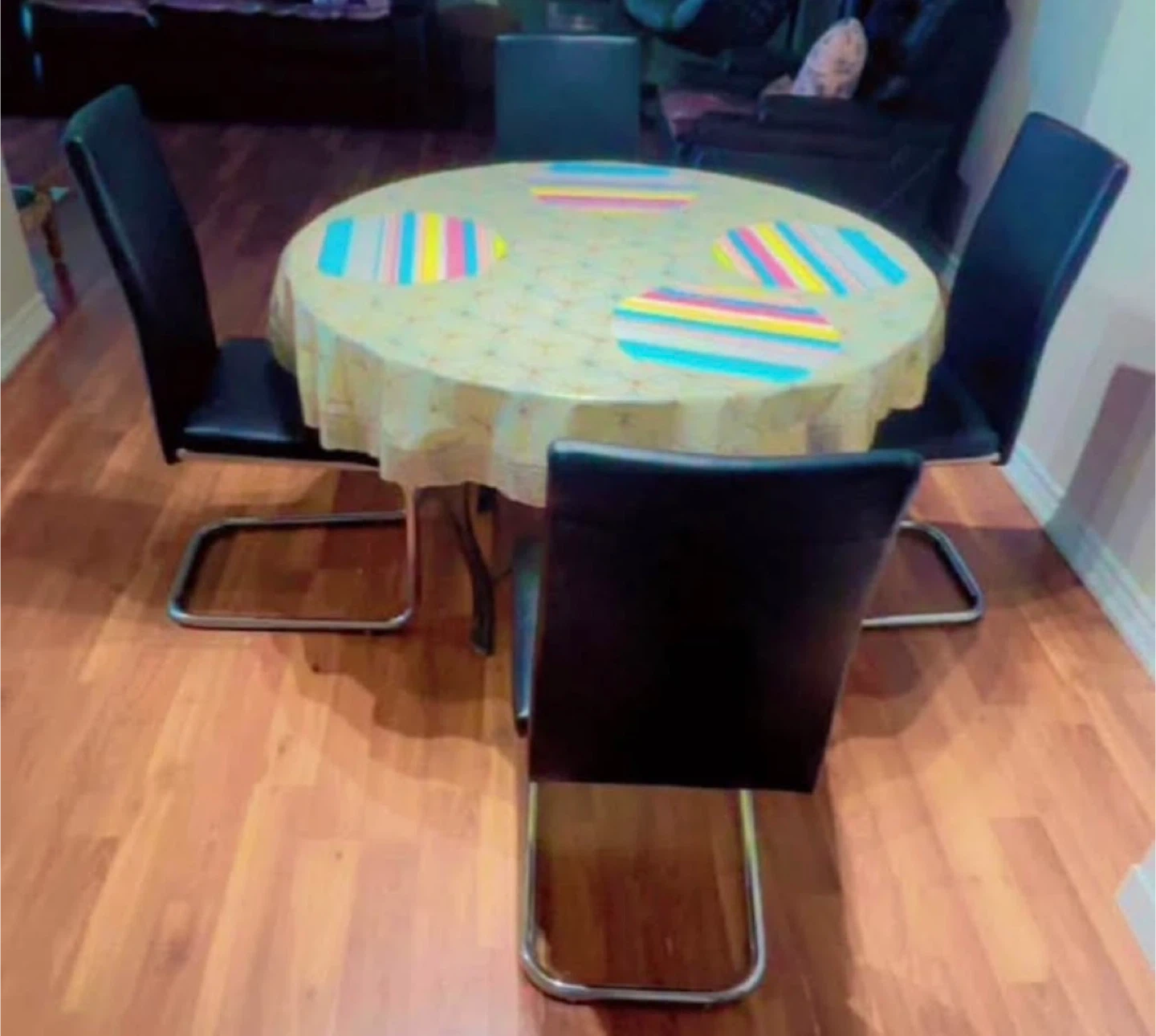 Selling a round glass dining table with four matching chairs. The chairs have a sleek, modern design with black seats and chrome frames. Perfect for a small dining area or kitchen!