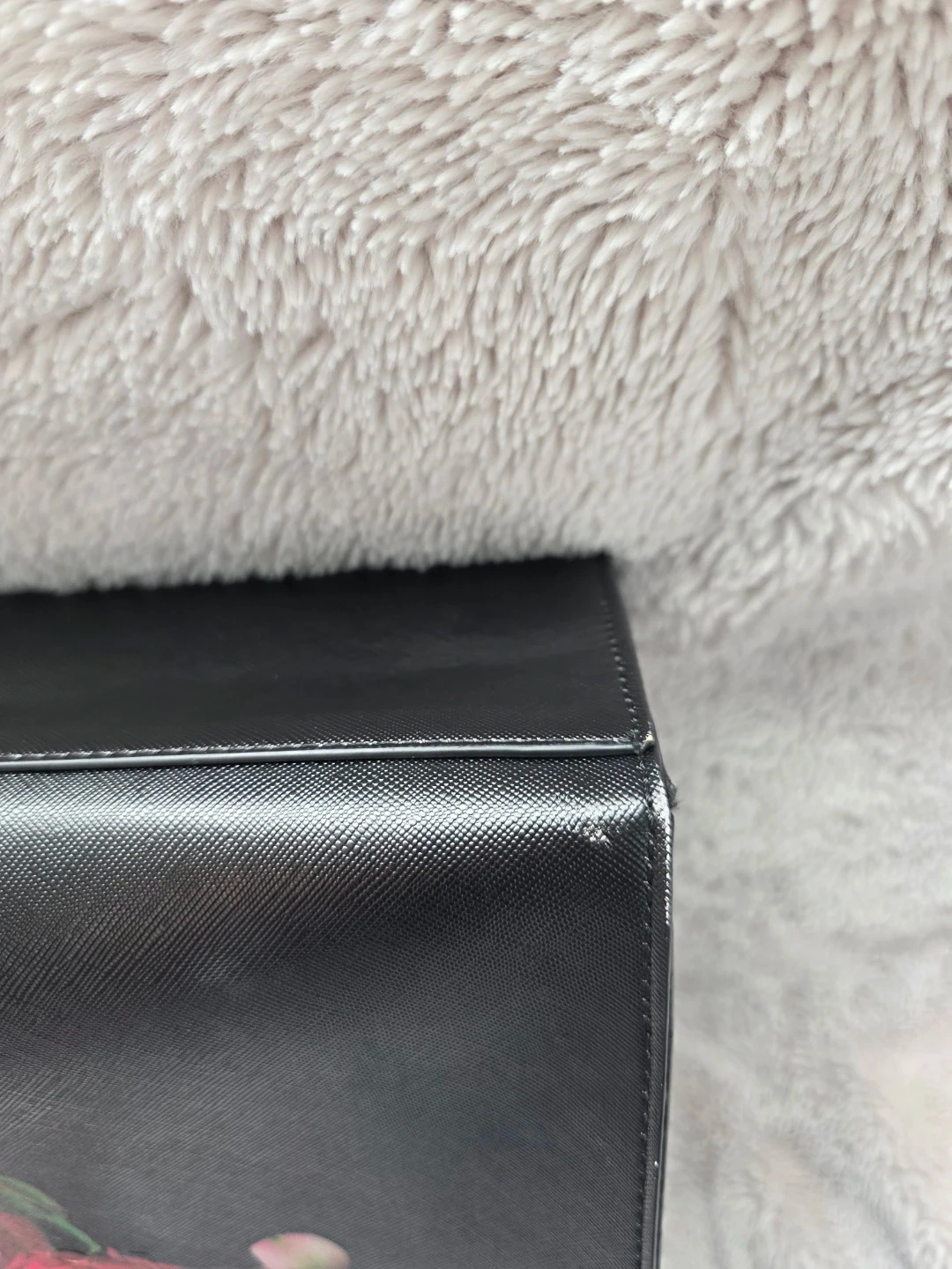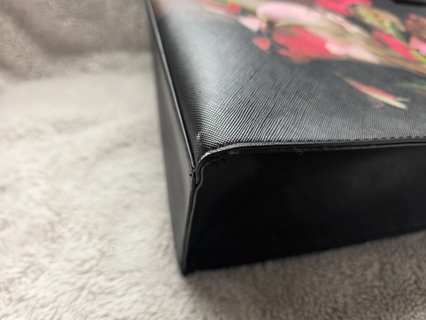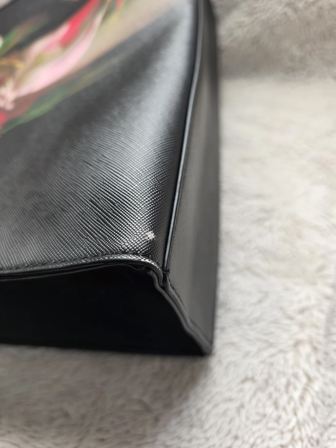 Please review pictures - some small wear at the corners of the bag bottom. Other than that, almost in new condition.