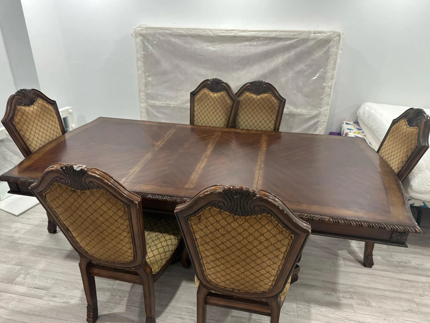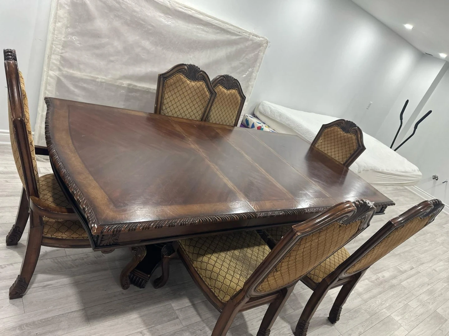 Selling a dining table with six chairs. The table has a dark wood finish with decorative detailing. The chairs are upholstered with a patterned fabric and have carved wooden frames. It's a beautiful set that would look great in any dining room. The table can be smaller by removing the middle 2 pieces of woods