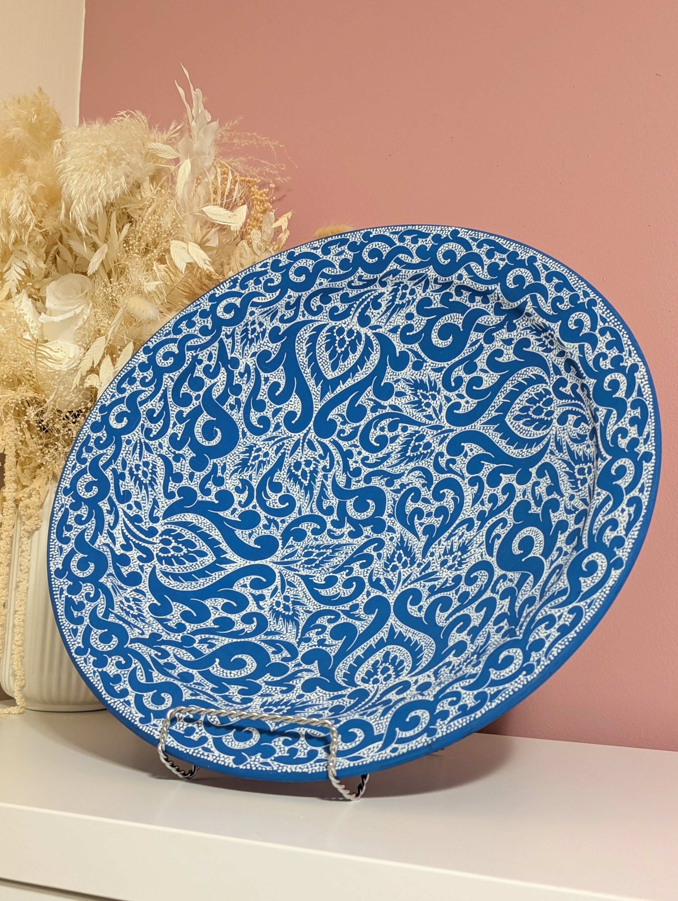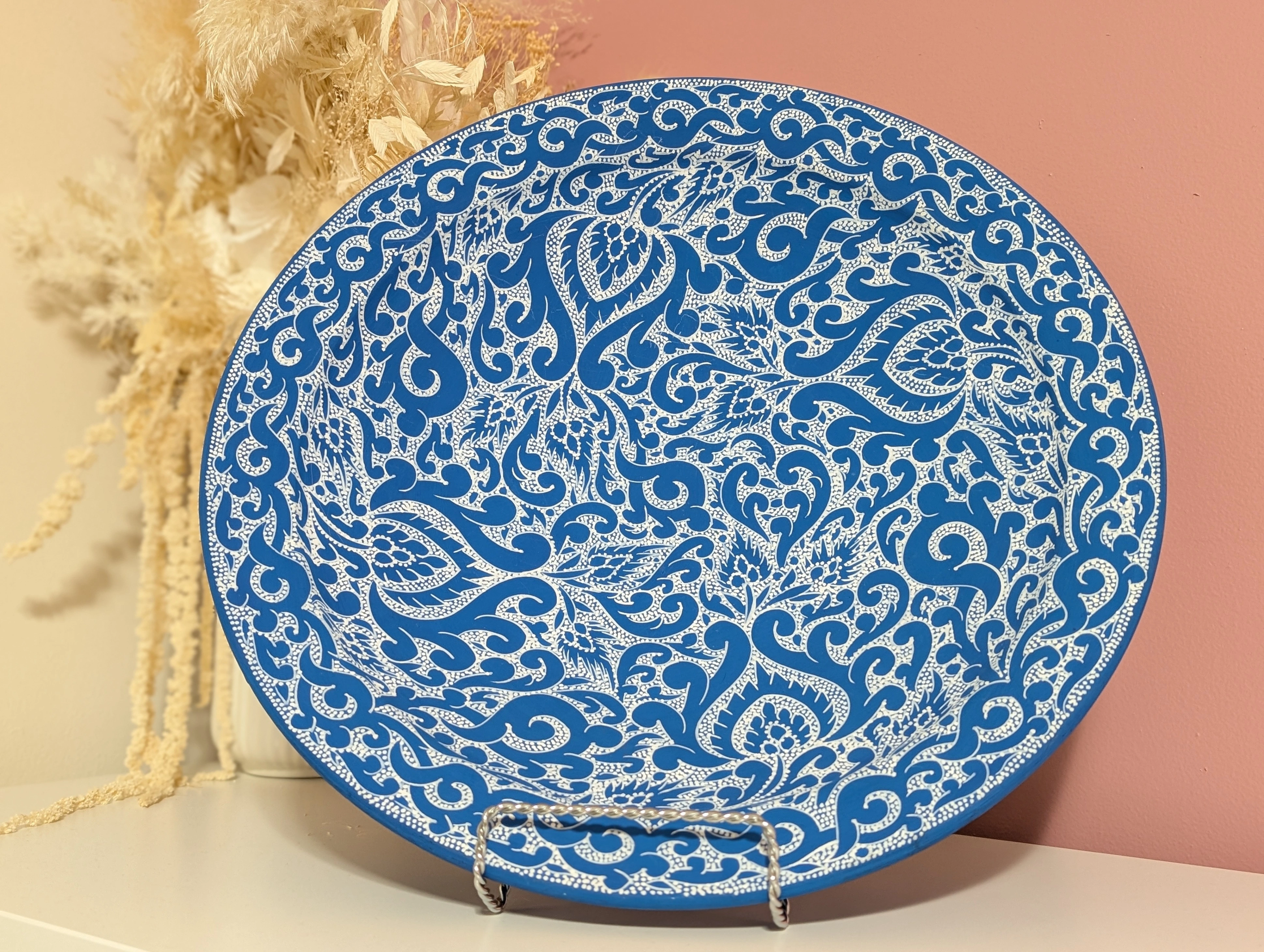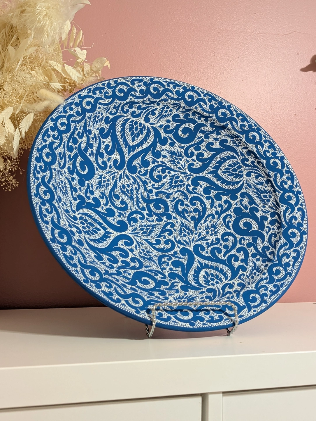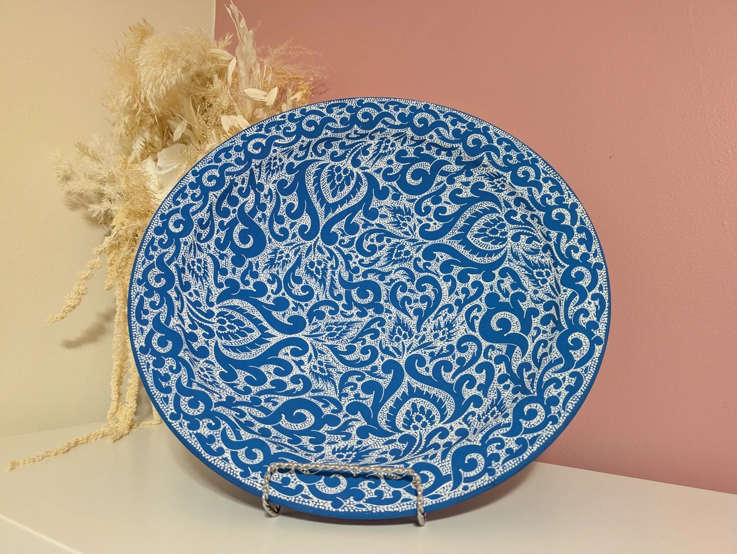 Selling a decorative plate with a beautiful blue and white pattern! It would look great as a centrepiece, on a shelf, or on a wall. I bought this when I was in Morocco.