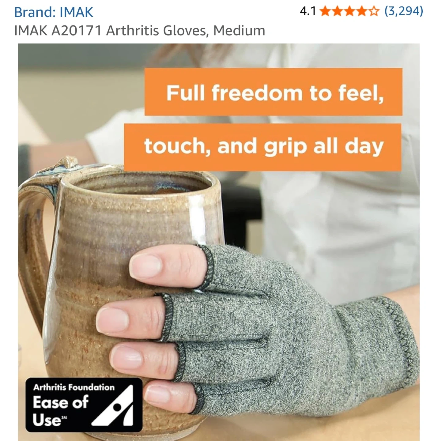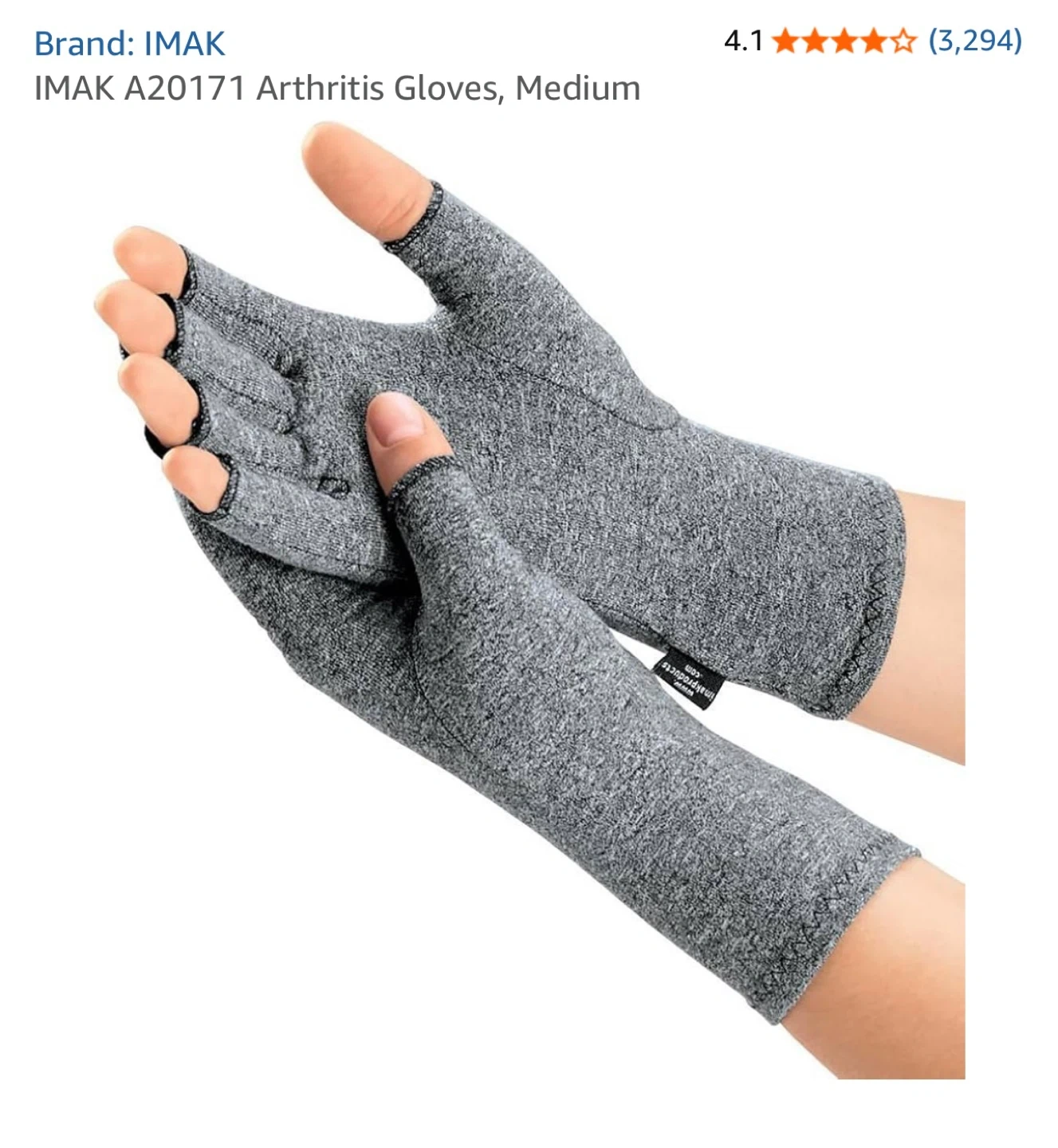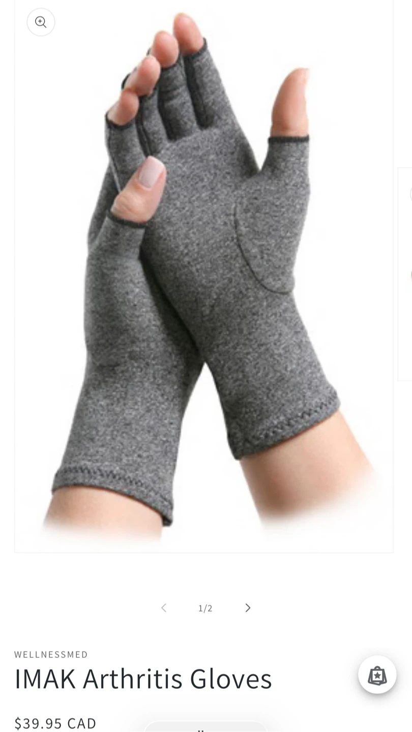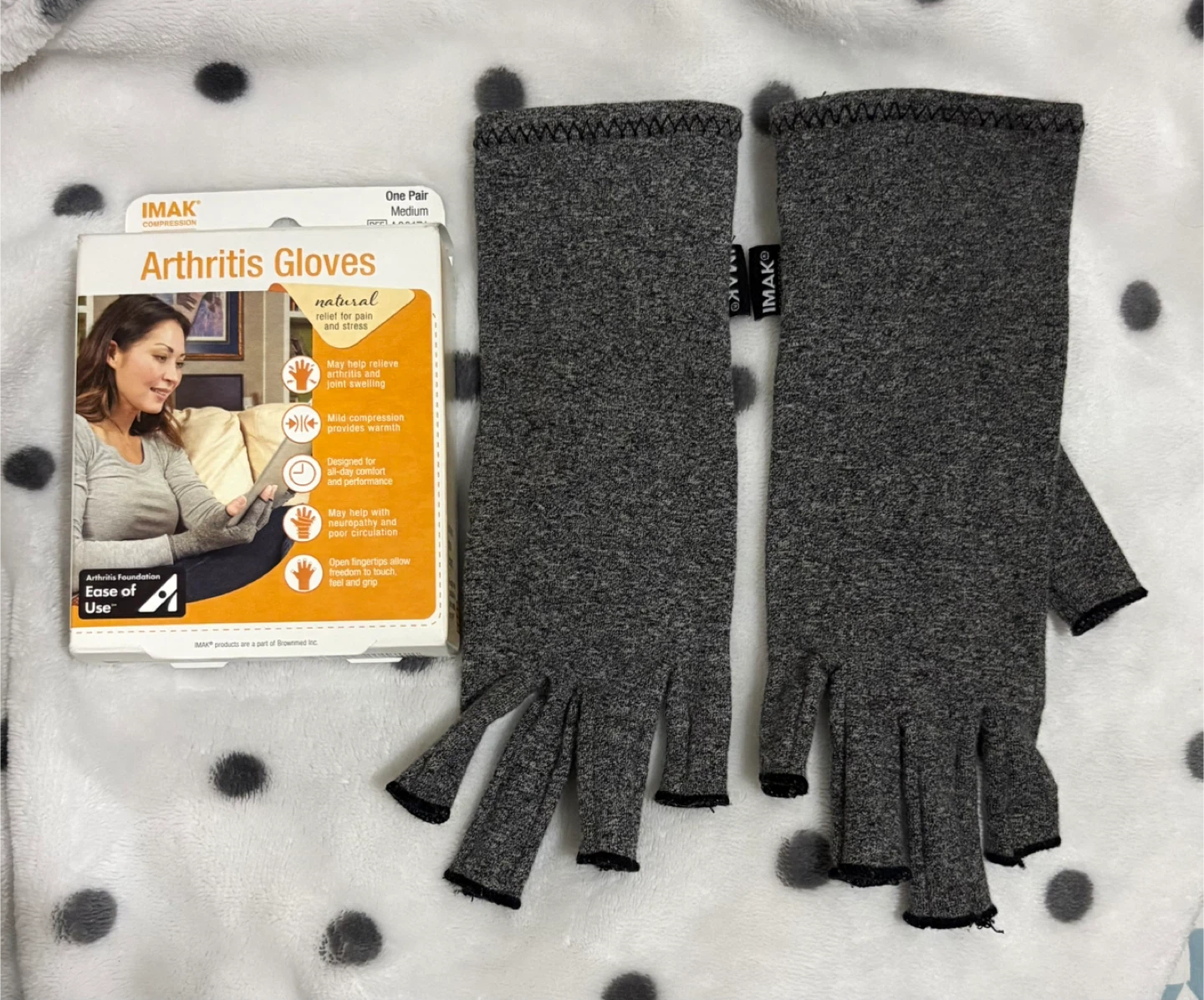 I'm selling a pair of IMAK Arthritis Gloves in size medium. They are designed to provide warmth and mild compression, which may help relieve joint swelling and pain. They also allow for full freedom to feel, touch, and grip throughout the day.