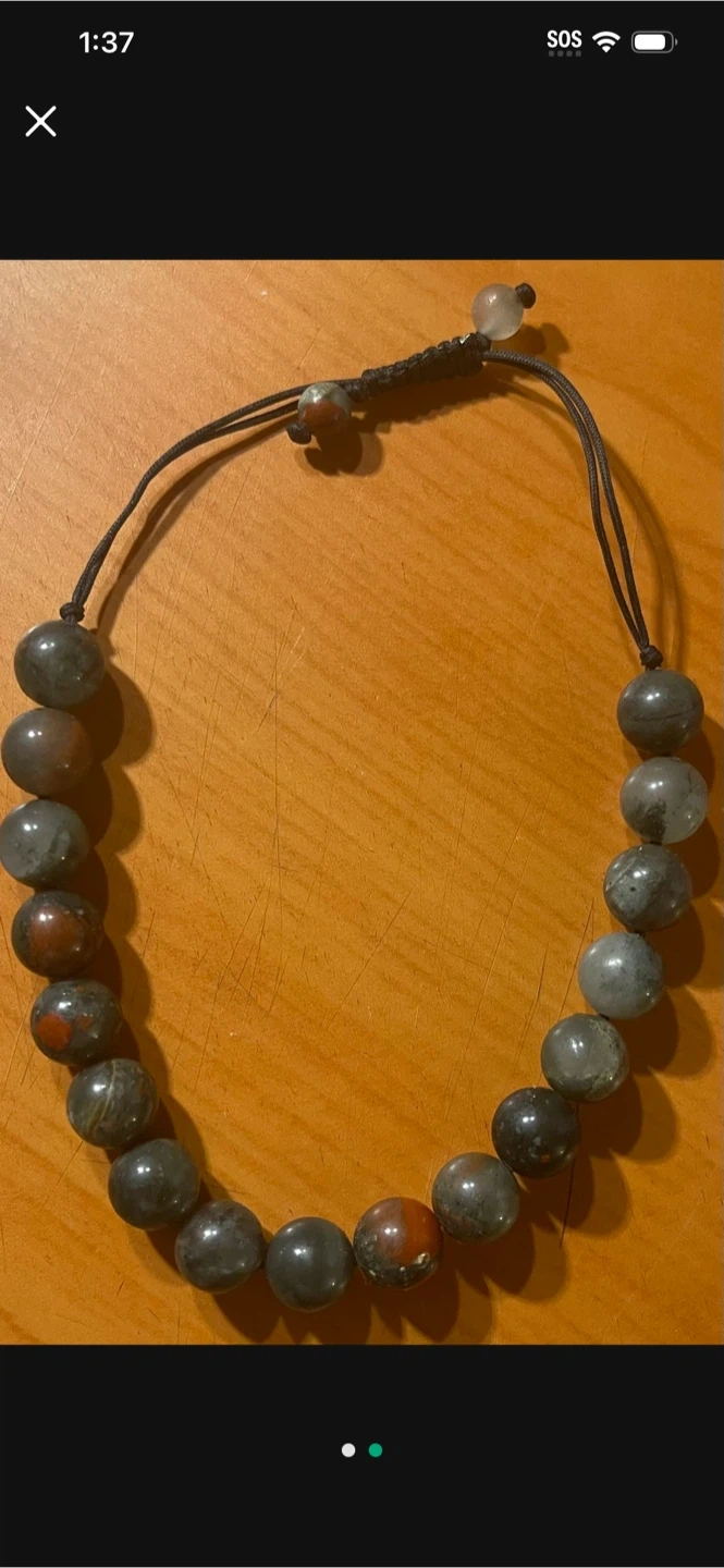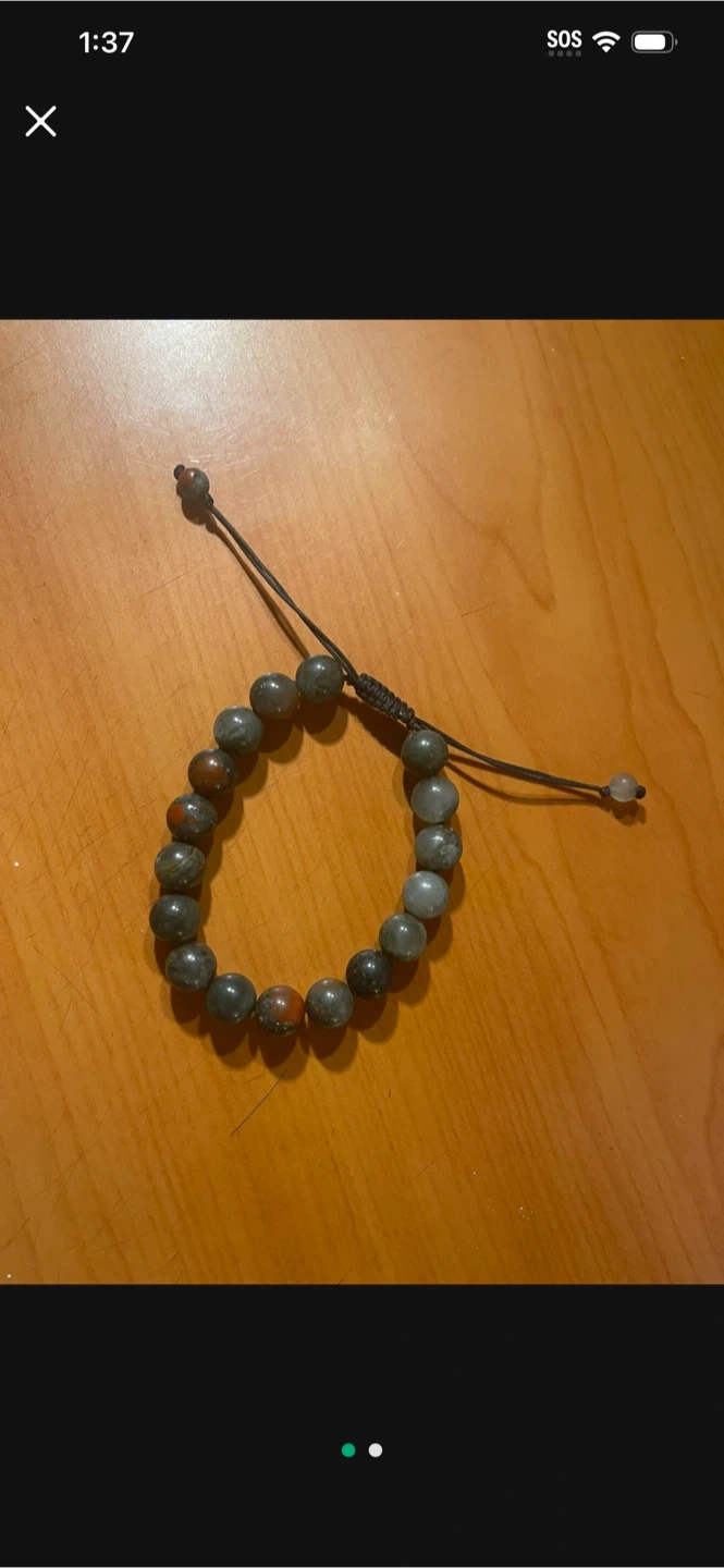 Here's a beaded bracelet with an adjustable string! It's in great condition and ready for a new owner! The beads are a mix of gray, black, and reddish-brown colors, giving it a unique look