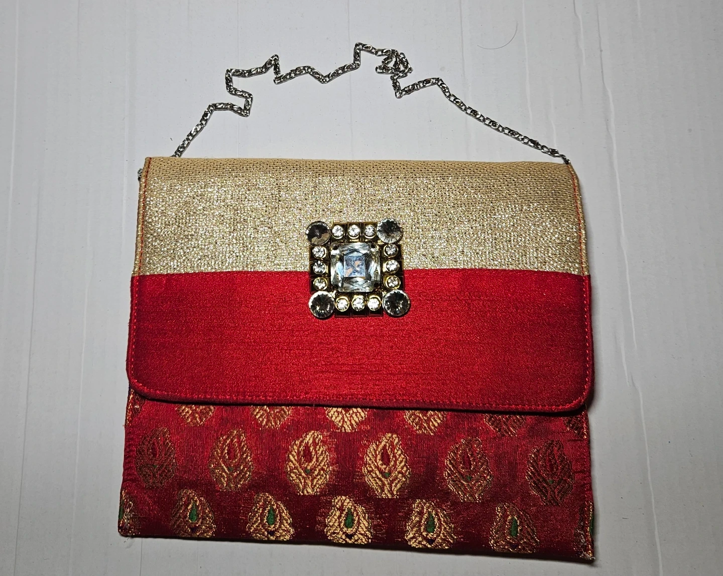 This is a beautiful clutch bag featuring a gold and red colour scheme with embellishments. It has a chain strap, perfect for evenings out or special occasions! It's in great condition and ready for a new owner