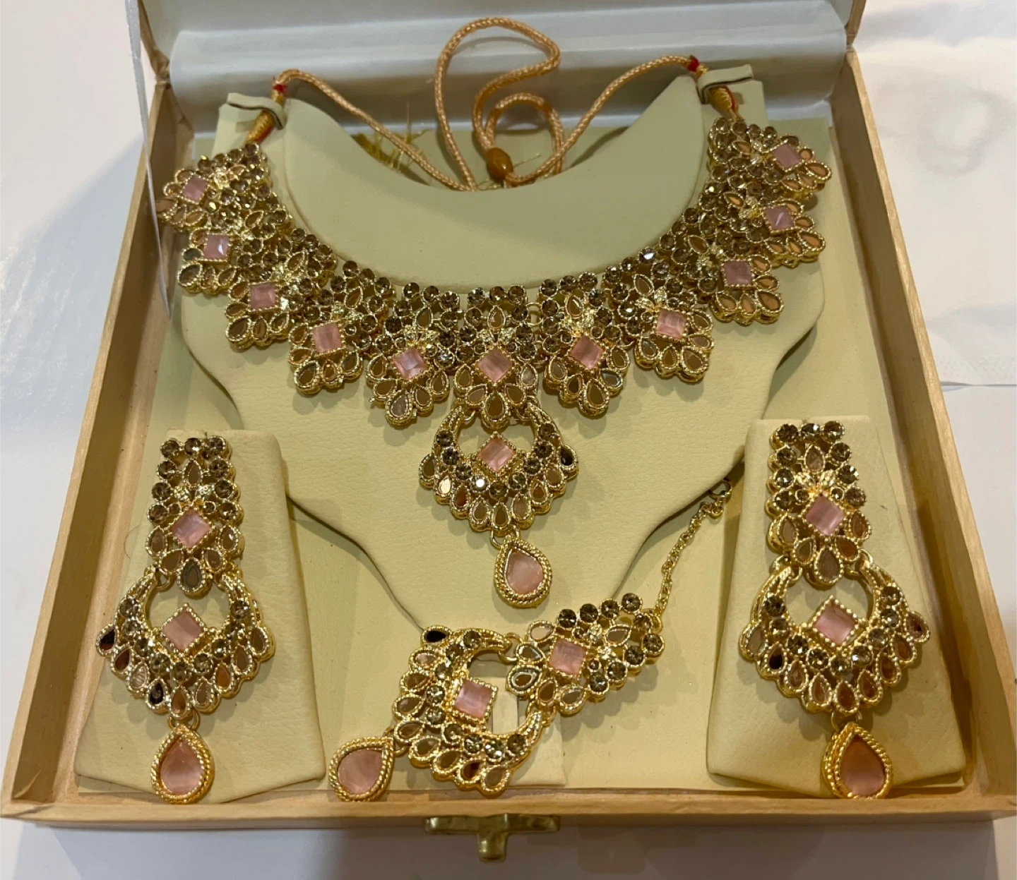Beautiful jewellery set with gold detailing and pink accents! This set comes with a necklace, earrings, and a Tikka. It’s Brand New. Soft pink and gold.