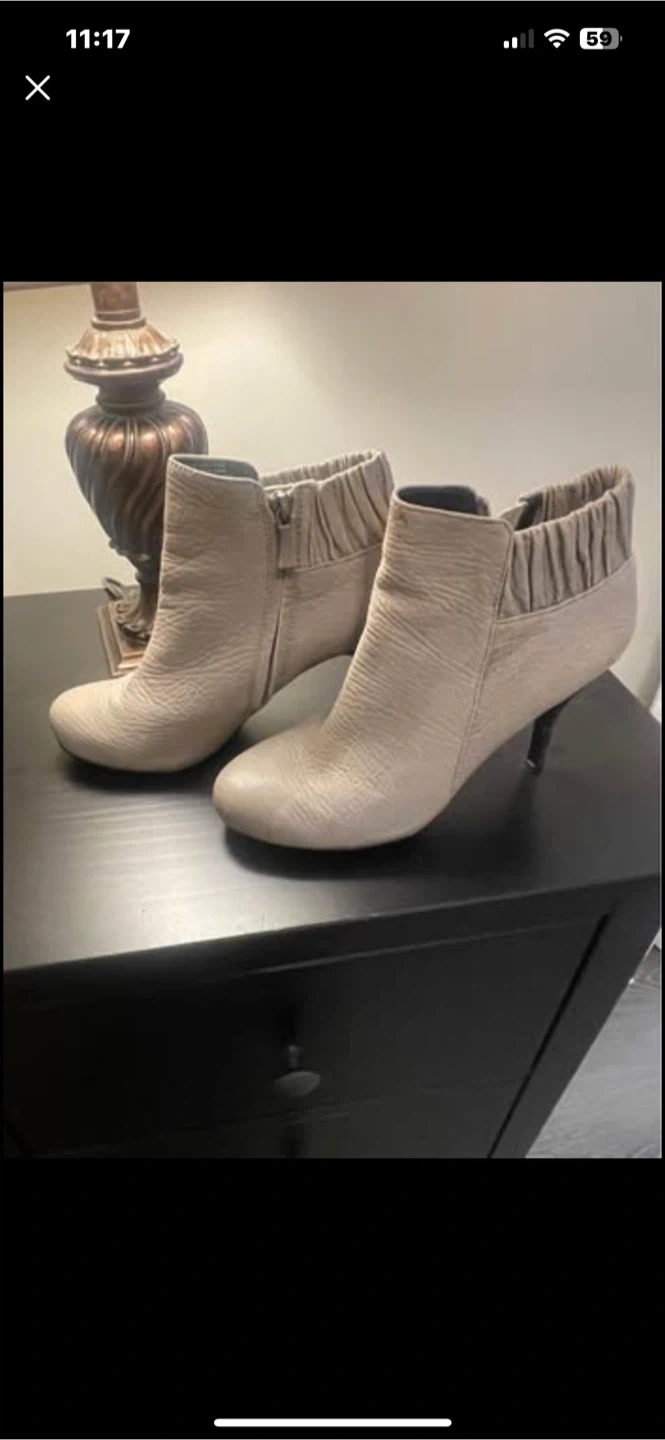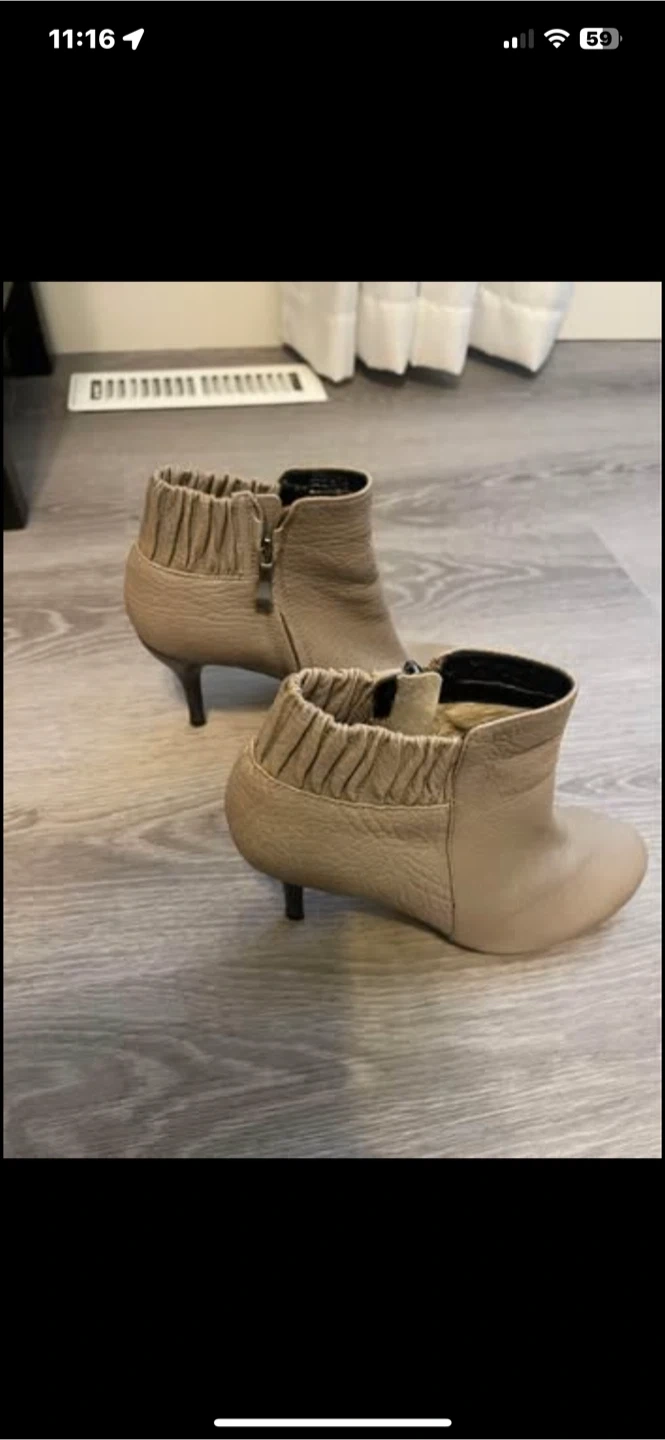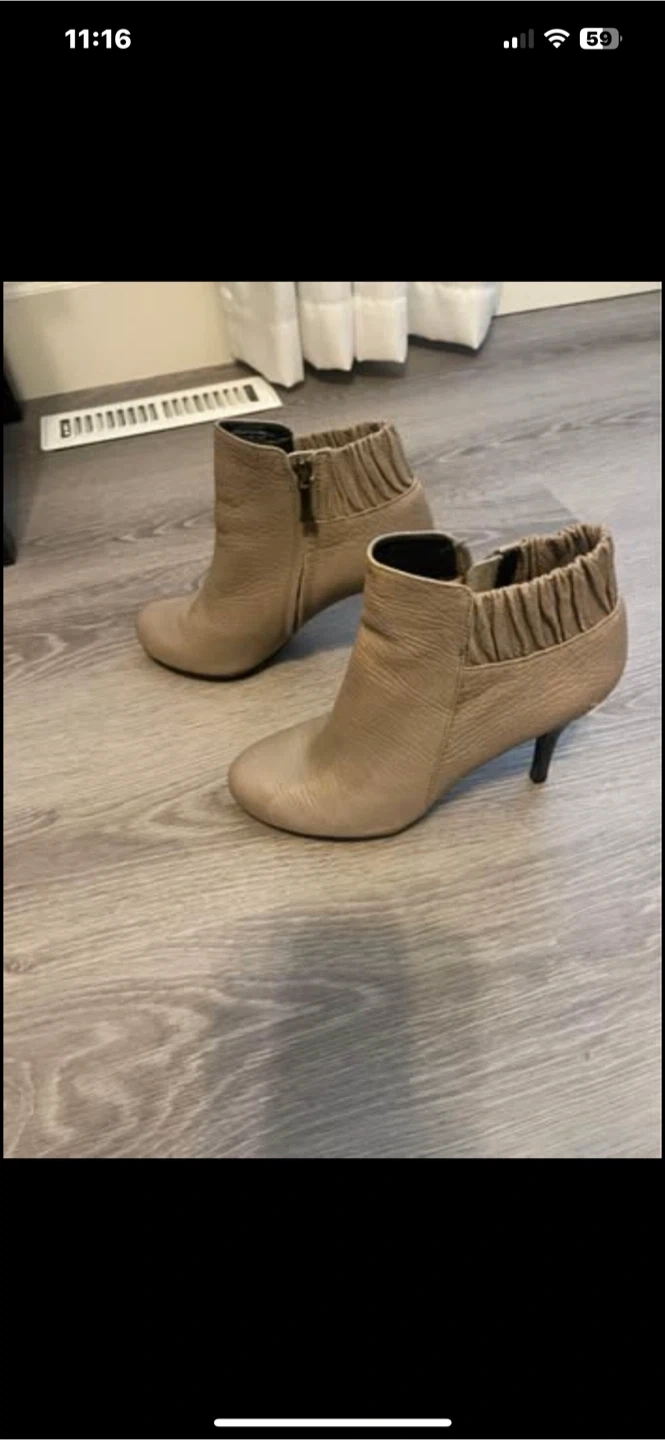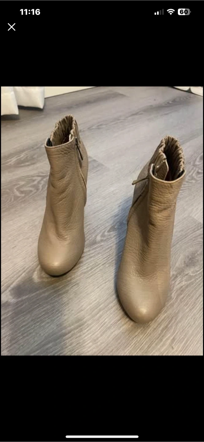 Selling a pair of beige ankle boots in size 7M. They feature a leather upper and a synthetic sole. Very elegant. These boots are in good condition and ready for a new home!