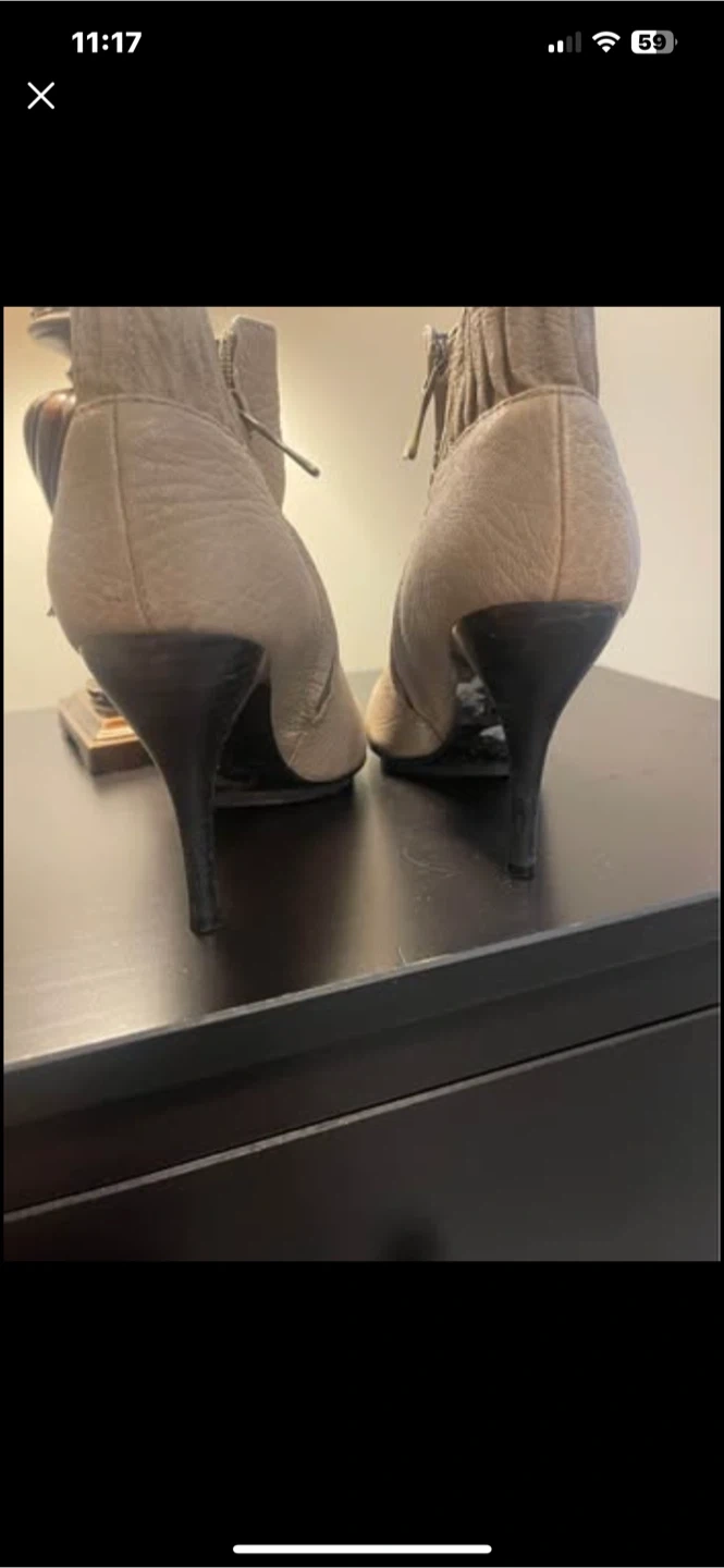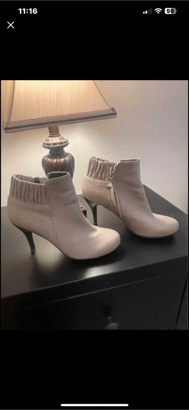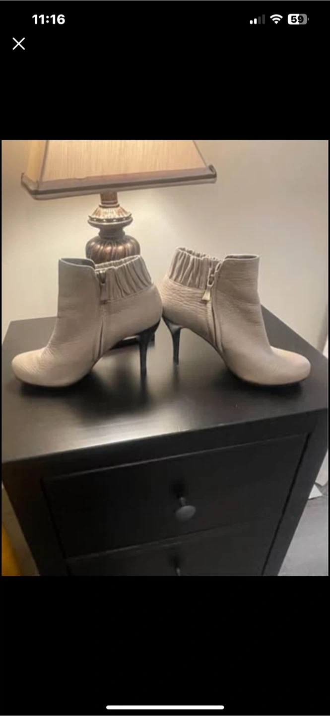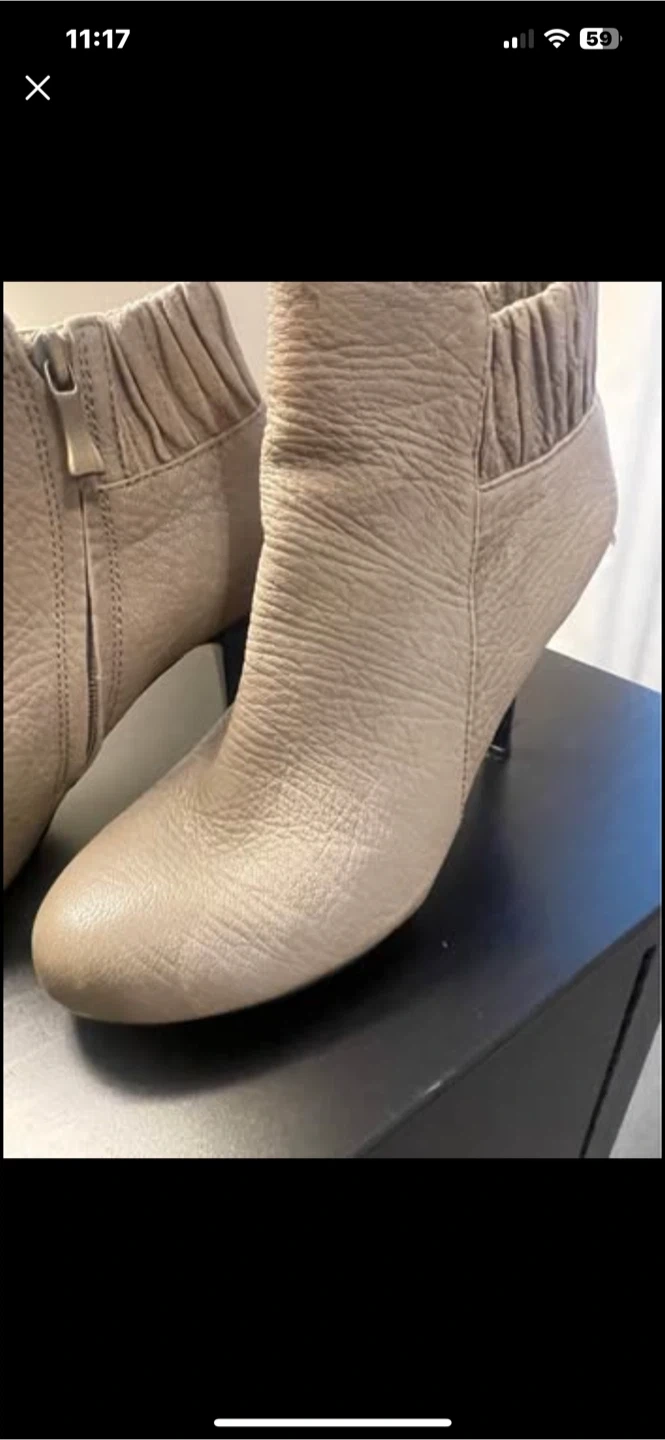 Selling a pair of beige ankle boots in size 7M. They feature a leather upper and a synthetic sole. Very elegant. These boots are in good condition and ready for a new home!