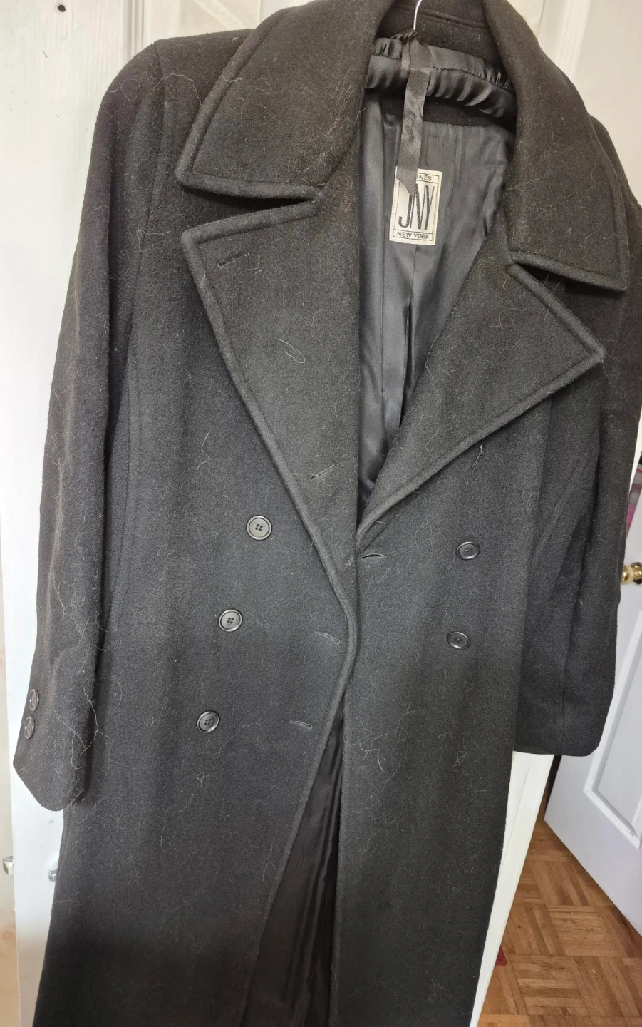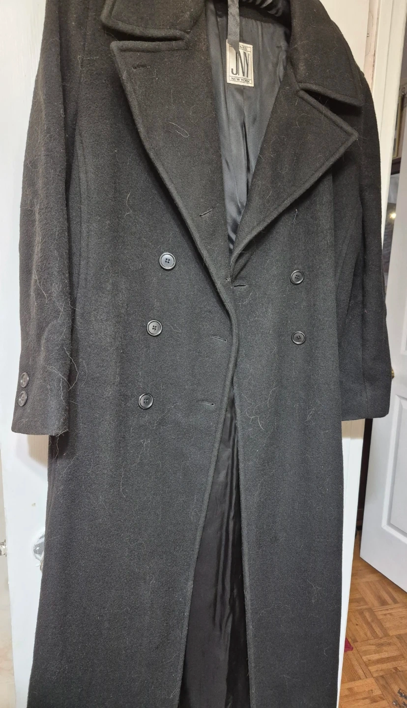 Selling a JNY Modern coat in black. It's a pure wool and has a classic double-breasted design. Perfect for staying warm this winter!
