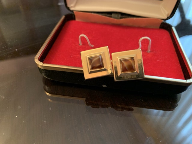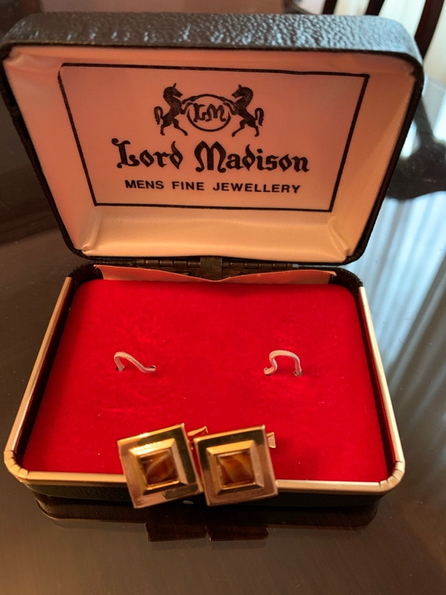Adorn your cuffs with these vintage Lord Madison cufflinks, showcasing a classic square design with a unique stone inset. These cufflinks are in good, pre-owned condition, with some wear commensurate with age. They come complete with their original Lord Madison box, adding to their collectible appeal. PU @ Winston Churchill Blvd & Burnhamthorpe Rd W in Mississauga