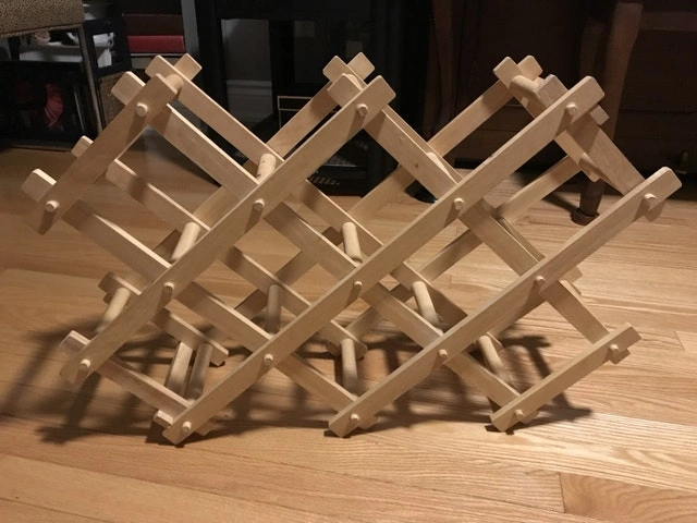 This is a wooden wine rack that expands and contracts for easy storage and variable bottle capacity. This compact and adaptable wine rack is in good condition and ready to display your favourite bottles of wine! When fully expanded it can hold up to 10 bottles of wine. 17”Hx26”Lx7”W. PU : Winston Churchill Blvd and Burnhamthorpe Rd W in Mississauga