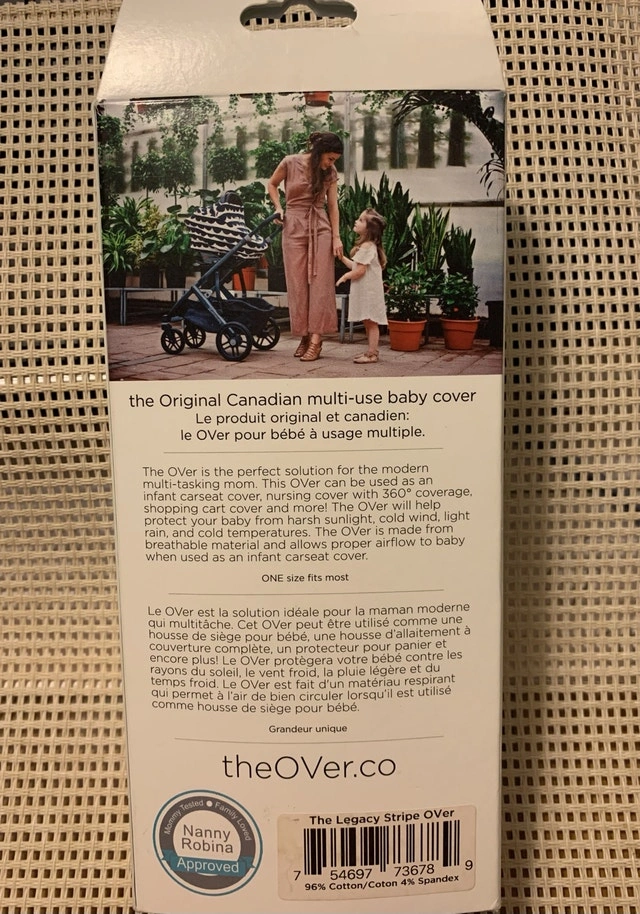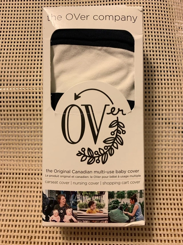 This is a new The OVer Company multi-use baby cover in the Legacy Stripe Over design, perfect for car seat, nursing, and shopping cart use. The cover is in excellent, new condition, still in its original packaging.