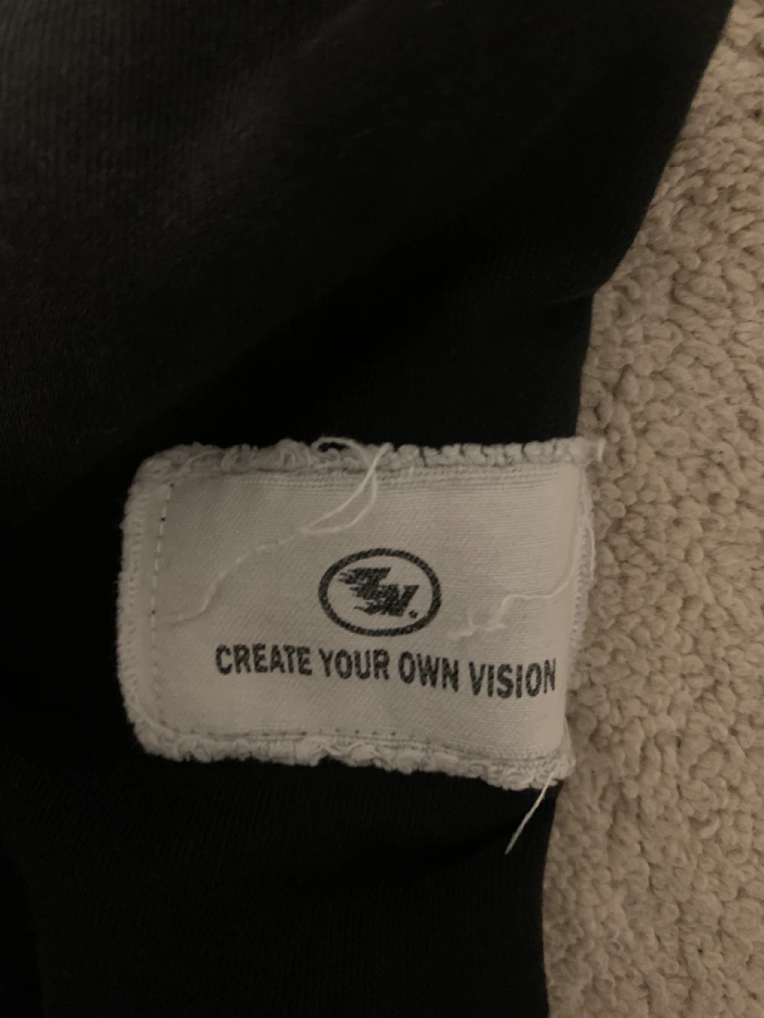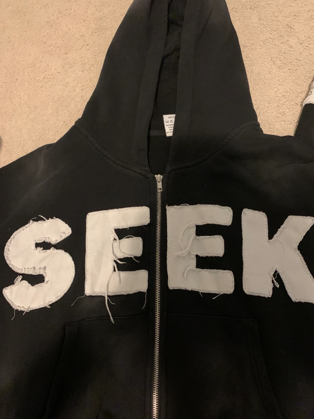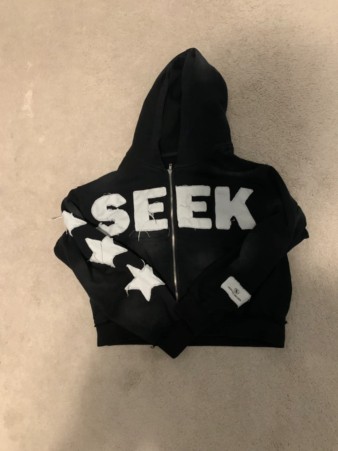 A unique design with white stars on the sleeves, “seek” on the front, and a “Create Your Own Vision” tag. It's in good condition and ready for a new owner!