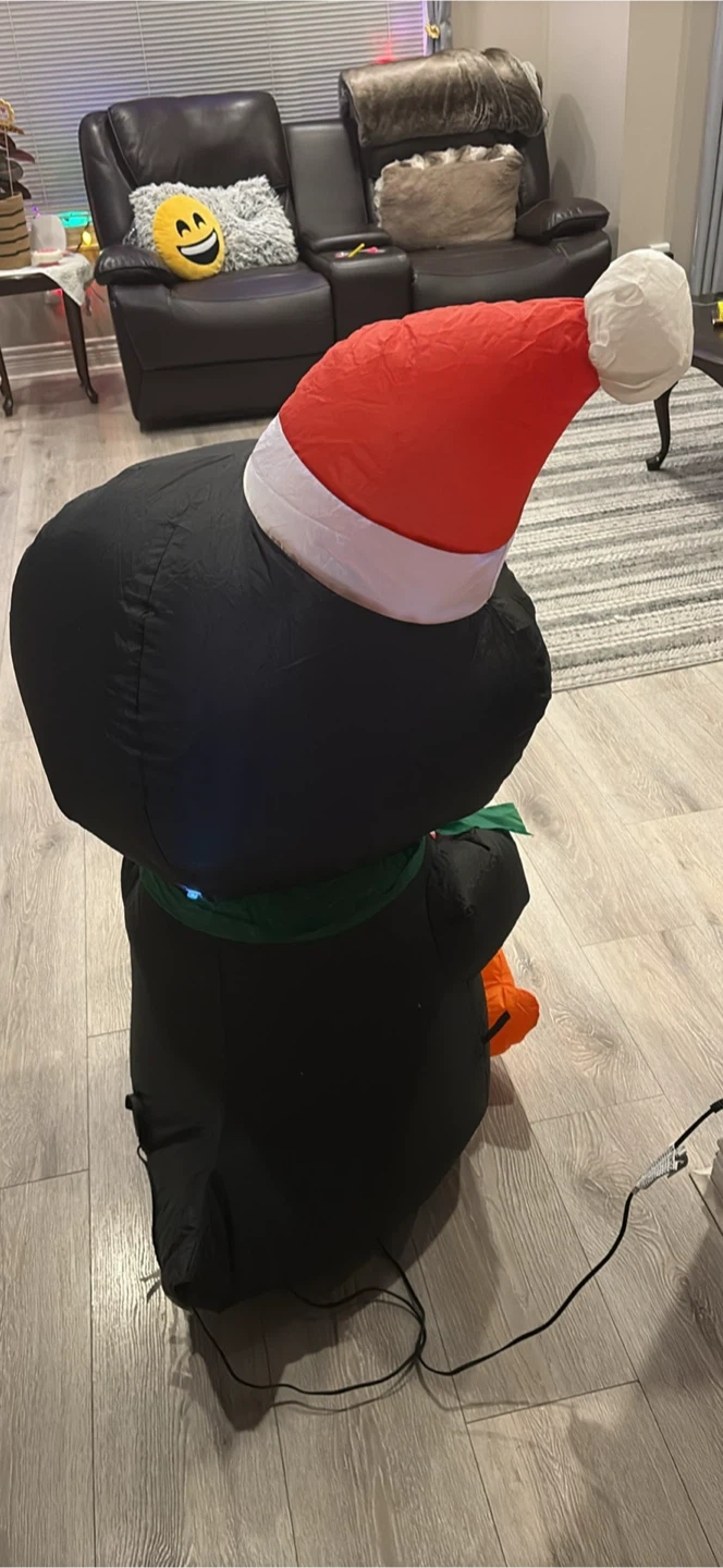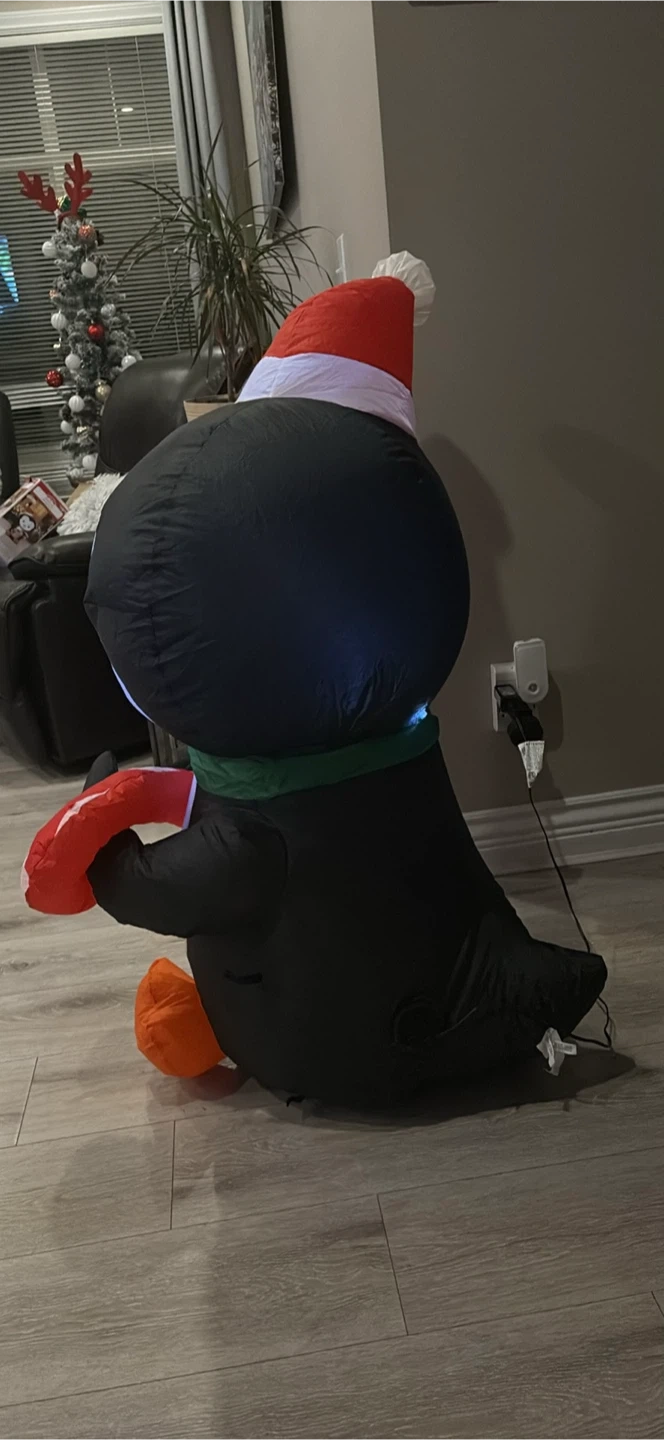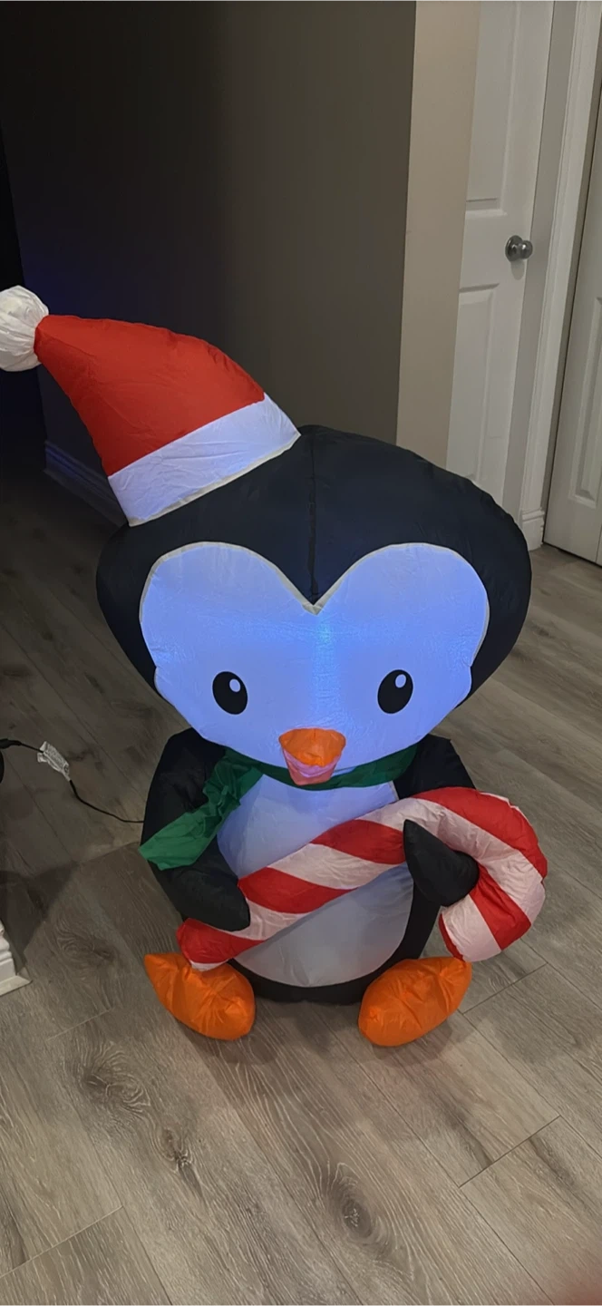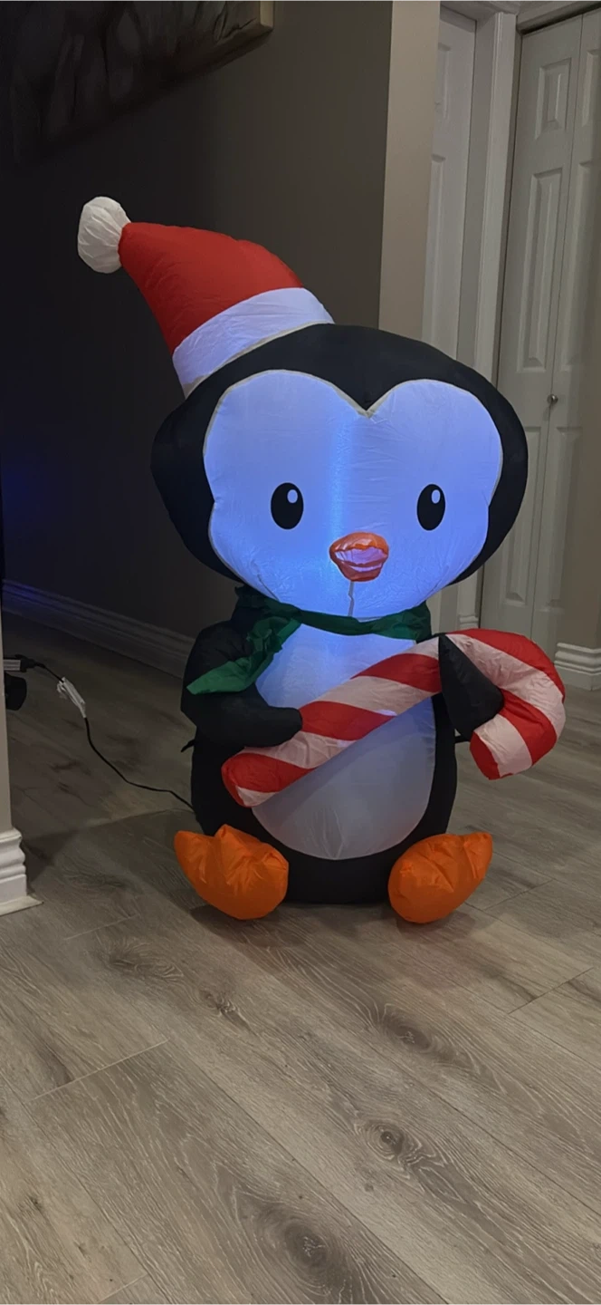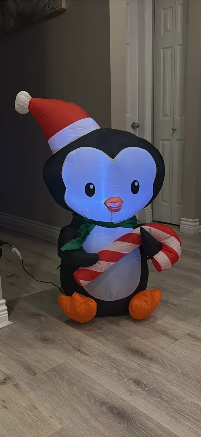 Get ready for the holidays with this adorable inflatable penguin! It's wearing a Santa hat and holding a candy cane. Perfect for adding a festive touch to your home this Christmas season
