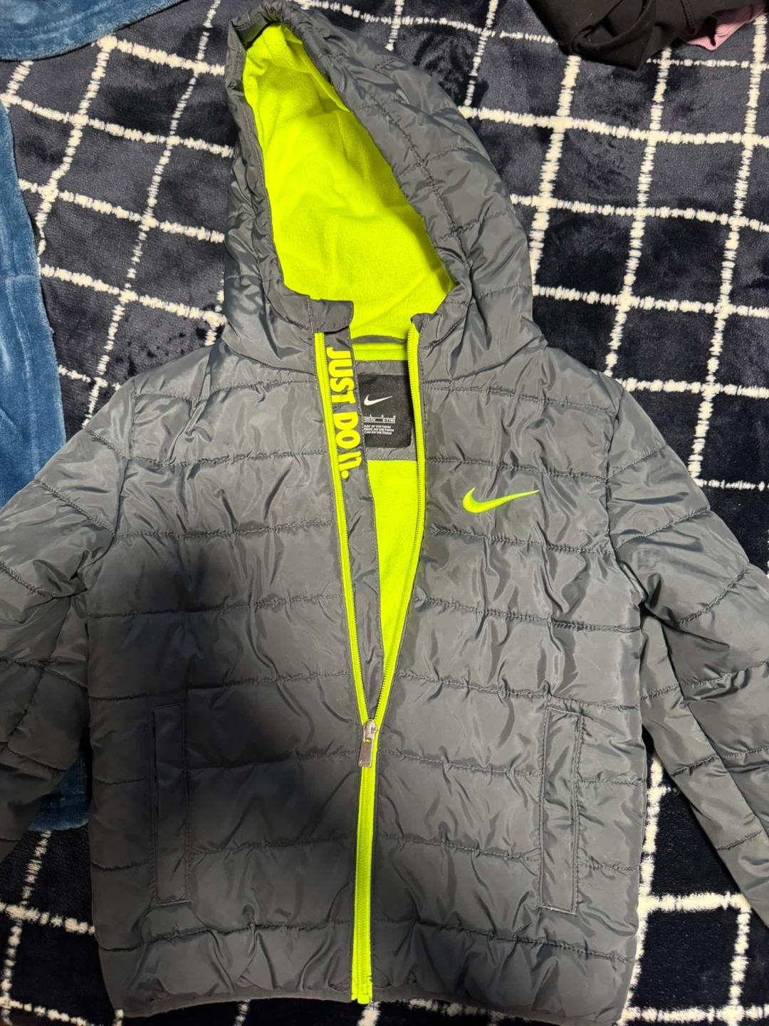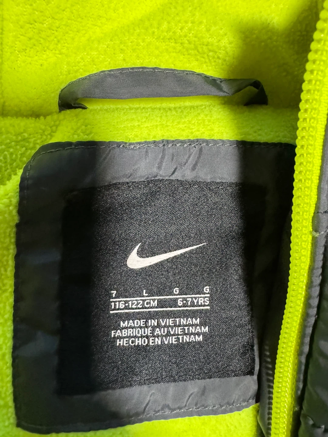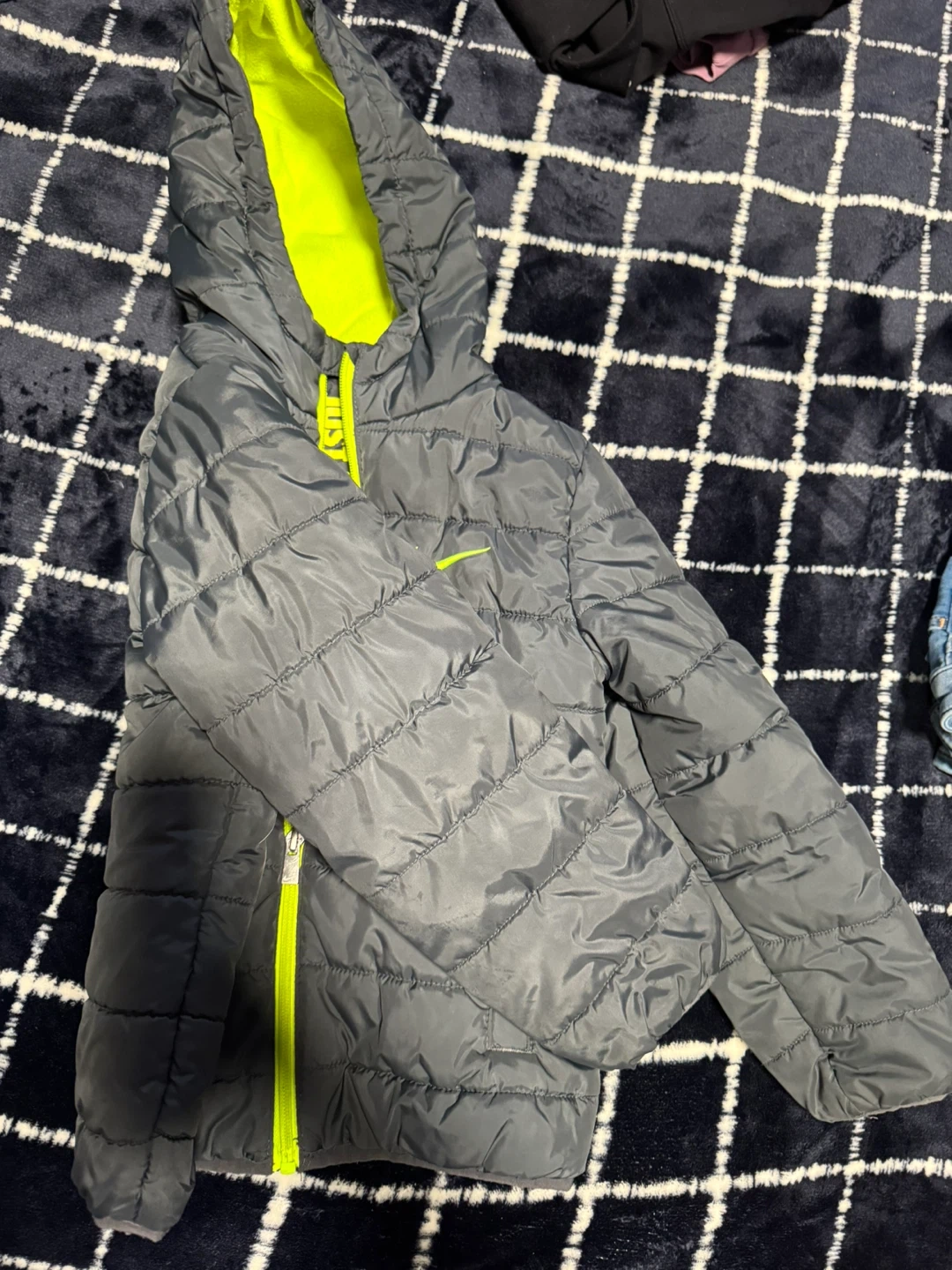 Selling a Nike puffer jacket for kids, size 6-7 years (116-122 cm). It's a stylish grey colour with bright neon yellow accents. Perfect for keeping your little one warm and cozy! Grow up used few times