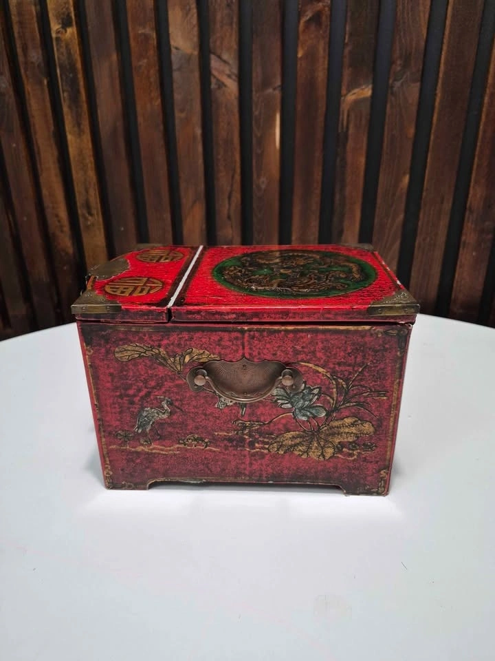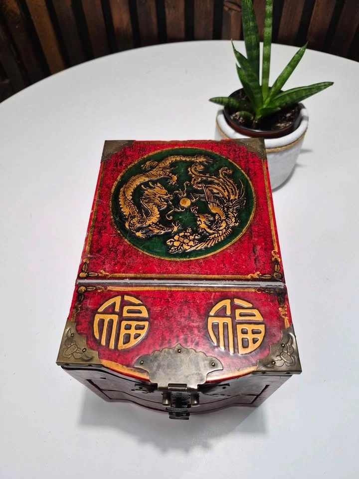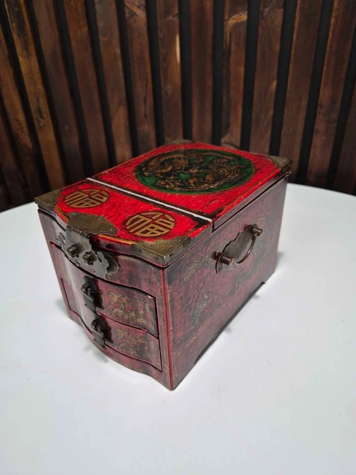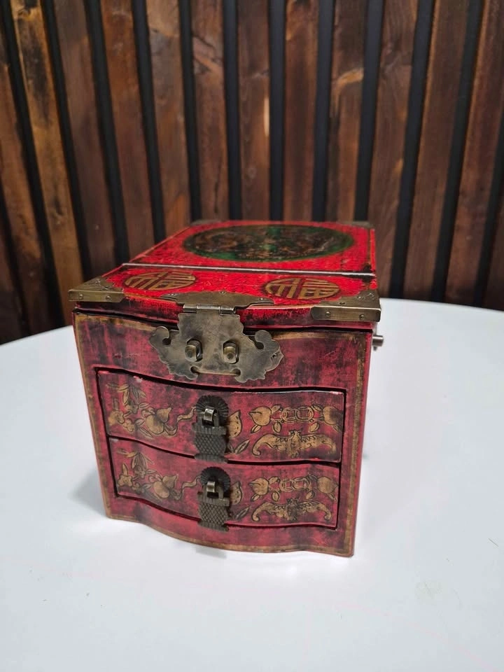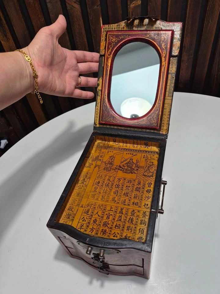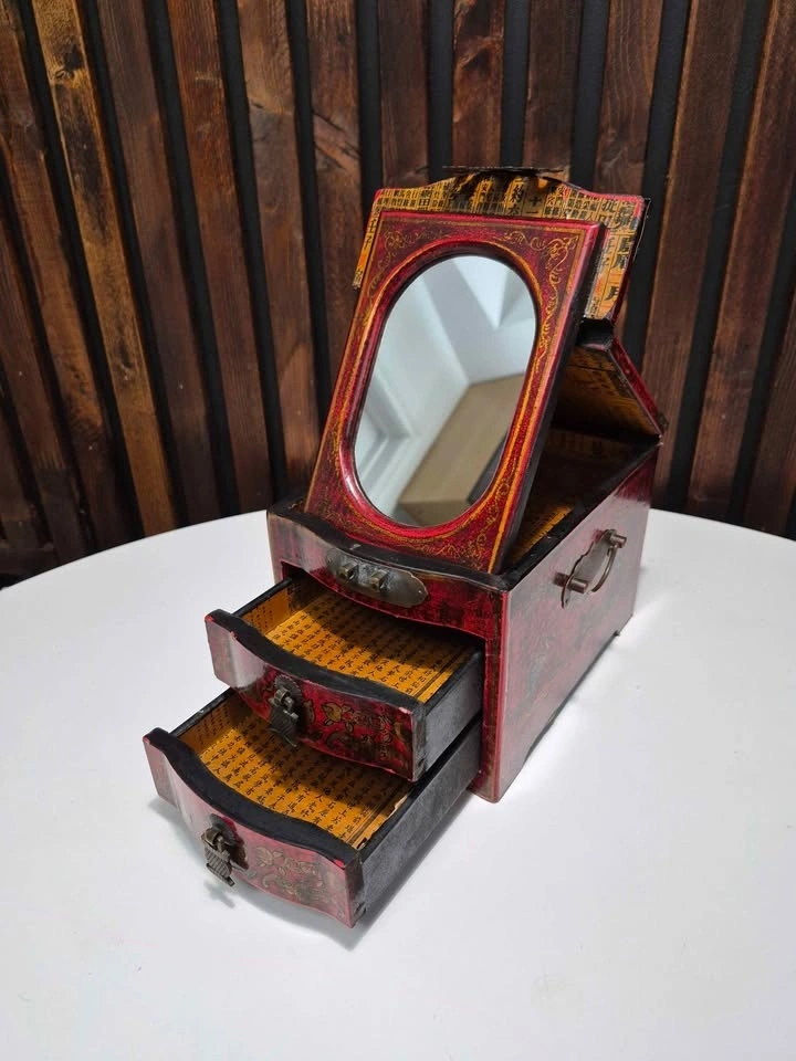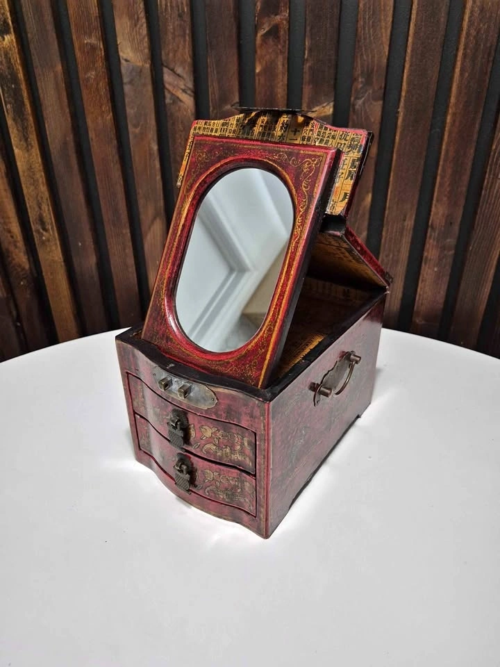 Decorative vintage-style wooden jewelry box with folding mirror and drawers. Asian-inspired design, great for decor or storage.