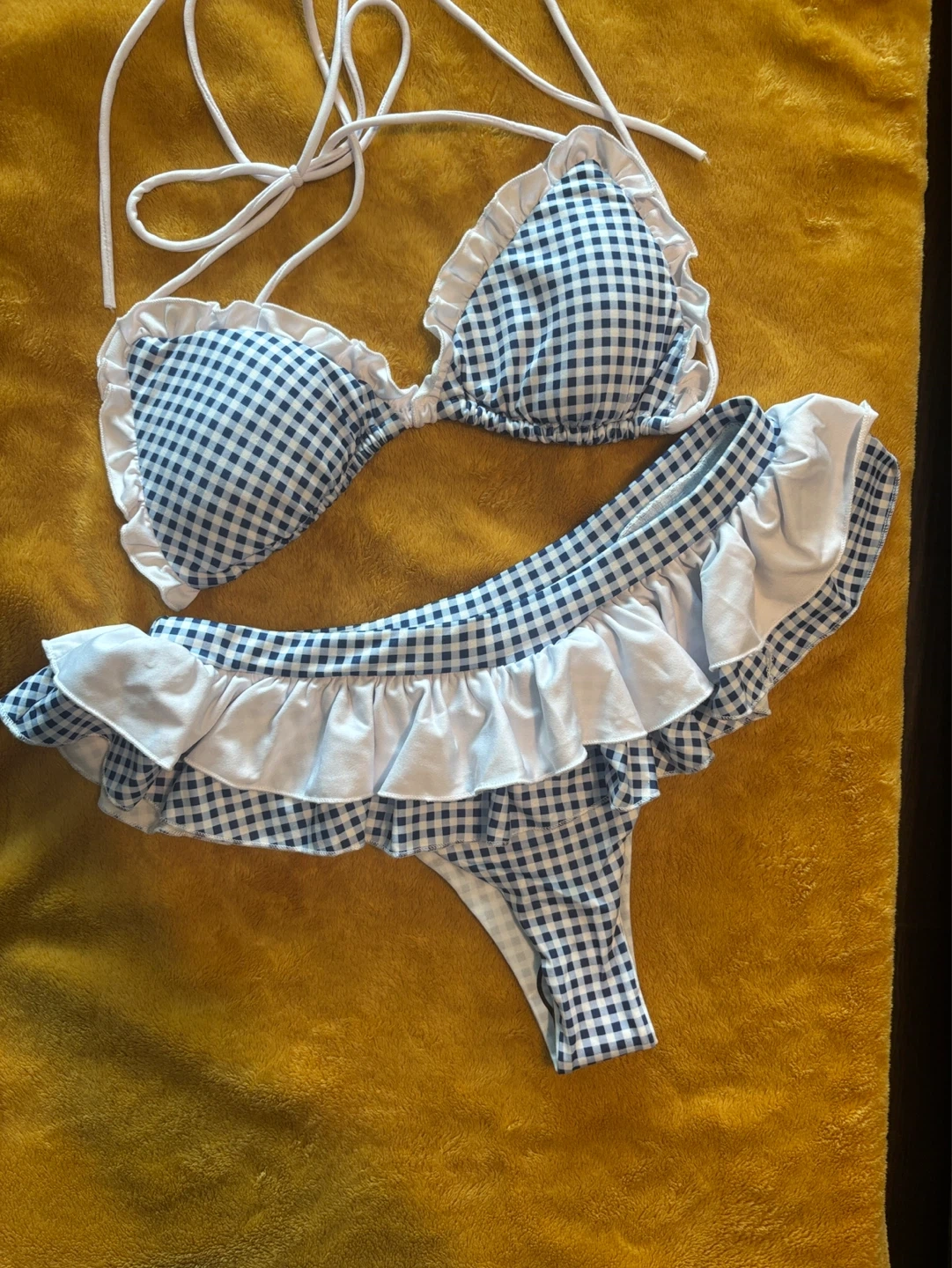 Cute blue gingham bikini set with white ruffled trim. Includes a tie-back halter top and matching ruffled bottoms. Size medium.