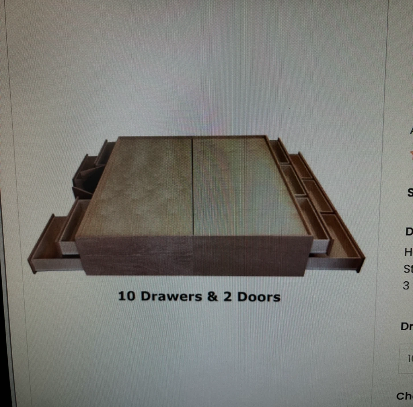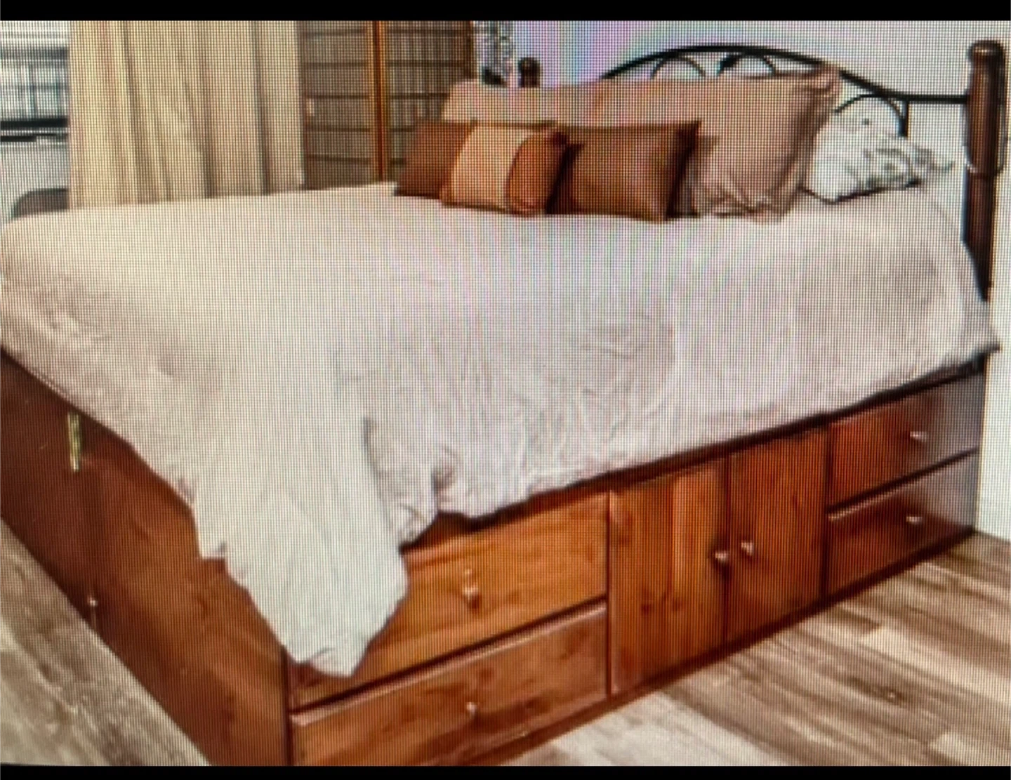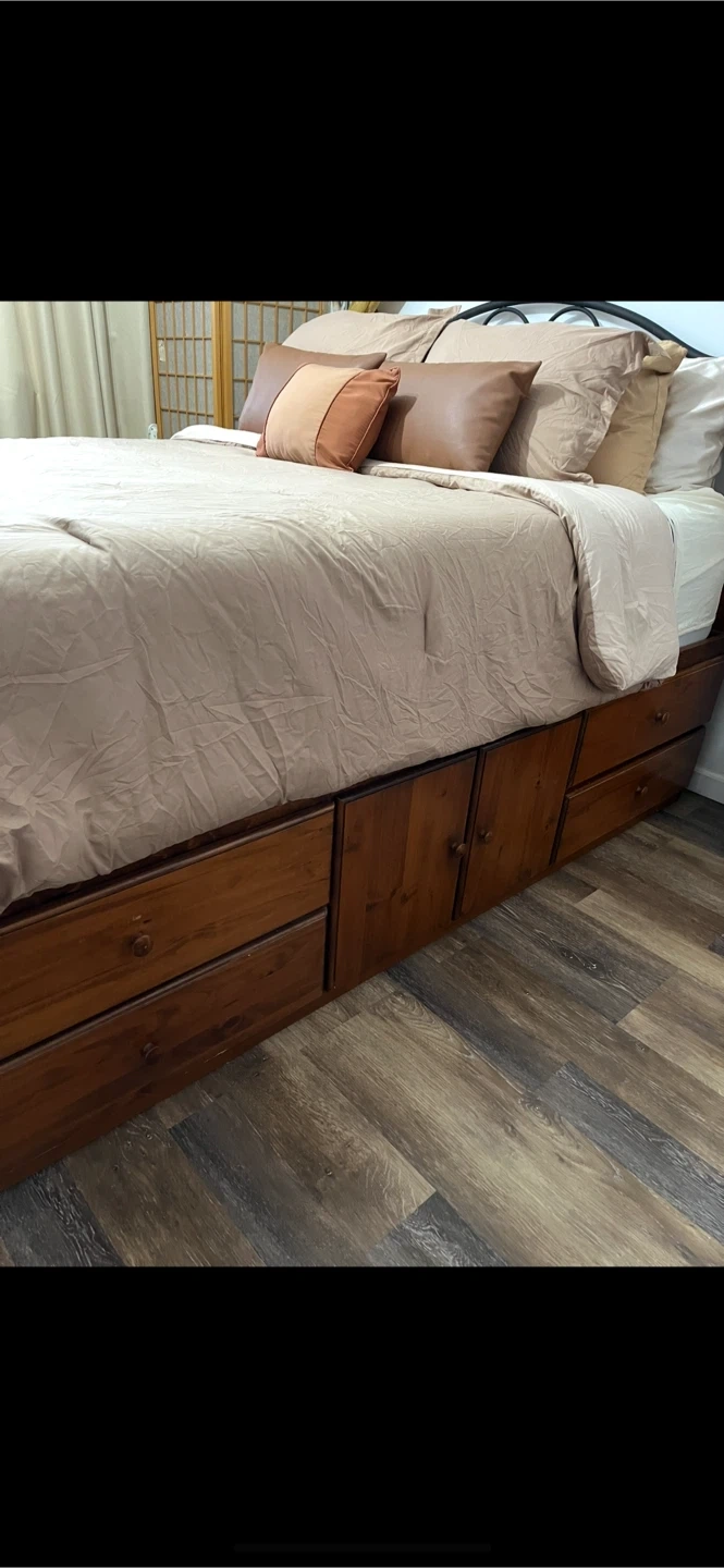 - Queen Storage Bed. All Solid Wood with Head Board; No mattress (has 10 drawers on tracks (6 drawers on one side and 4 drawers & 1 two door cabinet on the other side). Very Good Condition (bring help and equipment; ramp access for pick up)
