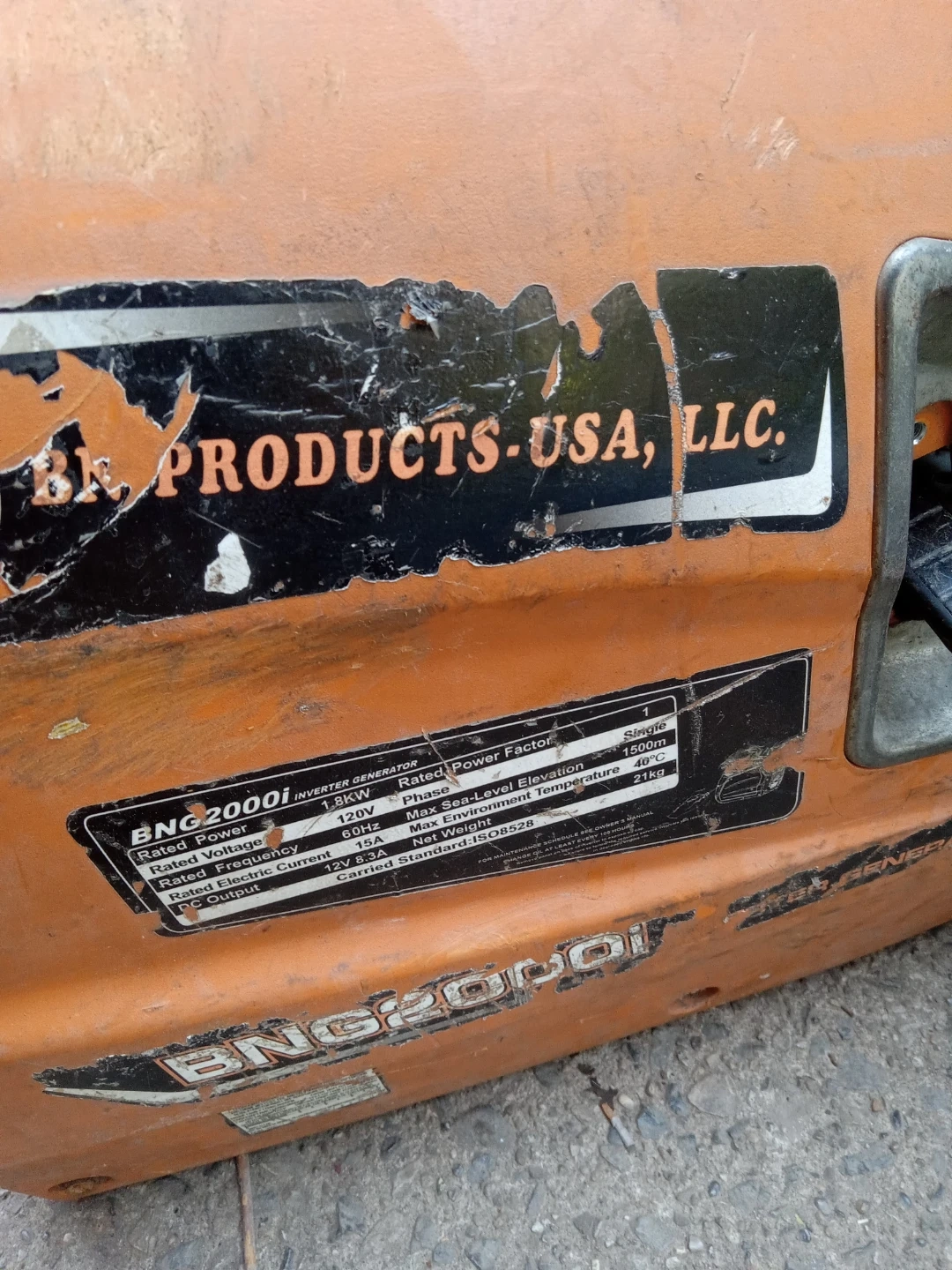 Selling a used BN Products BNG2000i inverter generator. It shows signs of wear and tear, as you can see from the photos, but it could be useful for parts or repair