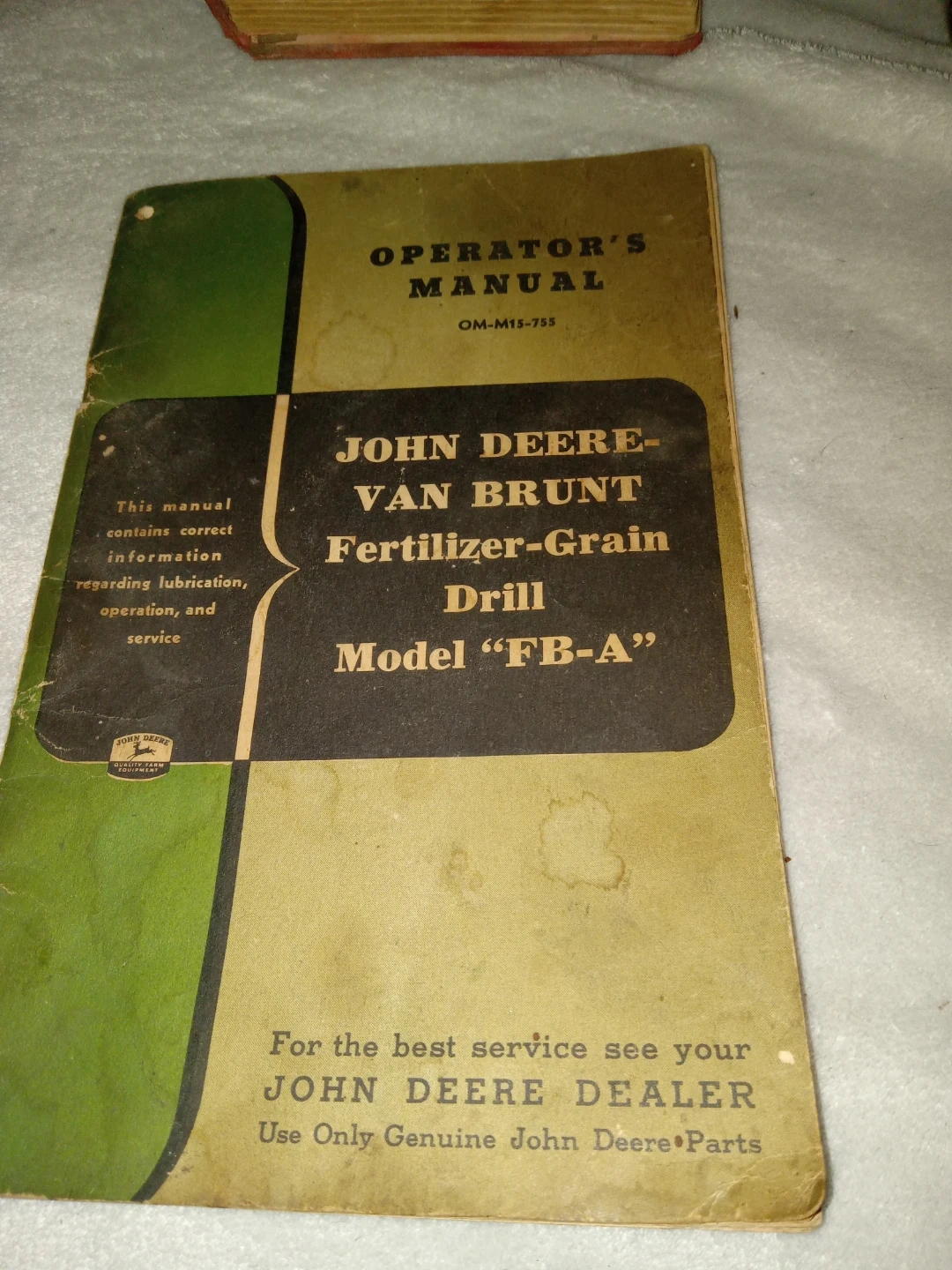 Selling a John Deere Van Brunt Fertilizer-Grain Drill Operator's Manual, Model "FB-A". This manual contains correct information regarding lubrication, operation, and service for your equipment