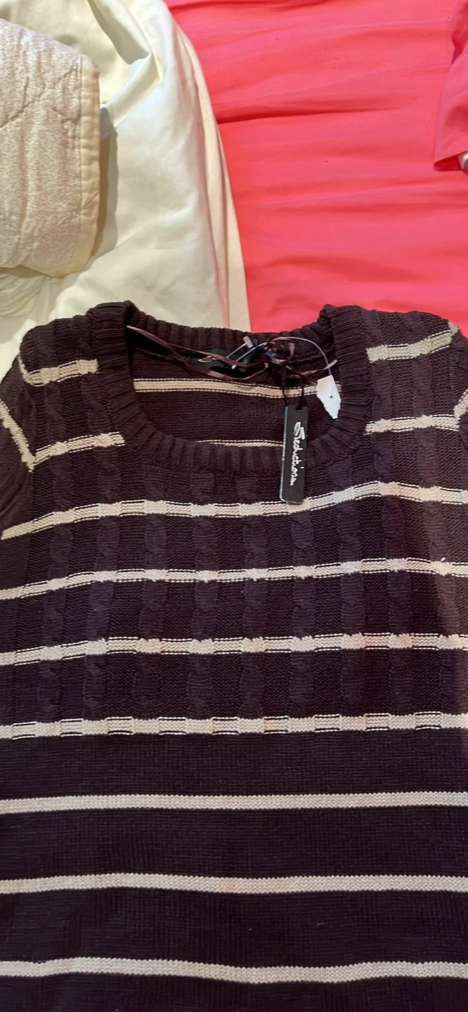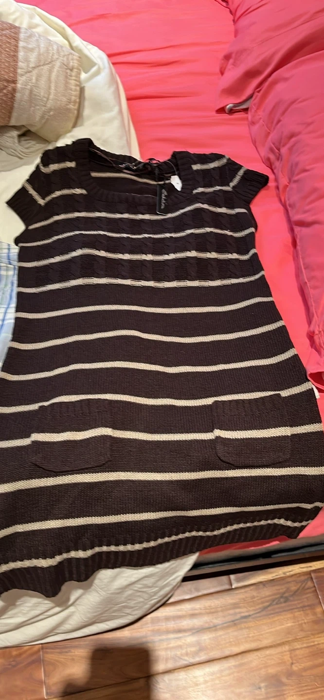 This is a Seduction brand dress, size medium. It has a brown and white striped pattern and two front pockets. The material feels like a comfortable knit. Perfect for casual wear!