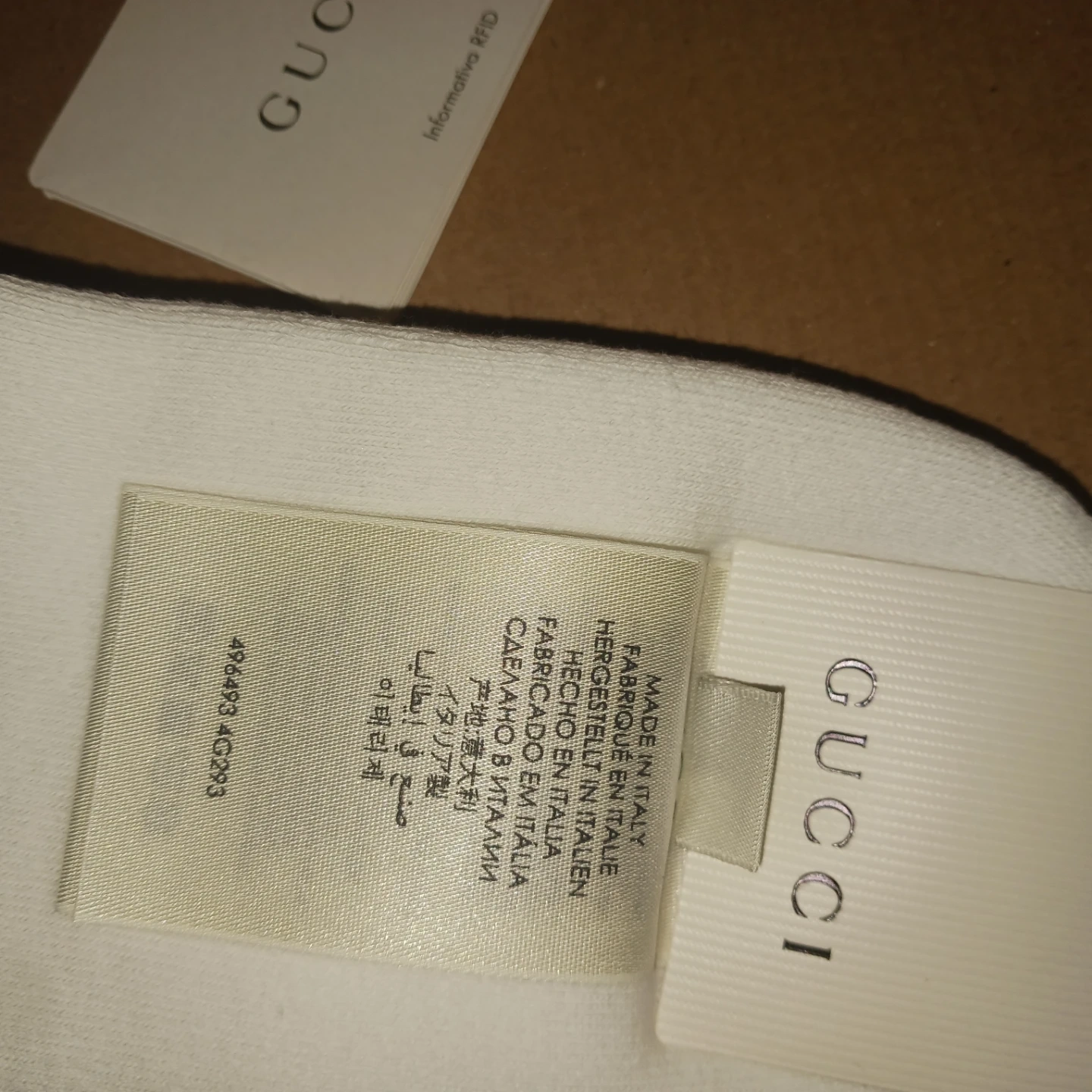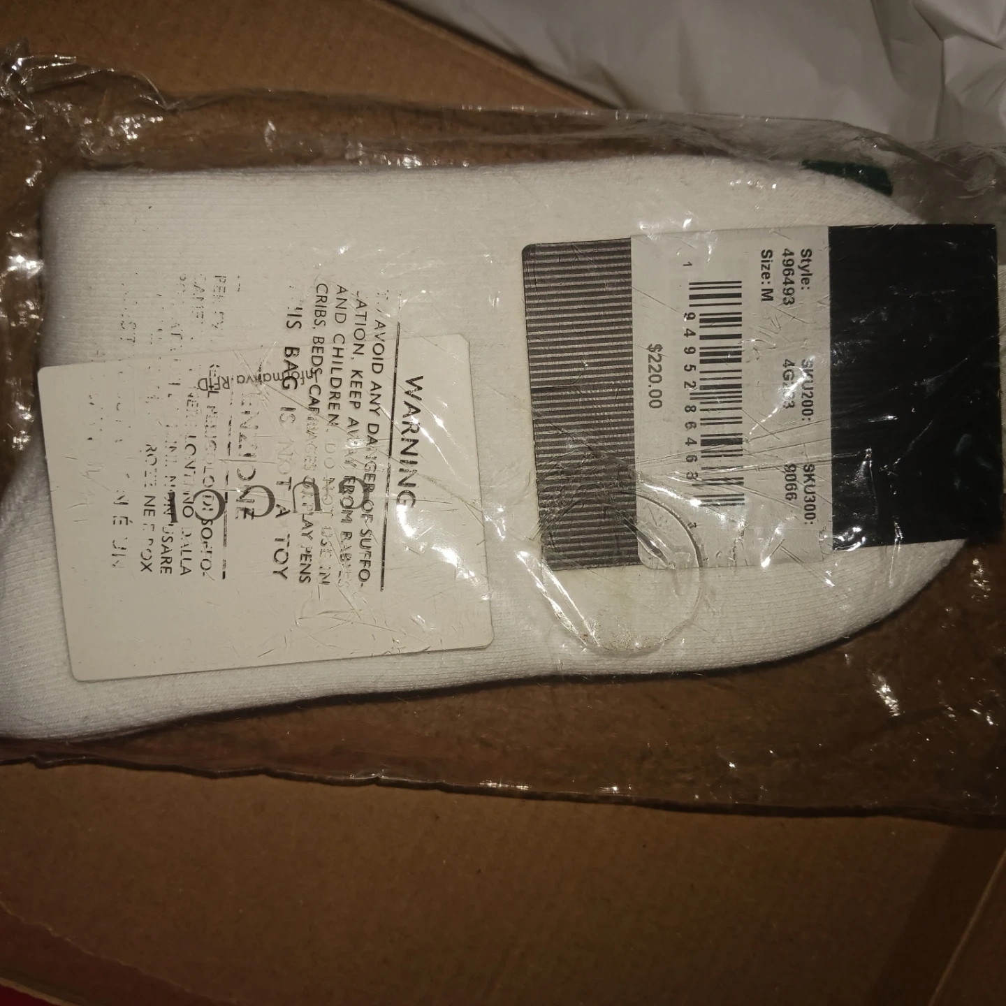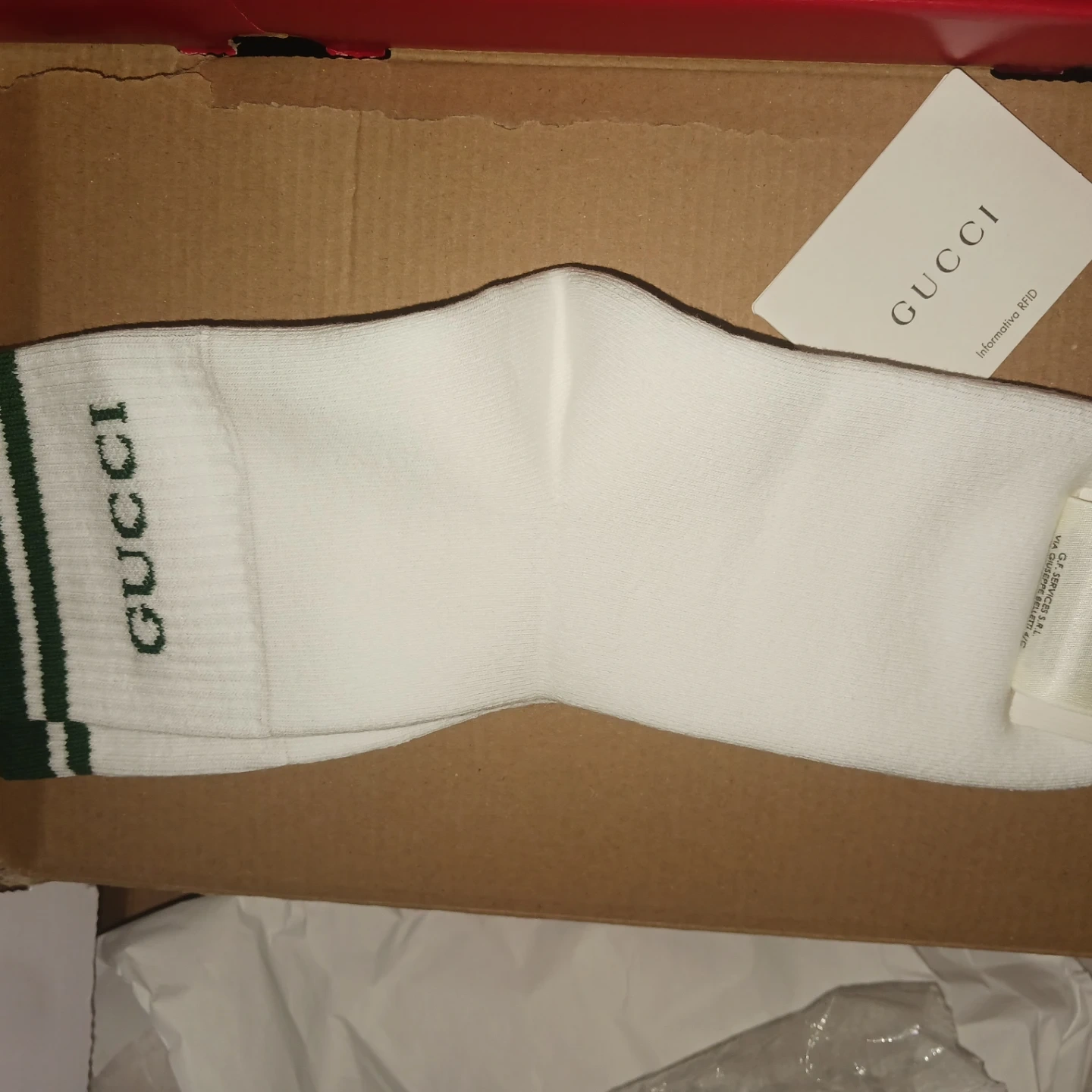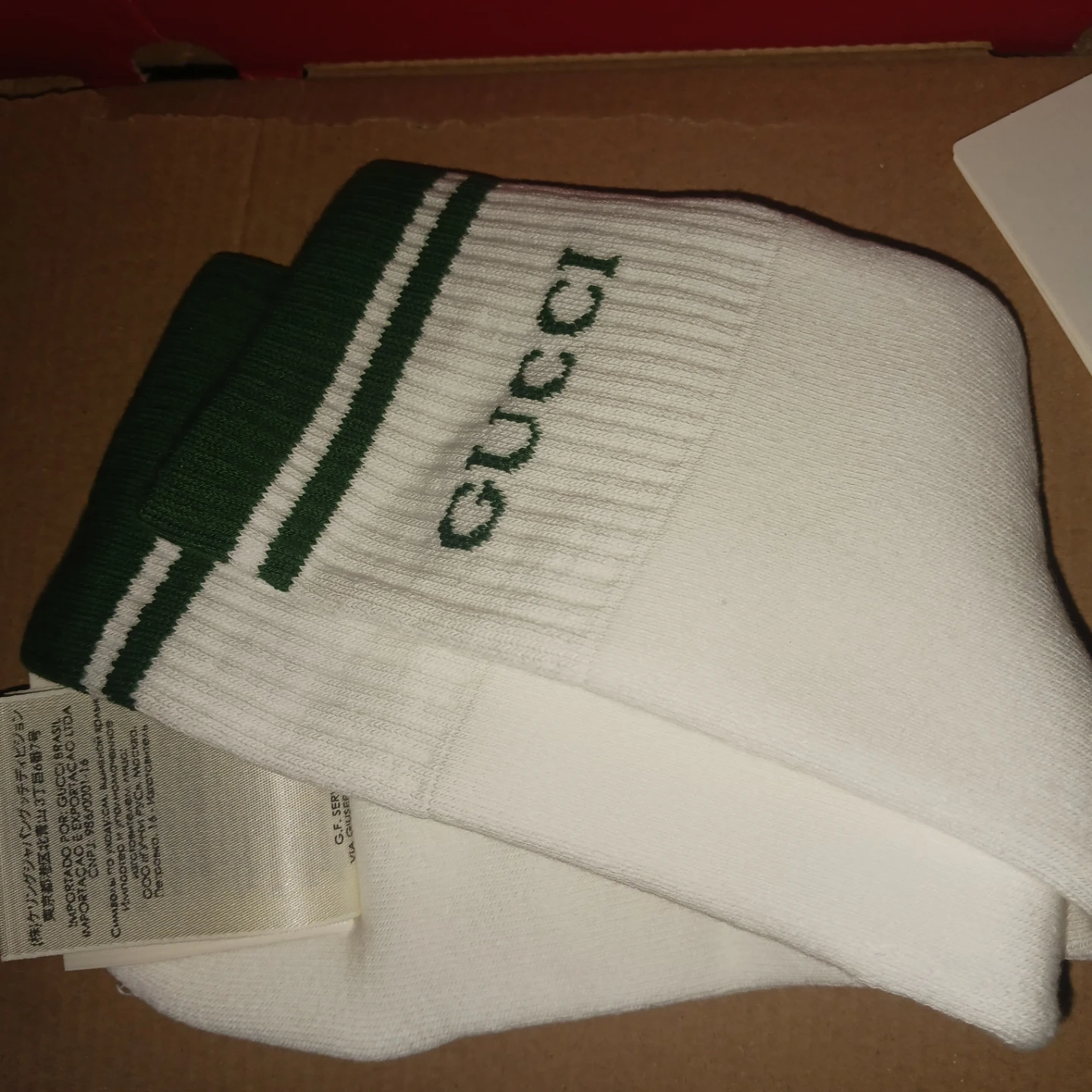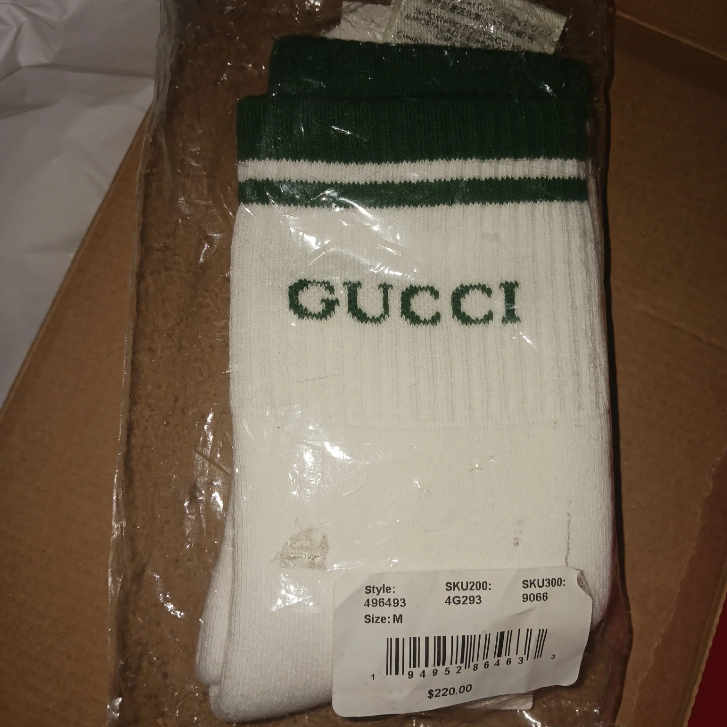 Selling a pair of Gucci socks in white with green accents. They are size M and come with the original box. These socks are in great condition and ready for a new owner! Originally bought for $220