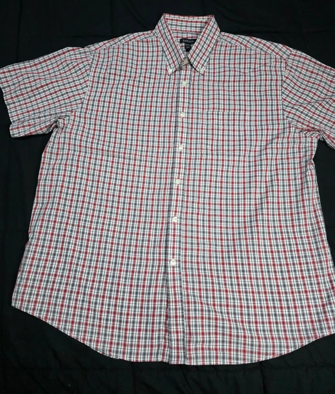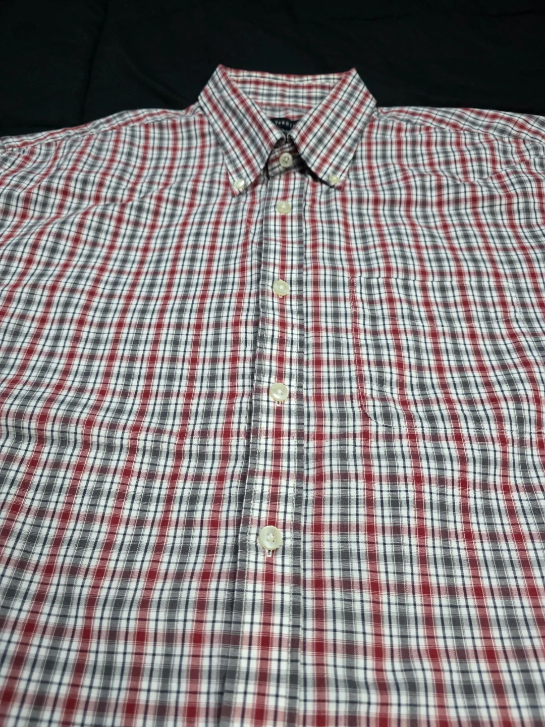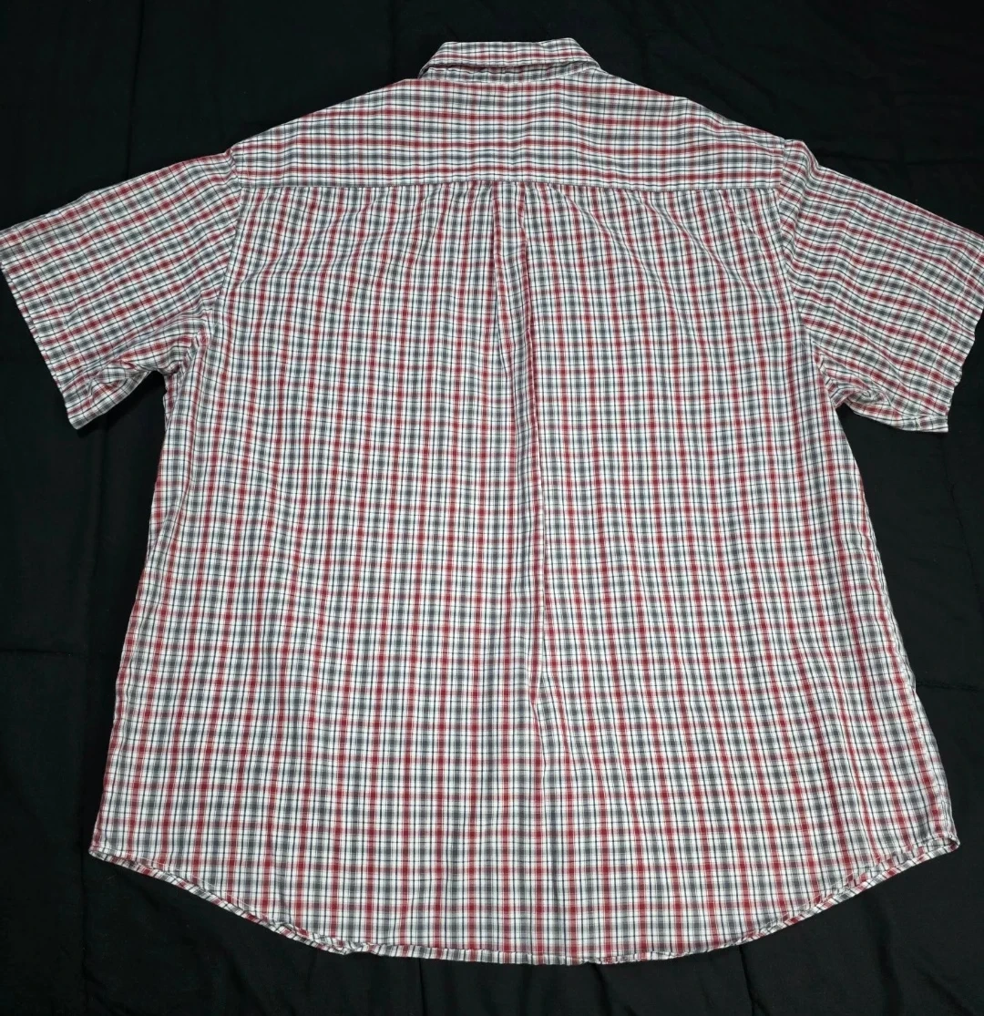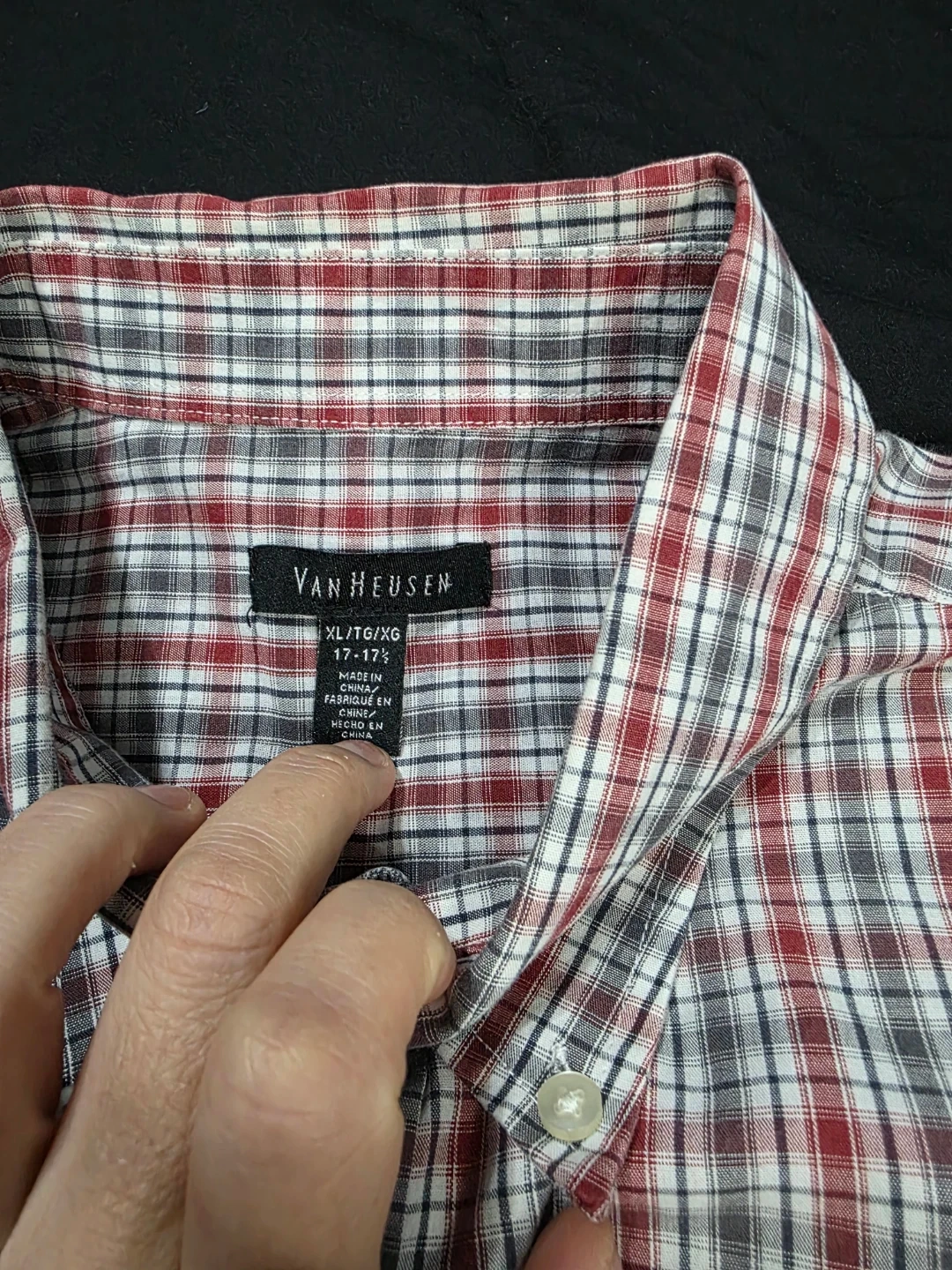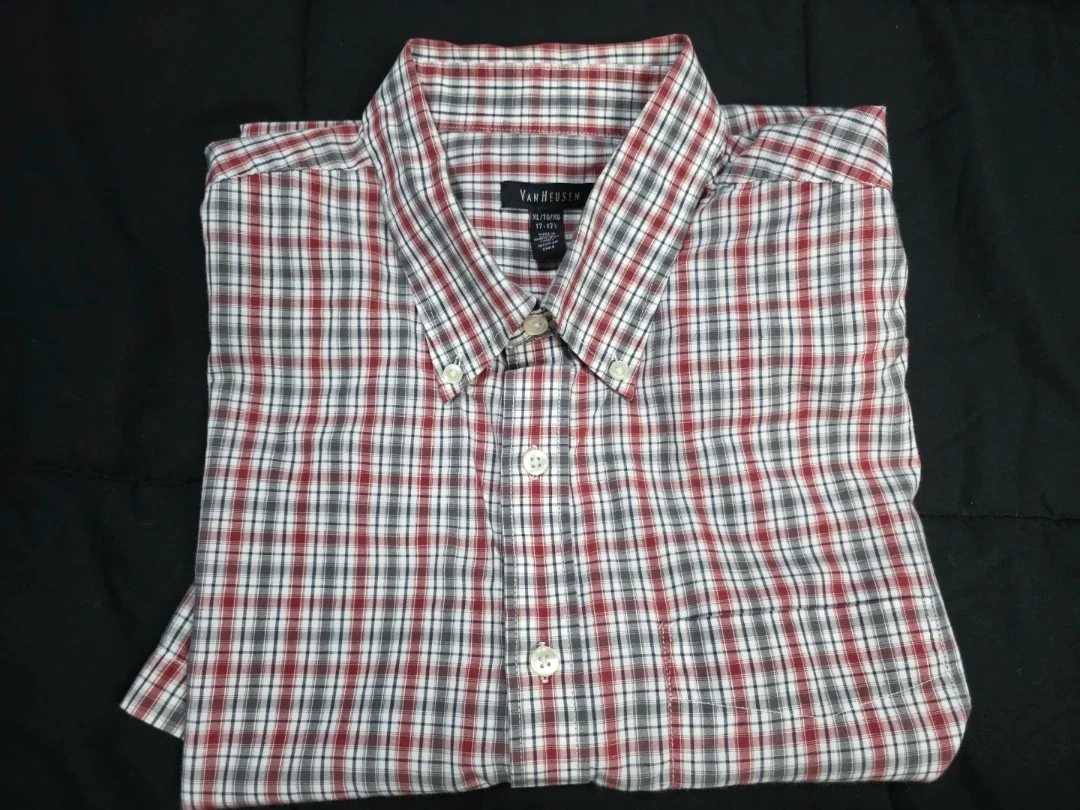 Here's a Van Heusen plaid button-down shirt in size XL. The shirt features a red, white, and gray plaid pattern. It's a short-sleeved shirt made from a comfortable material, perfect for casual wear