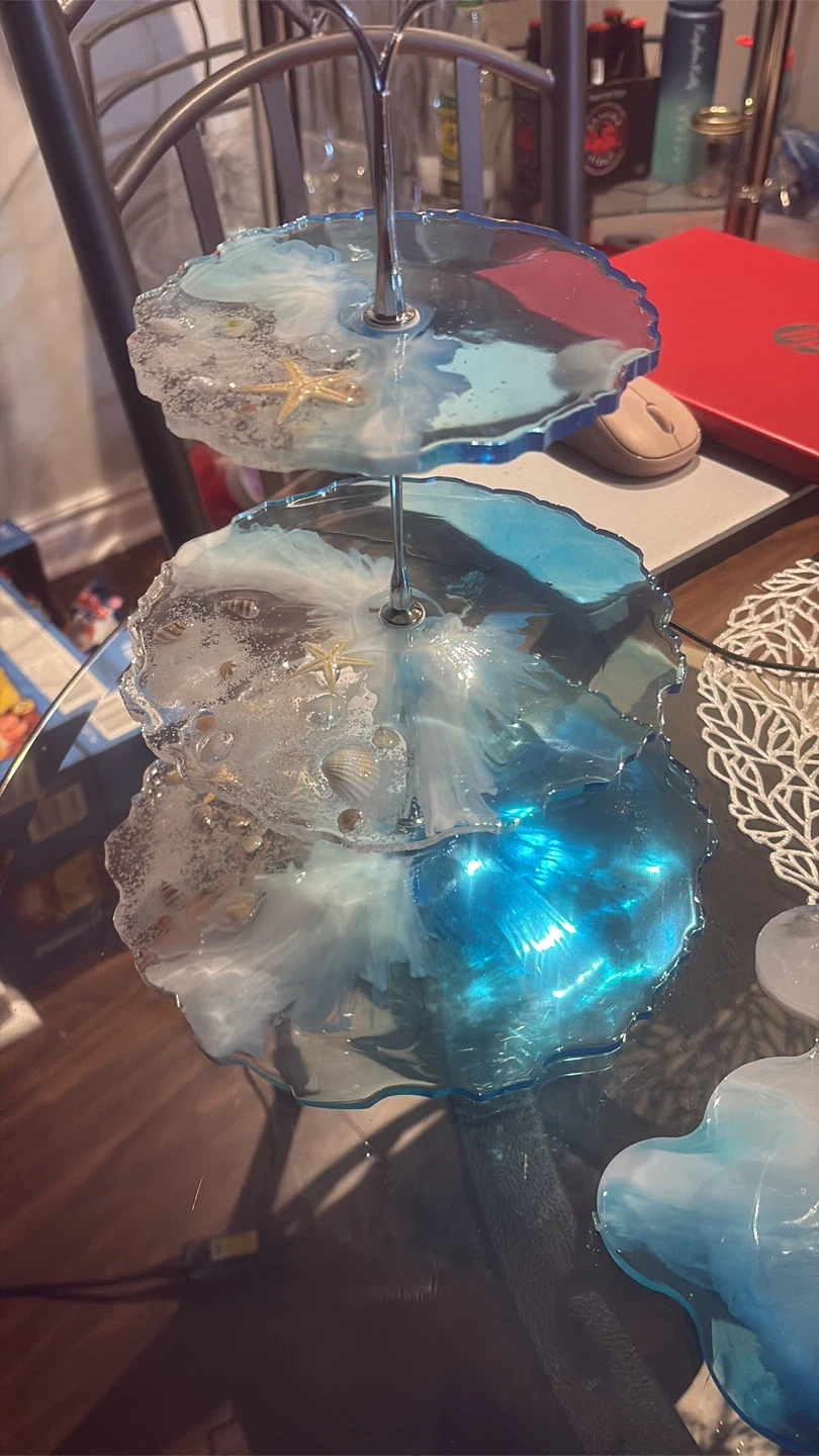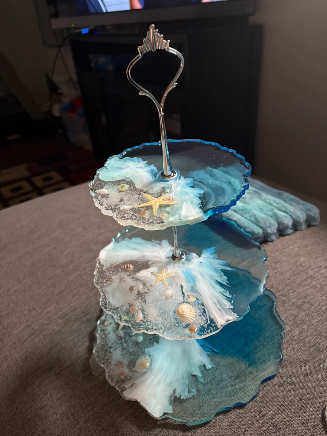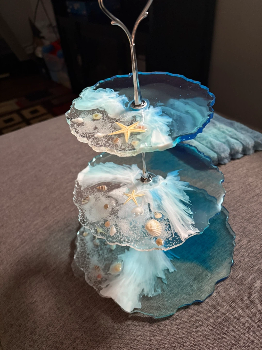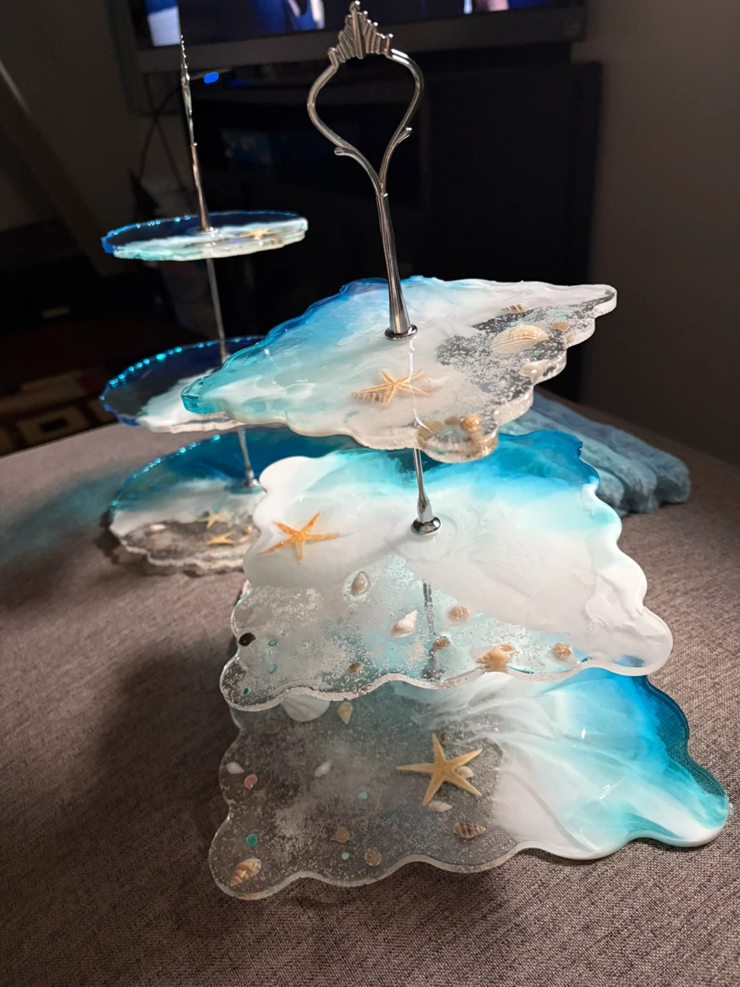 Beautiful ocean themed resin 3-tiered serving tray. It has a beachy vibe with starfish and shells embedded in the resin. Perfect for displaying desserts or appetizers!