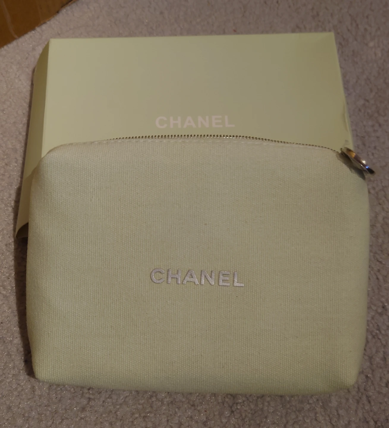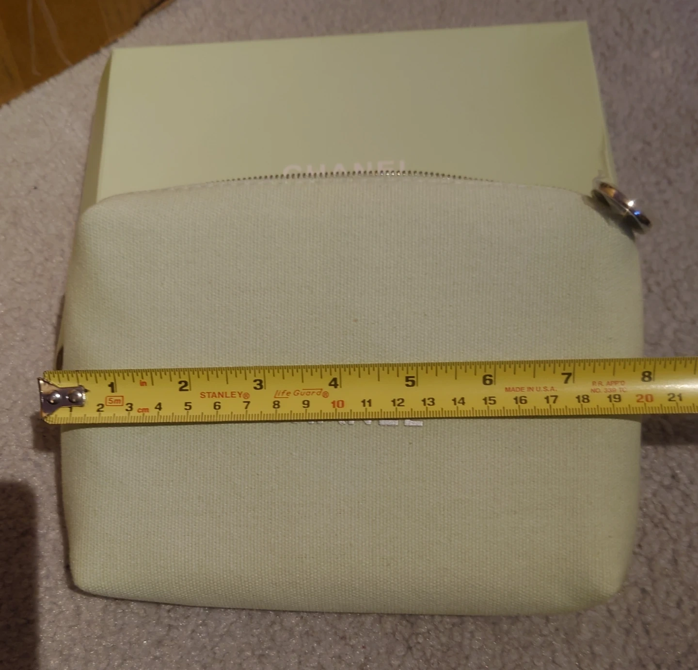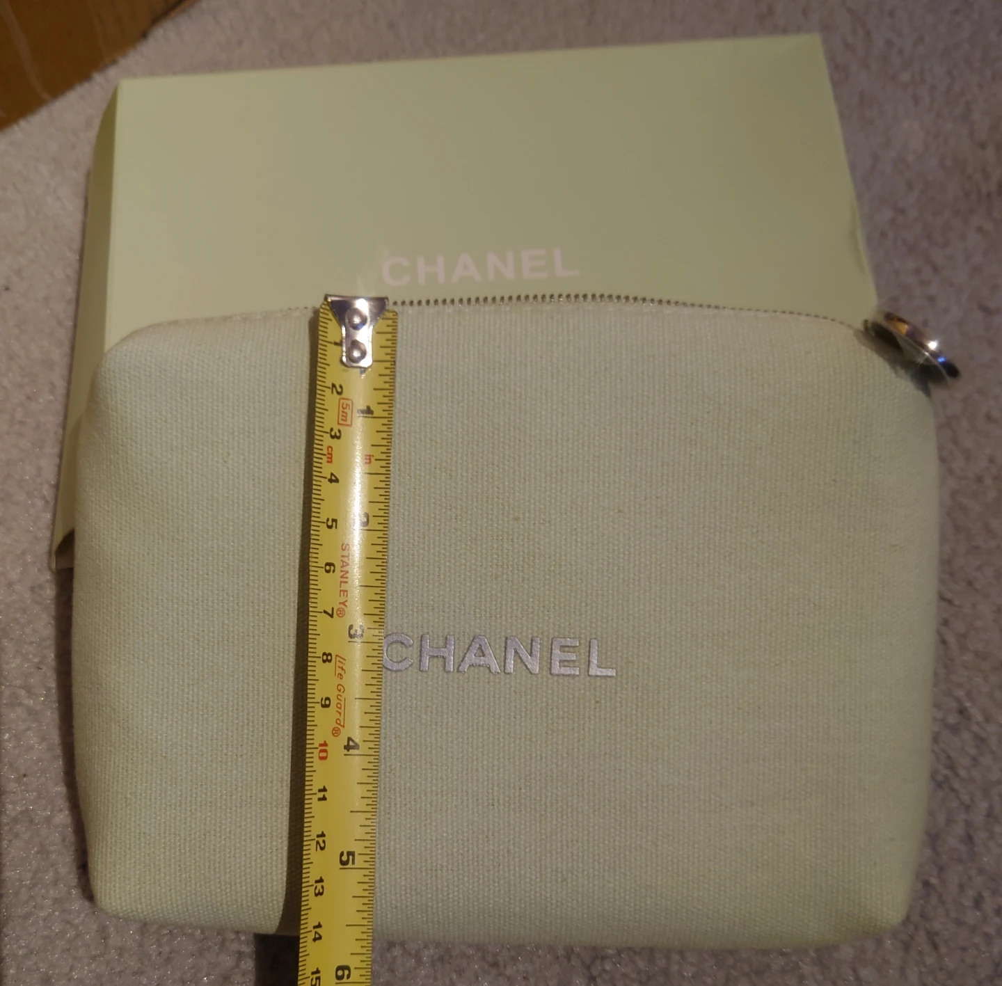 Selling a cute Chanel makeup pouch! It's a light green colour and comes with its original box. It measures about 8 inches in length and 5.5 inches in height. Perfect for keeping your makeup organized!