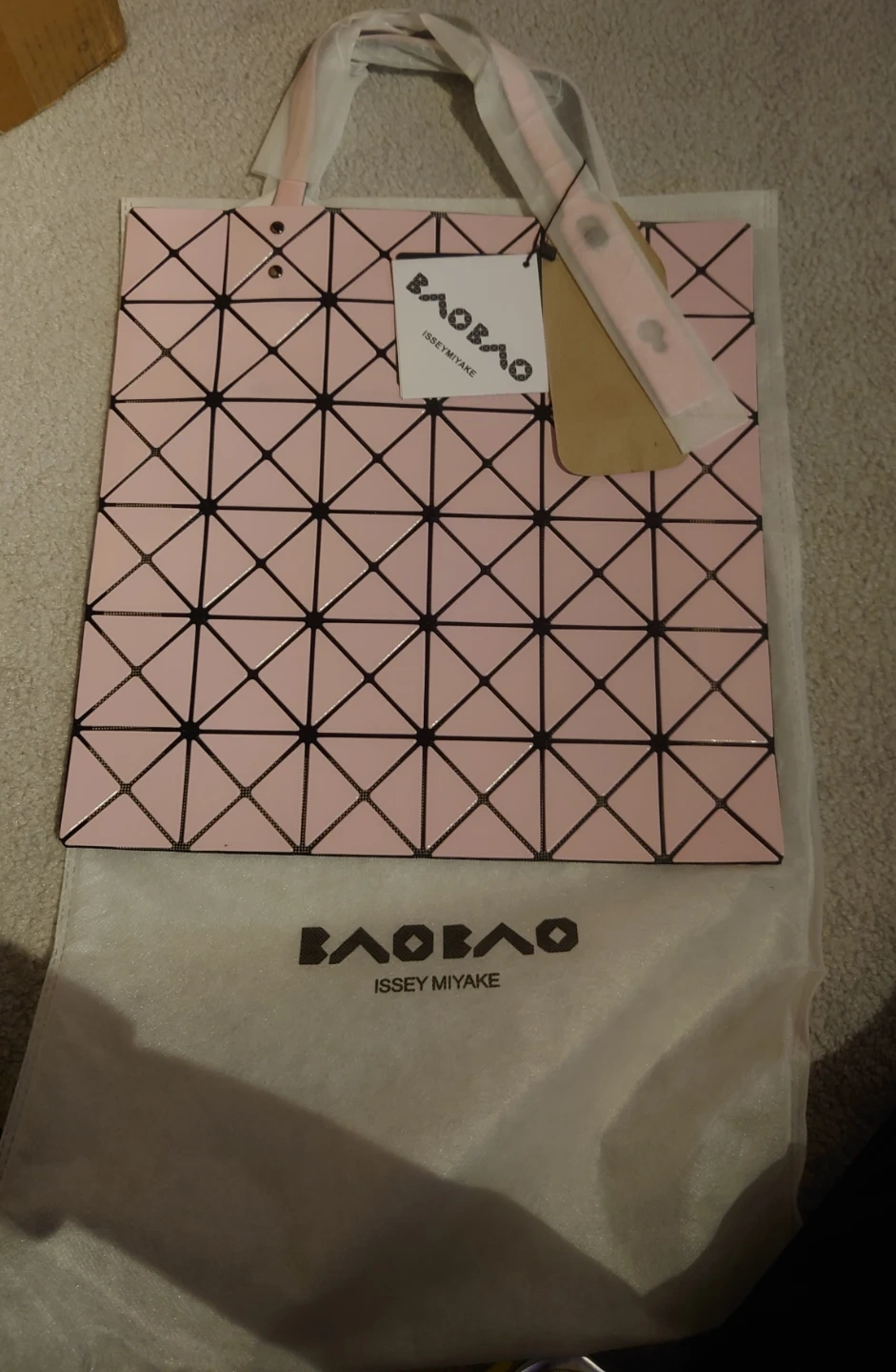 Here's a lovely Issey Miyake Baobao tote bag in pink! It's in great condition and ready for a new owner. The bag features the iconic geometric pattern that Baobao is known for.