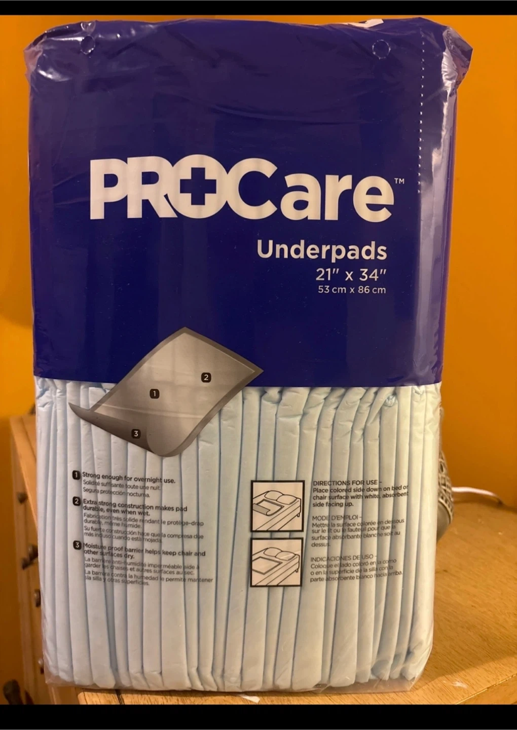 Selling a pack of PROCare Underpads. These are 21" x 34" (53 cm x 86 cm). They are strong enough for overnight use and have an extra strong construction that makes the pad durable, even when wet.