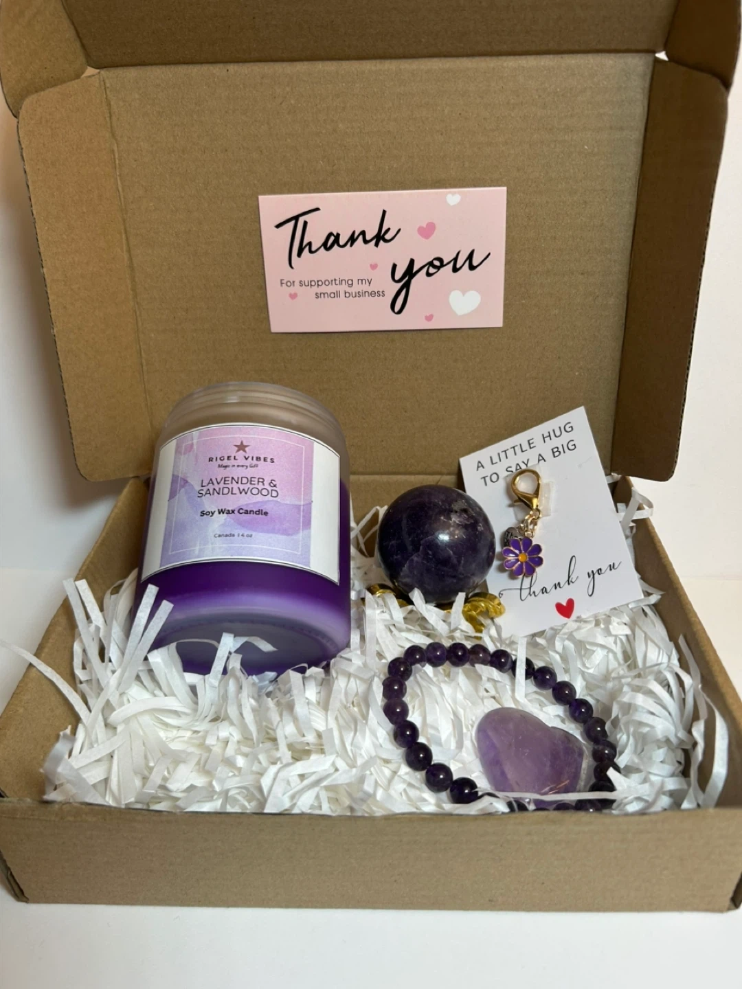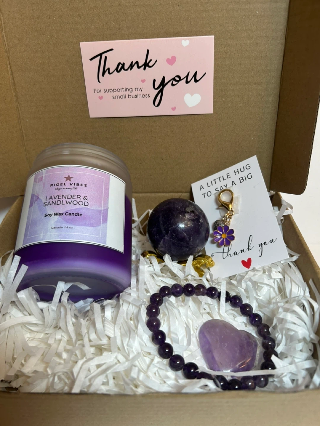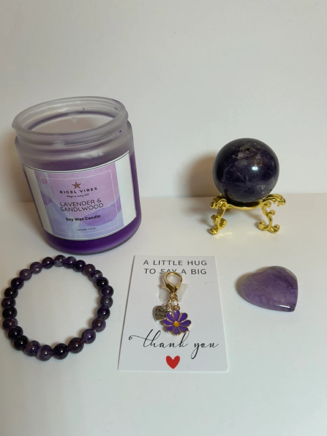 Selling a lovely set that includes a Rigel Vibes Lavender & Sandalwood soy wax candle, a beaded bracelet, a heart-shaped stone, a sphere on a stand, and a little hug charm! The candle is Canada 3.5 oz