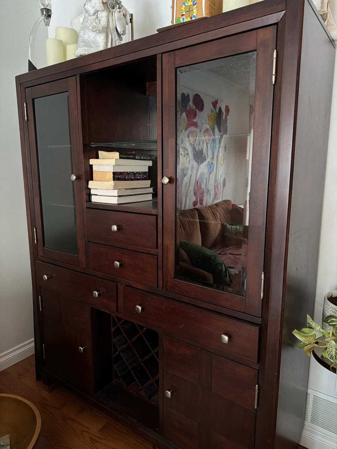 Selling a lovely dark wood china cabinet! It features glass doors on the upper cabinets and a wine rack in the lower section. Perfect for displaying your favourite items or storing your wine collection.