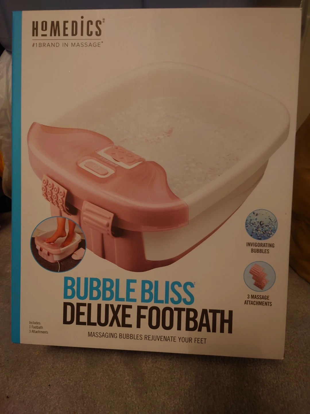 Selling a brand new Homedics Bubble Bliss Deluxe Footbath! It's still in its original packaging and includes the footbath itself, plus 3 massage attachments. Massaging bubbles will rejuvenate your feet after a long day! Box is included