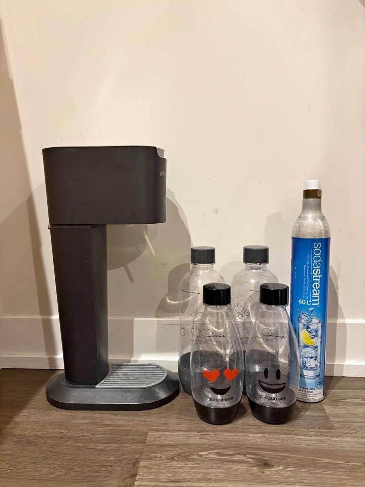 Complete Sodastream Set with x2 CO2 cylinders, x2 1L bottles, and x2 0.5L bottles.