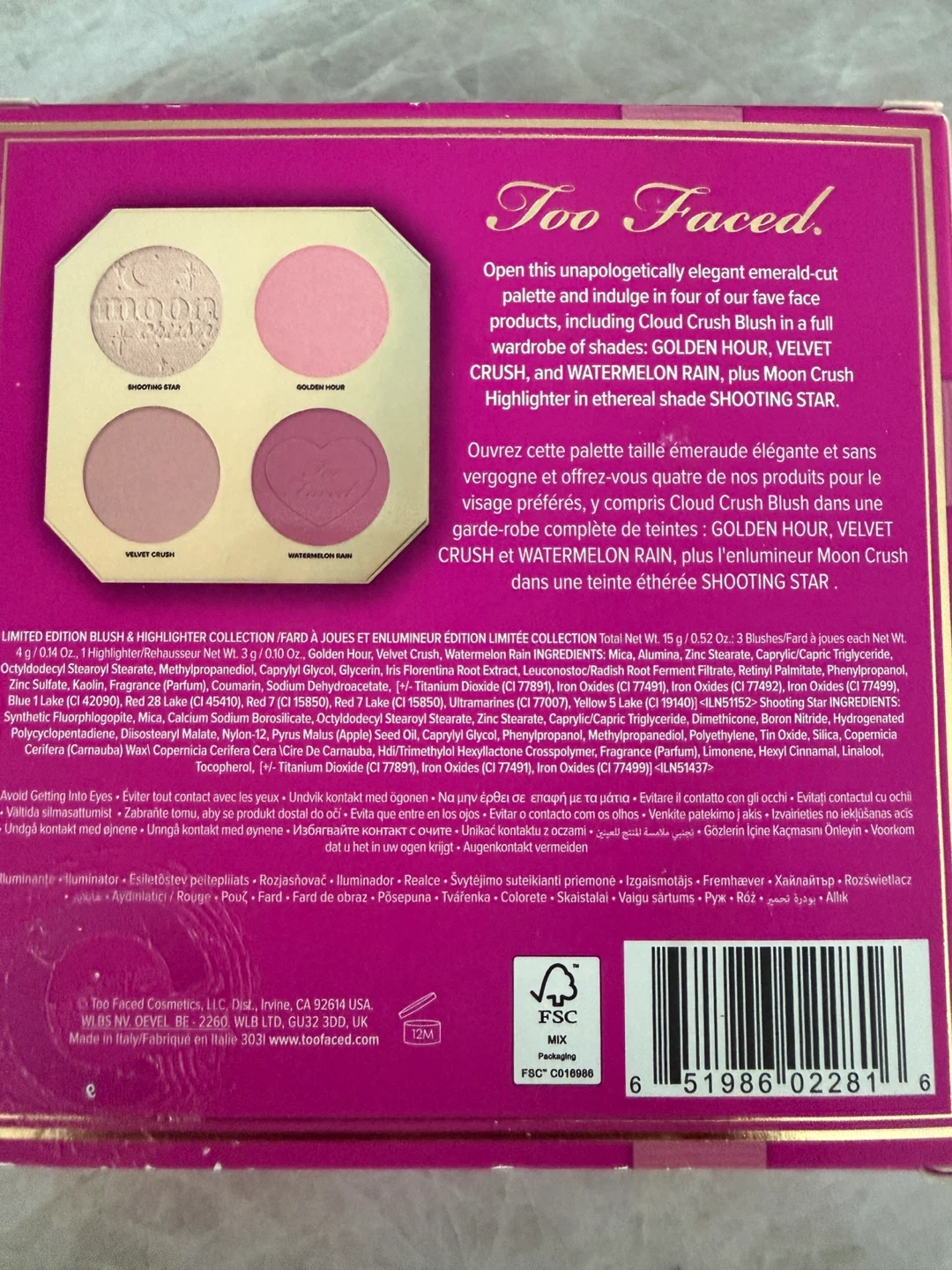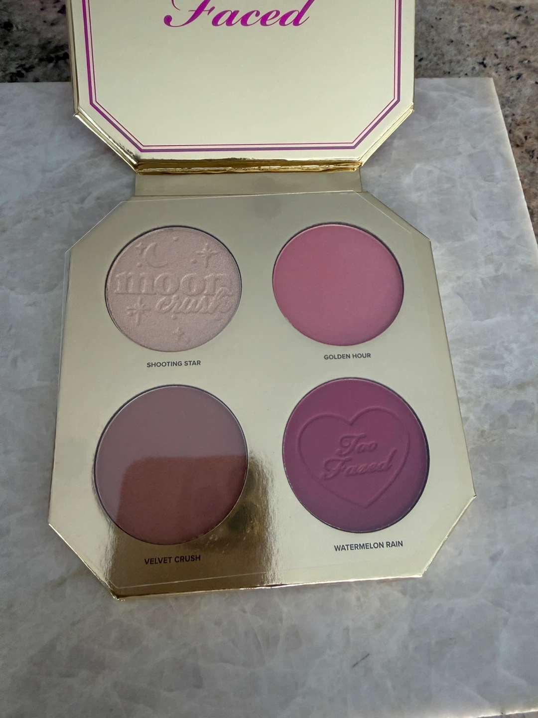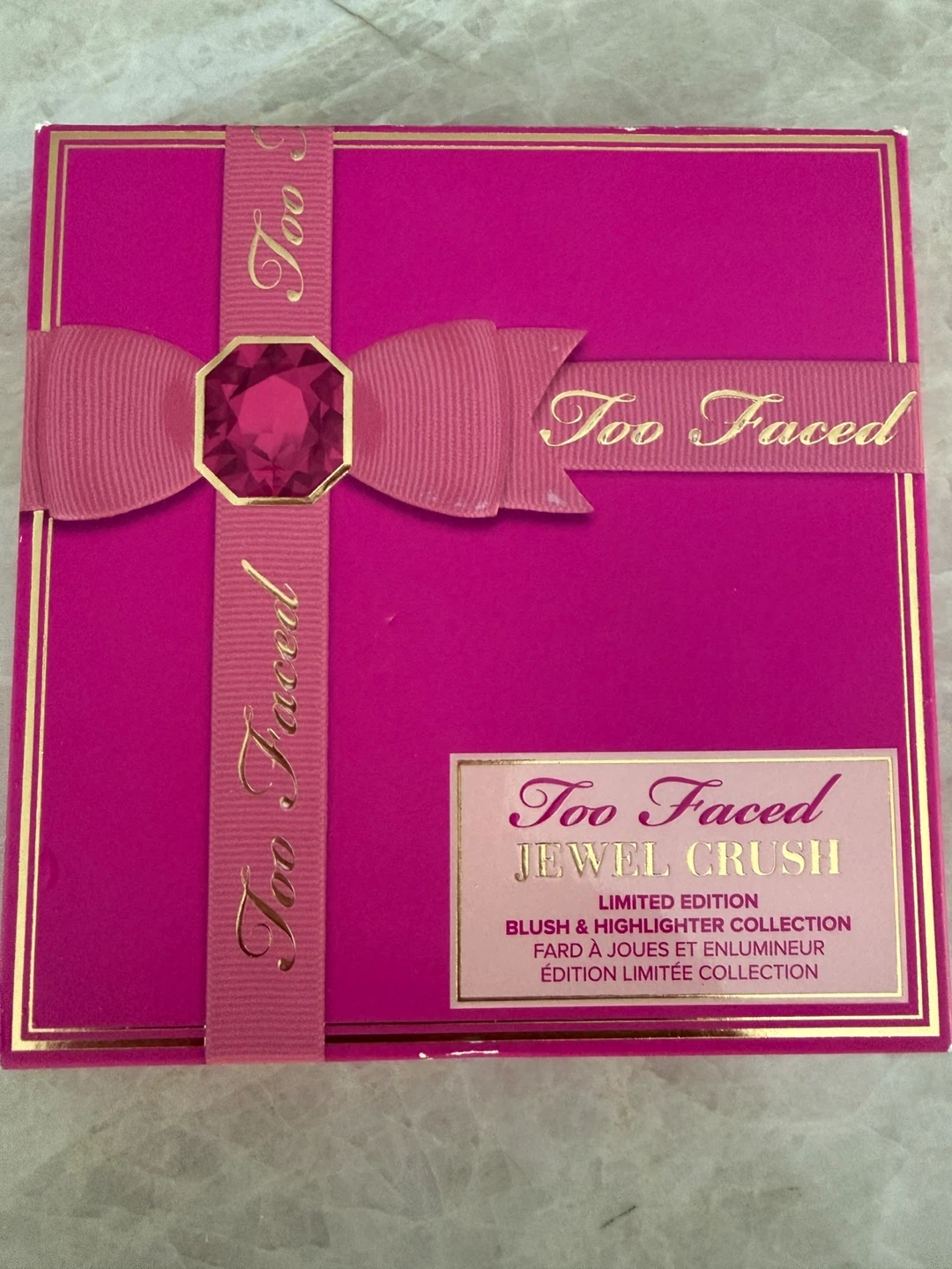 Selling a Too Faced Jewel Crush Limited Edition Blush & Highlighter Collection! This palette features four gorgeous shades: Shooting Star, Golden Hour, Velvet Crush, and Watermelon Rain. It's in excellent condition and comes with the original box. Perfect for adding a touch of sparkle to your makeup routine!