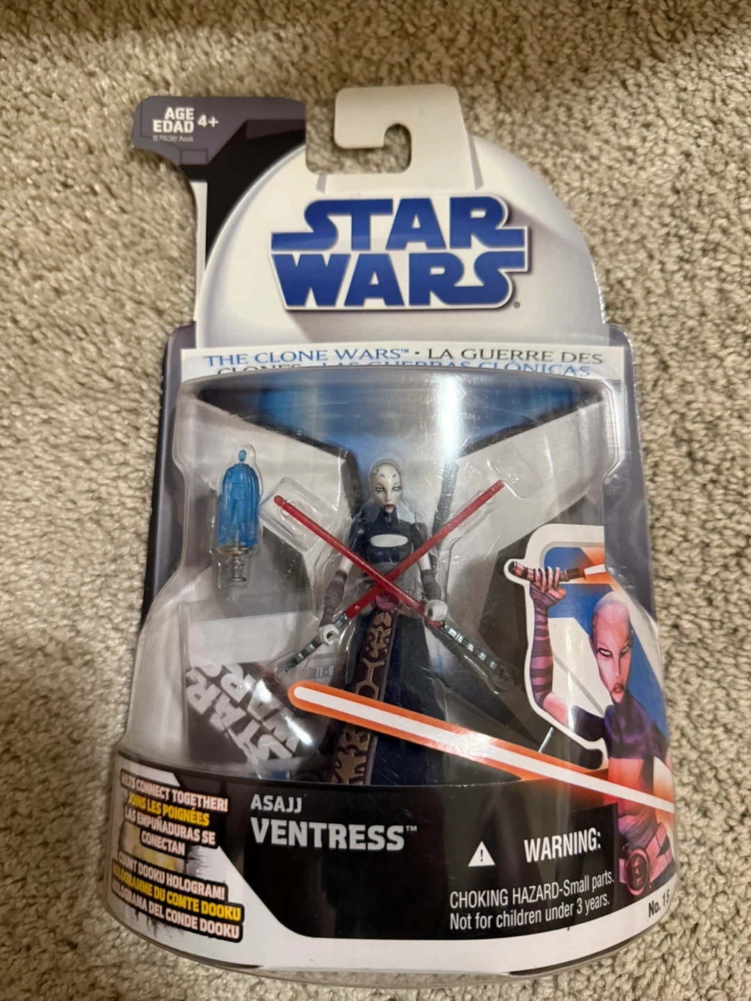 Selling a new, in-package Star Wars action figure of Asajj Ventress from The Clone Wars series! It's suitable for ages 4 and up. Comes with Count Dooku hologram accessory. Perfect for any Star Wars collector!
