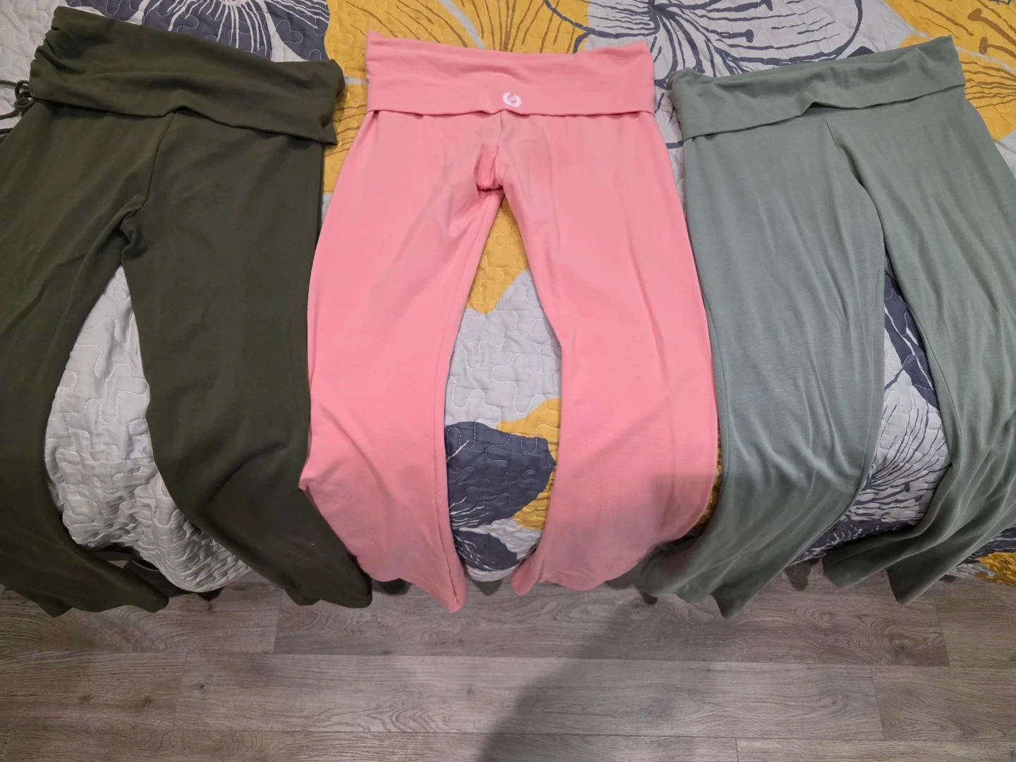 Selling three pairs of comfy yoga pants! They come in green, pink, and grey colours. Perfect for lounging or working out! 9.00 each or $22 for all 3. The Pink ones have never been worn. I also have a red pair and a light grey pair exactly the same- foldover waist and Flared at the bottom.