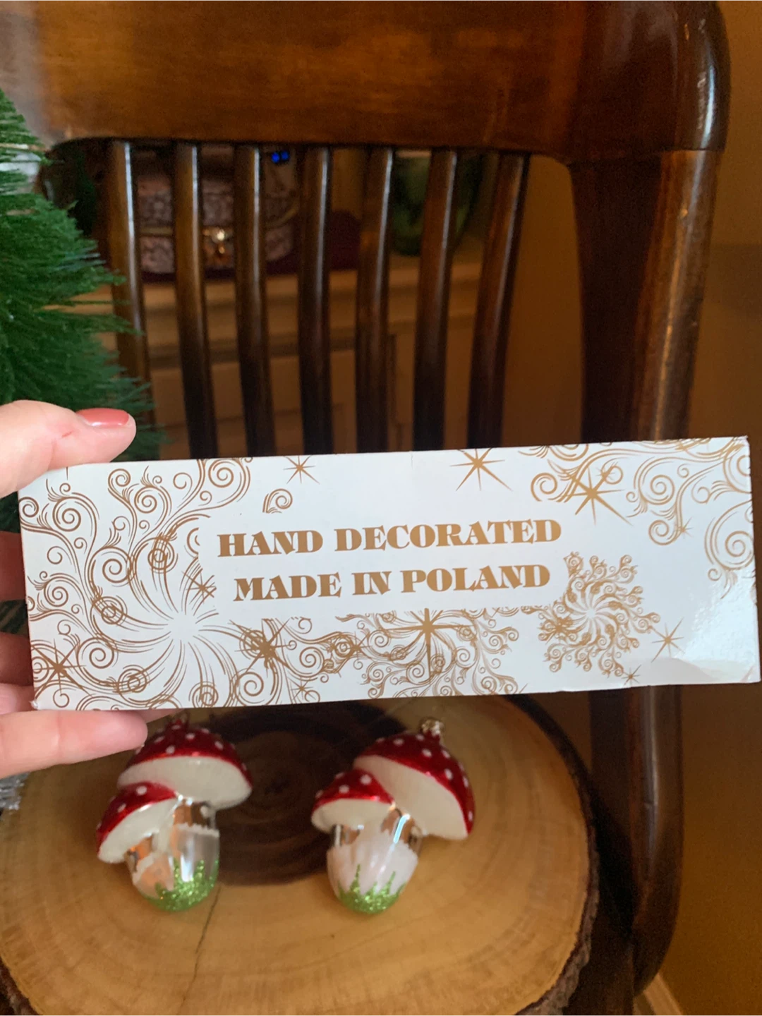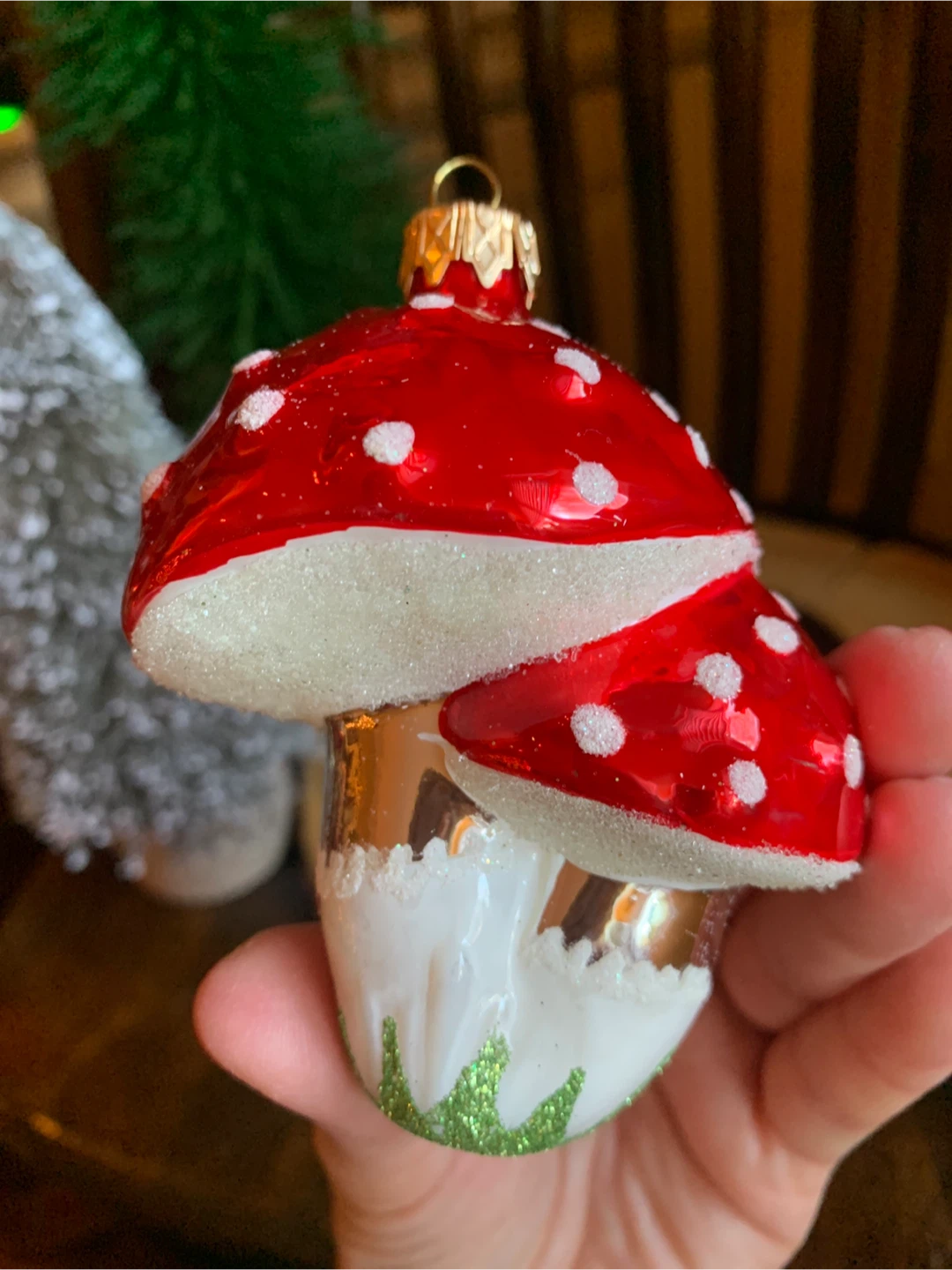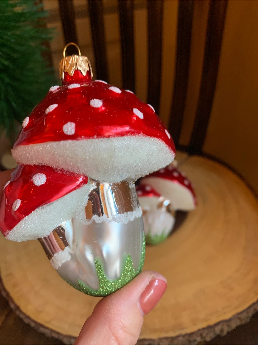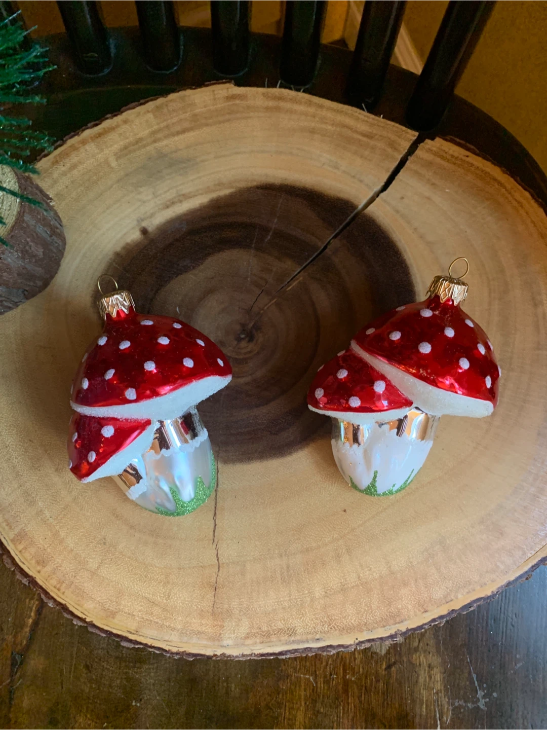 Selling a pair of new cute mushroom Christmas ornaments in great condition! They are hand painted in Poland with red and white polka dots and a silver base with green glitter accents. They come in a protective box, was a set of three but one broke in storage. They are 4” long. Perfect for adding a bit of whimsy to your tree this year!