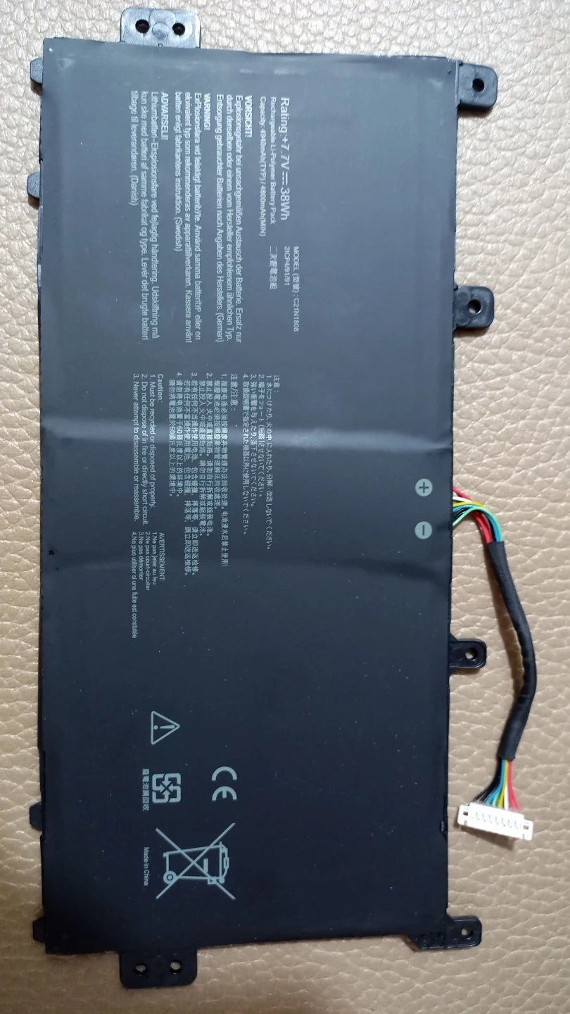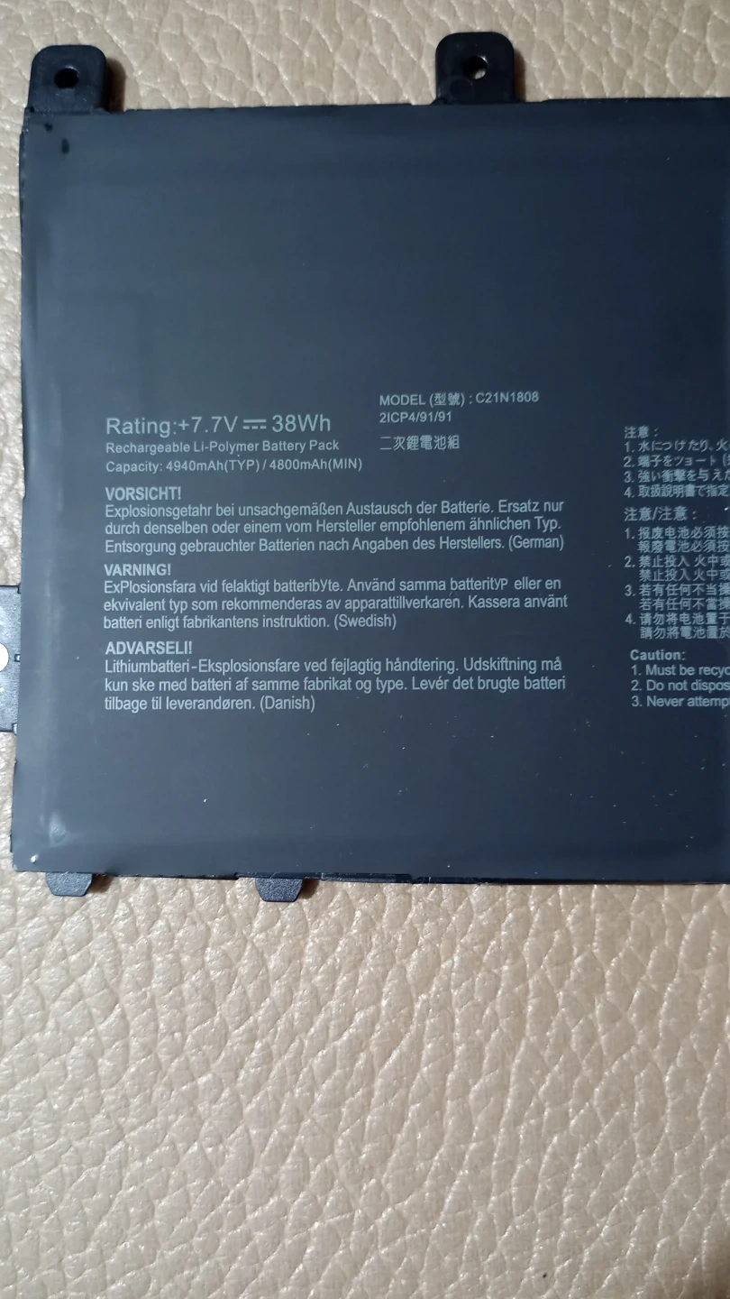 ASUS C21N1808 laptop battery. It's a rechargeable Li-Polymer battery pack with a rating of +7.7V and 38Wh. The capacity is 4940mAh (TYP) / 4800mAh (MIN).