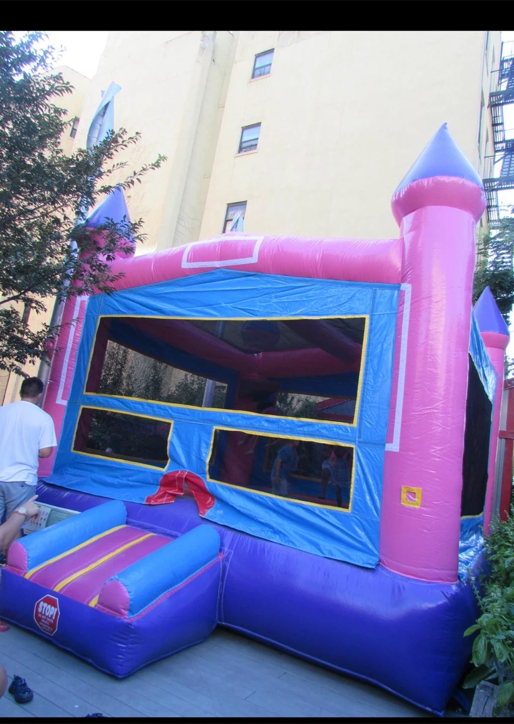 This is a fun inflatable bounce house, perfect for kids' parties and events! It features a pink and blue color scheme with mesh windows for visibility. The bounce house also includes an inflatable slide and a 'STOP!' sign on the entrance platform.