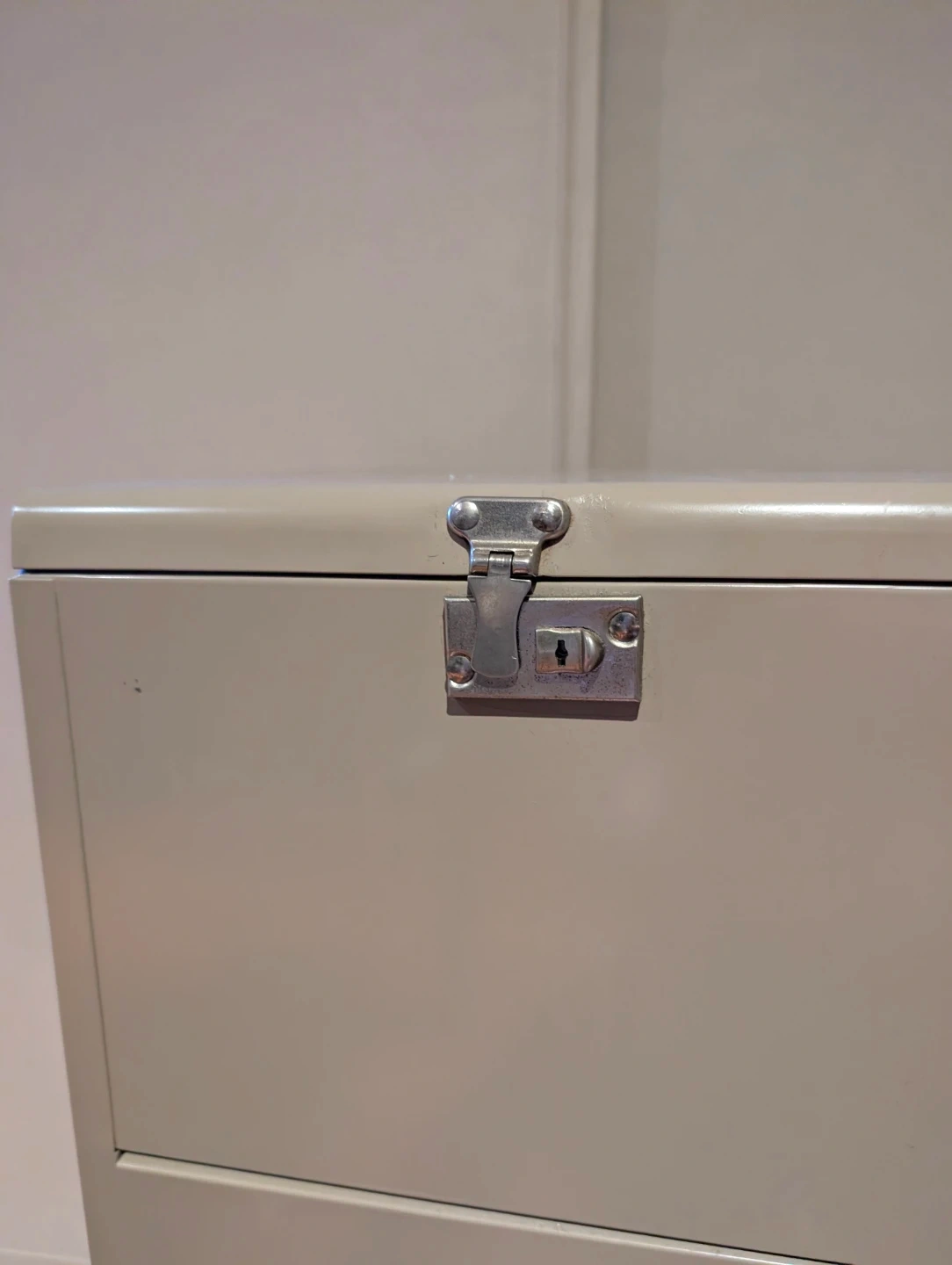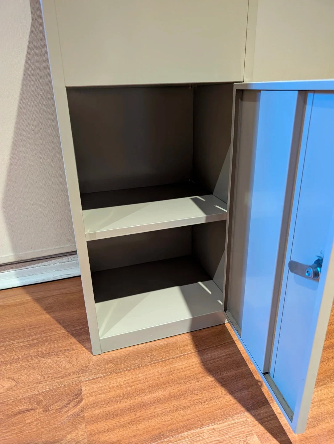 Good condition metal filing cabinet. Top compartment with two sections. Front compartment with two shelves. Top key missing (does not lock). Front door key included. Beige colour.