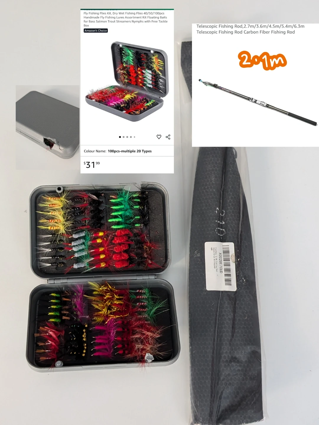 Selling a fly fishing flies kit with assorted lures and a telescopic fishing rod. The kit includes dry and wet fishing flies, suitable for bass, salmon, and trout. Also included is a telescopic fishing rod made of carbon fiber.