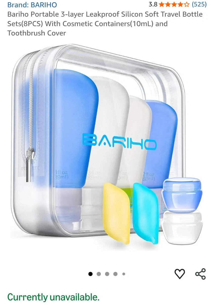 I'm selling a new BARIHO portable 3-layer leakproof silicone soft travel bottle set. It comes with cosmetic containers (10ml) and a toothbrush cover. Perfect for travel!