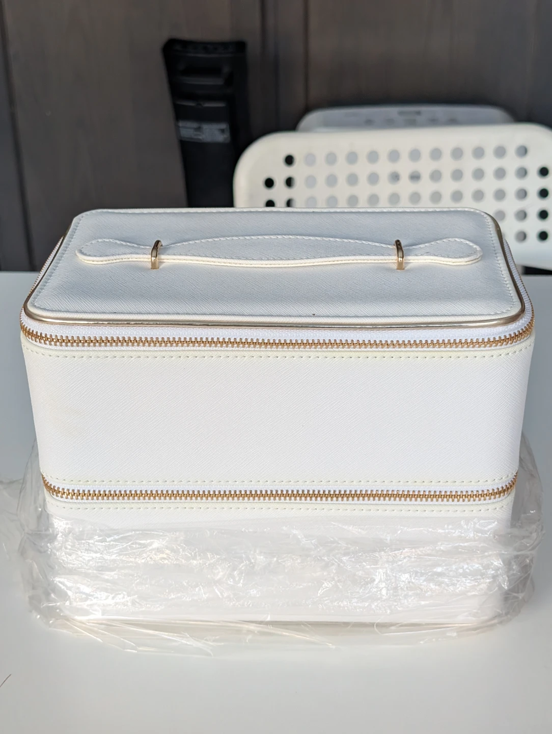 Selling a brand new white cosmetic travel case! It has a handle and gold zippers, perfect for keeping your makeup organized on the go